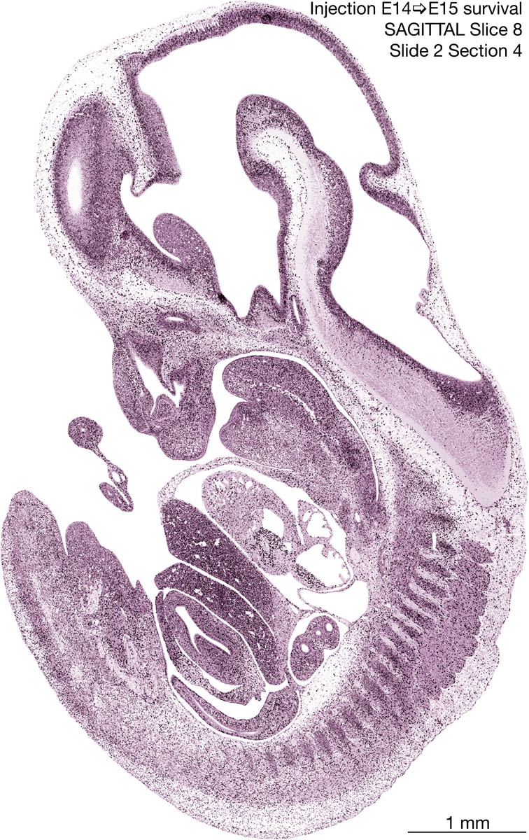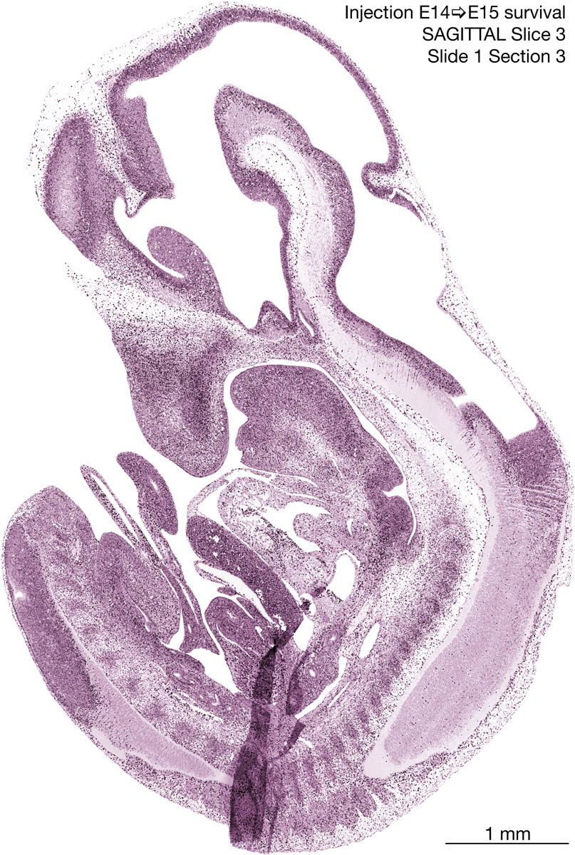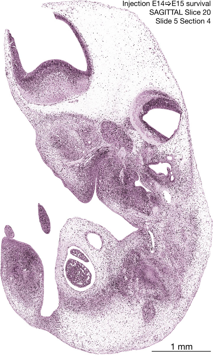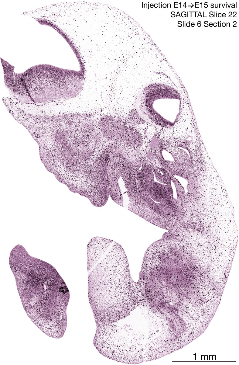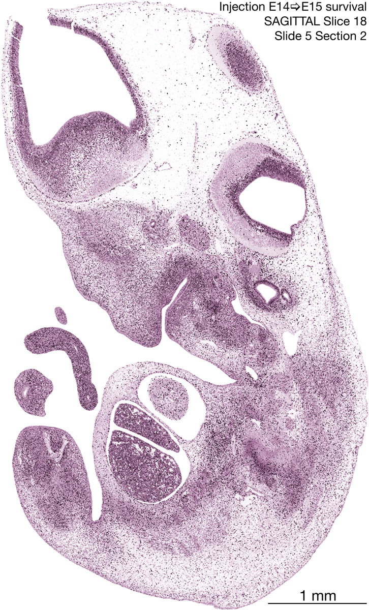The following images are from a sagittally-sectioned specimen of an E15 rat embryo exposed to tritiated thymidine on E14–24 hr survival. Note the heavily-labeled cells just outside the germinal zones in the brain and spinal cord, while the germinal zones themselves contain more lightly-labeled cells. Many of the heavily-labeled cells are migrating postmitotic young neurons generated ON E14. Also note that more (compared to the E14 embryo) UNLABELED cells are now outside the germinal and migratory zones. Many of the cells here are settling neurons generated BEFORE E14–some were generated on E13, and even more have accumulated on E14. By E15, nearly every structure in the brain and spinal cord has young neurons settling in the parenchyma.