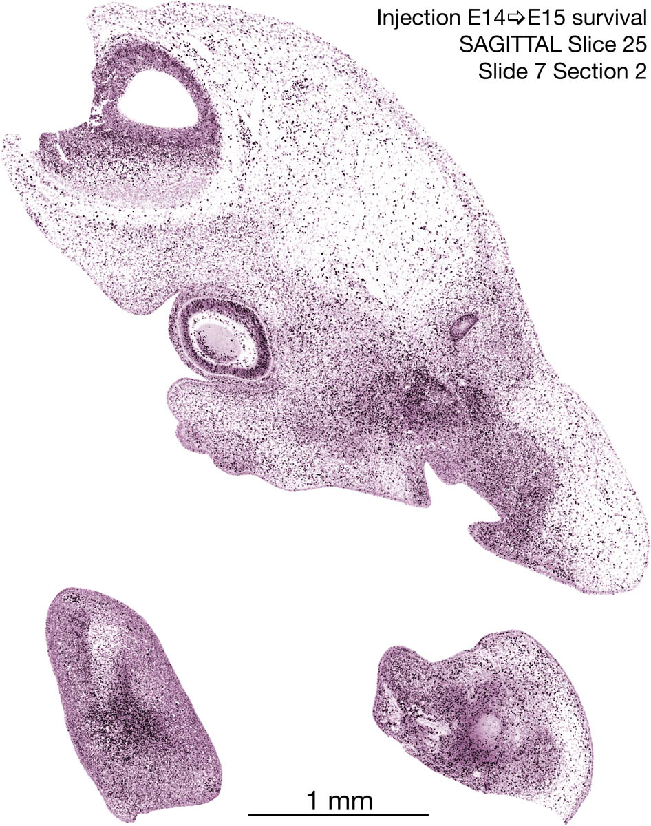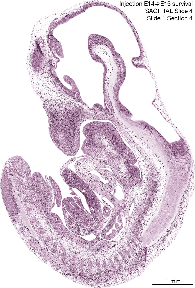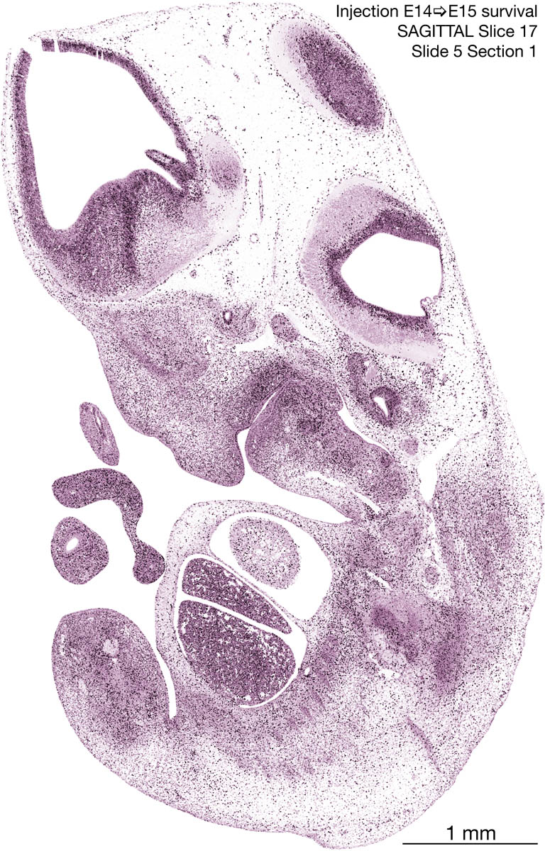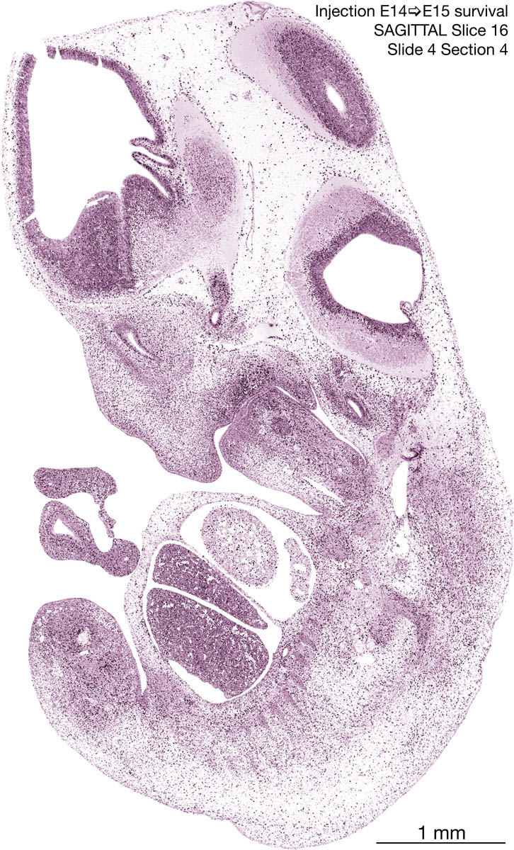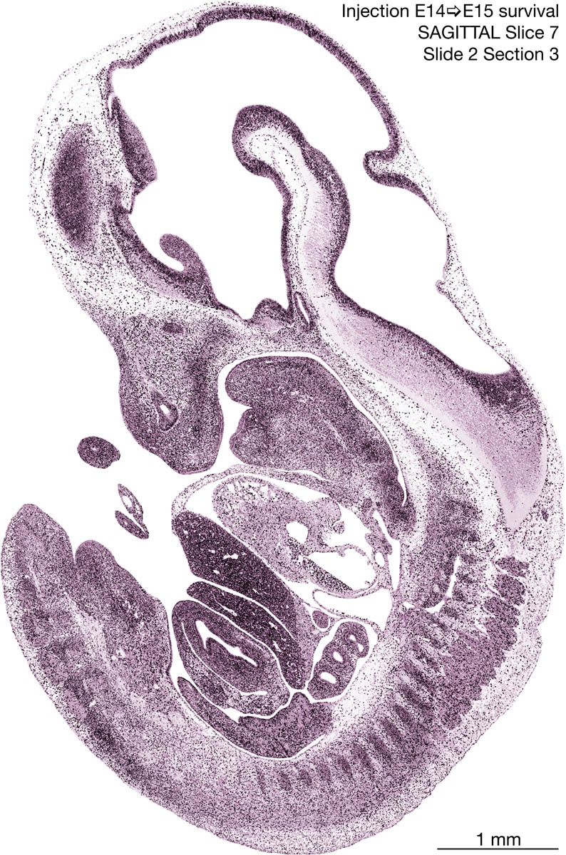 The following images are from a sagittally-sectioned specimen of an E15 rat embryo exposed to tritiated thymidine on E14–24 hr survival. Note the heavily-labeled cells just outside the germinal zones in the brain and spinal cord, while the germinal zones themselves contain more lightly-labeled cells. Many of the heavily-labeled cells are migrating postmitotic young neurons generated ON E14. Also note that more (compared to the E14 embryo) UNLABELED cells are now outside the germinal and migratory zones. Many of the cells here are settling neurons generated BEFORE E14–some were generated on E13, and even more have accumulated on E14. By E15, nearly every structure in the brain and spinal cord has young neurons settling in the parenchyma.