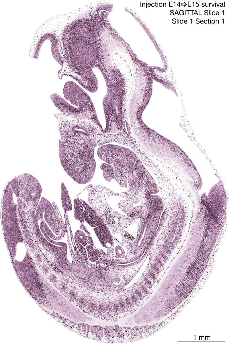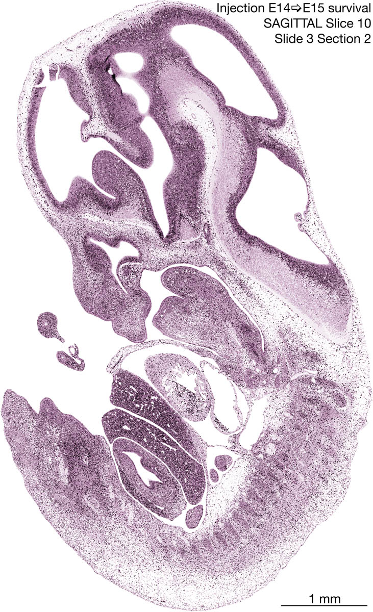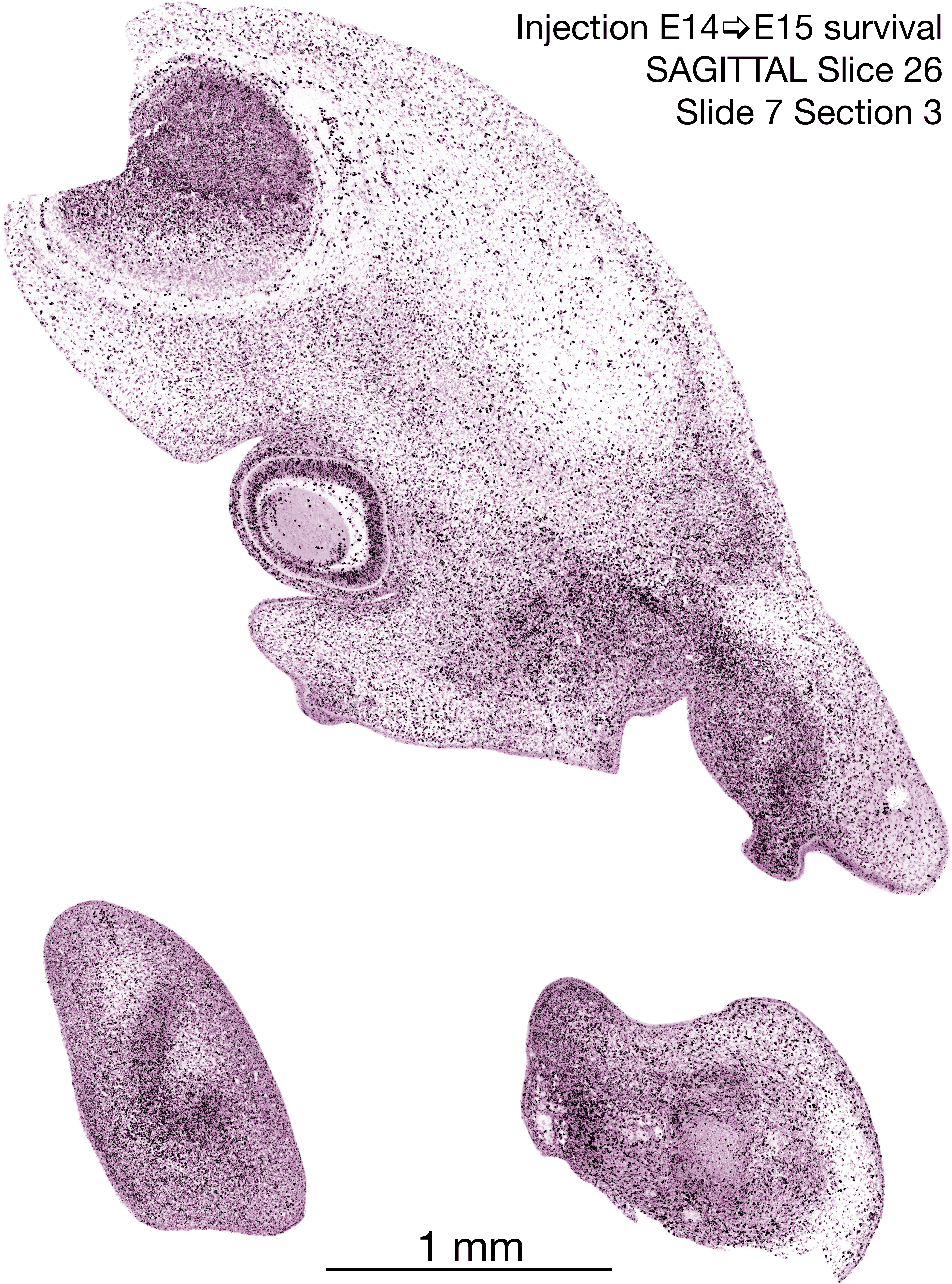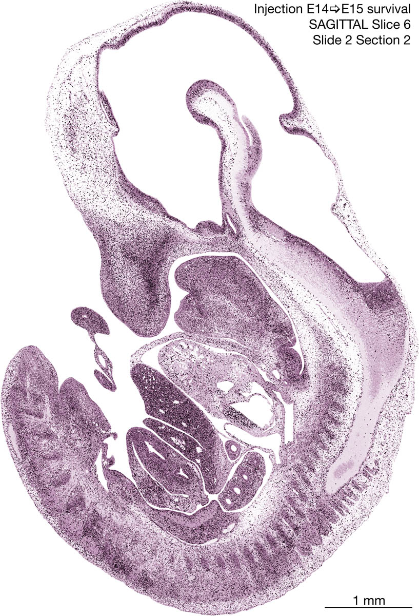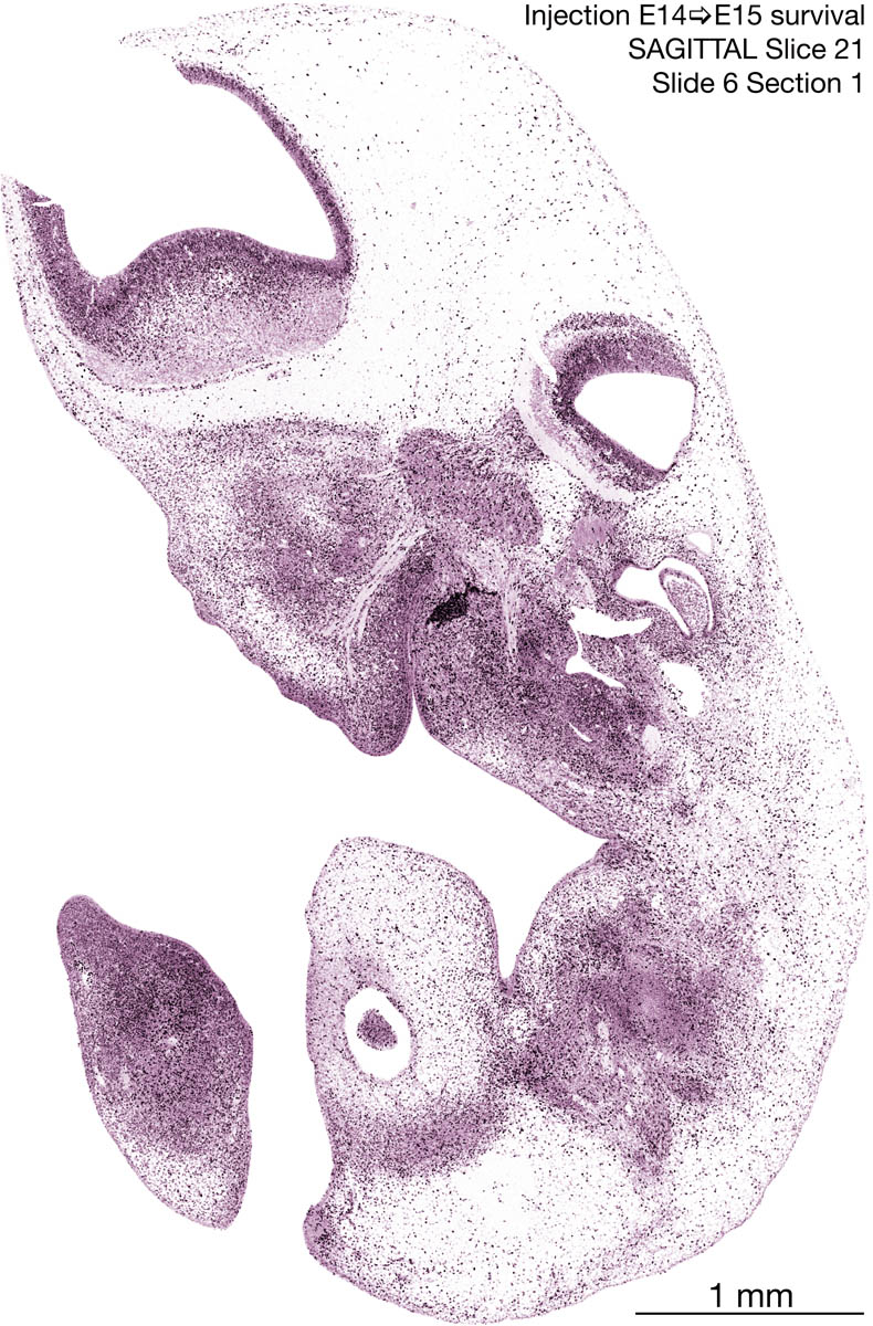The following images are from a sagittally-sectioned specimen of an E15 rat embryo exposed to tritiated thymidine on E14–24 hr survival. Note the heavily-labeled cells just outside the germinal zones in the brain and spinal cord, while the germinal zones themselves contain more lightly-labeled cells. Many of the heavily-labeled cells are migrating postmitotic young neurons generated ON E14. Also note that more (compared to the E14 embryo) UNLABELED cells are now outside the germinal and migratory zones. Many of the cells here are settling neurons generated BEFORE E14–some were generated on E13, and even more have accumulated on E14. By E15, nearly every structure in the brain and spinal cord has young neurons settling in the parenchyma.