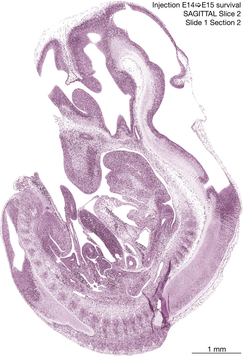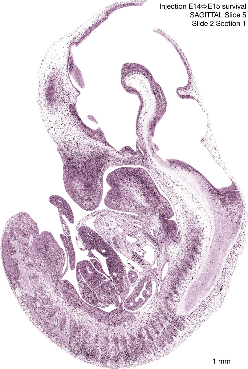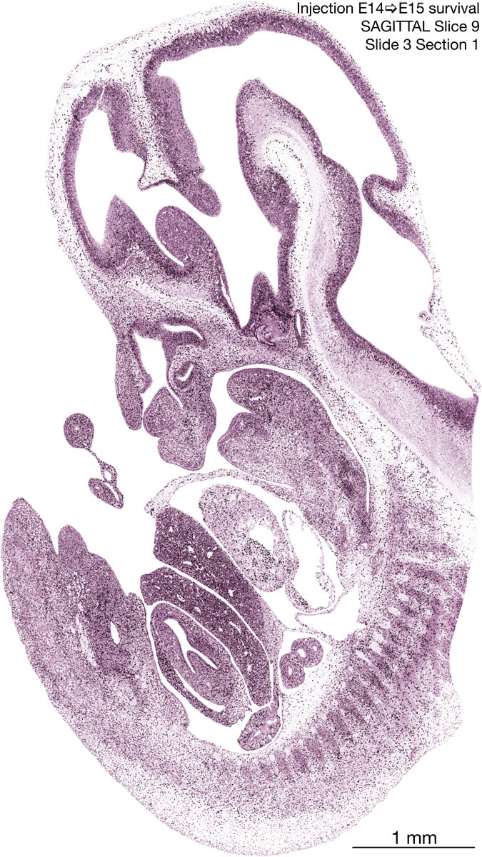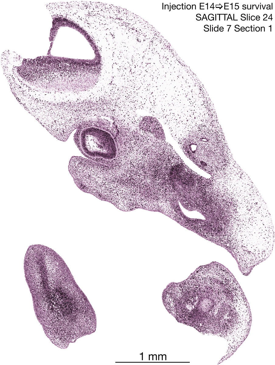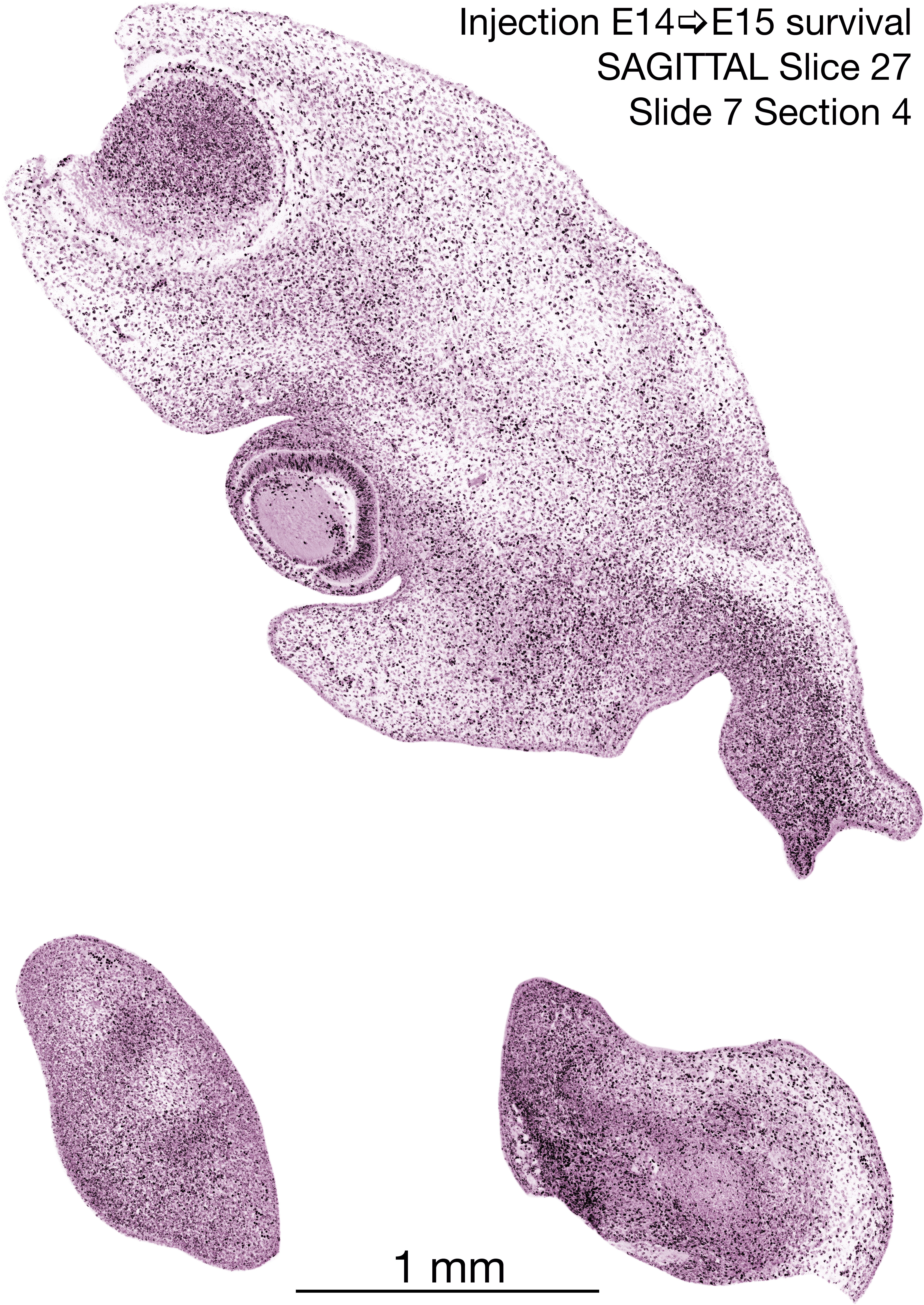 The following images are from a sagittally-sectioned specimen of an E15 rat embryo exposed to tritiated thymidine on E14–24 hr survival. Note the heavily-labeled cells just outside the germinal zones in the brain and spinal cord, while the germinal zones themselves contain more lightly-labeled cells. Many of the heavily-labeled cells are migrating postmitotic young neurons generated ON E14. Also note that more (compared to the E14 embryo) UNLABELED cells are now outside the germinal and migratory zones. Many of the cells here are settling neurons generated BEFORE E14–some were generated on E13, and even more have accumulated on E14. By E15, nearly every structure in the brain and spinal cord has young neurons settling in the parenchyma.