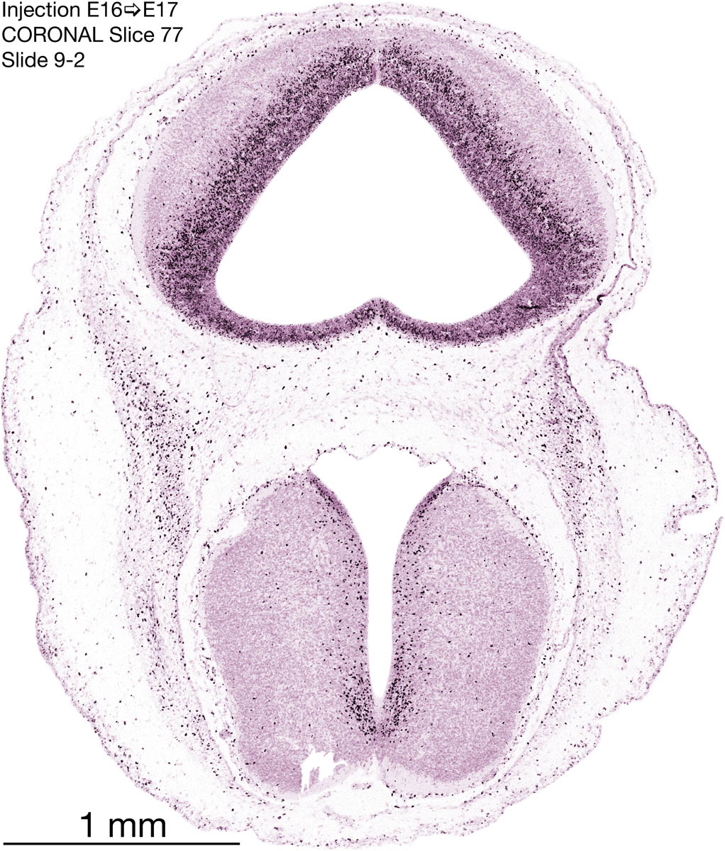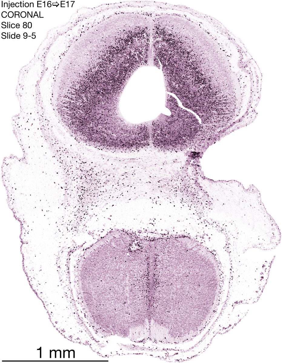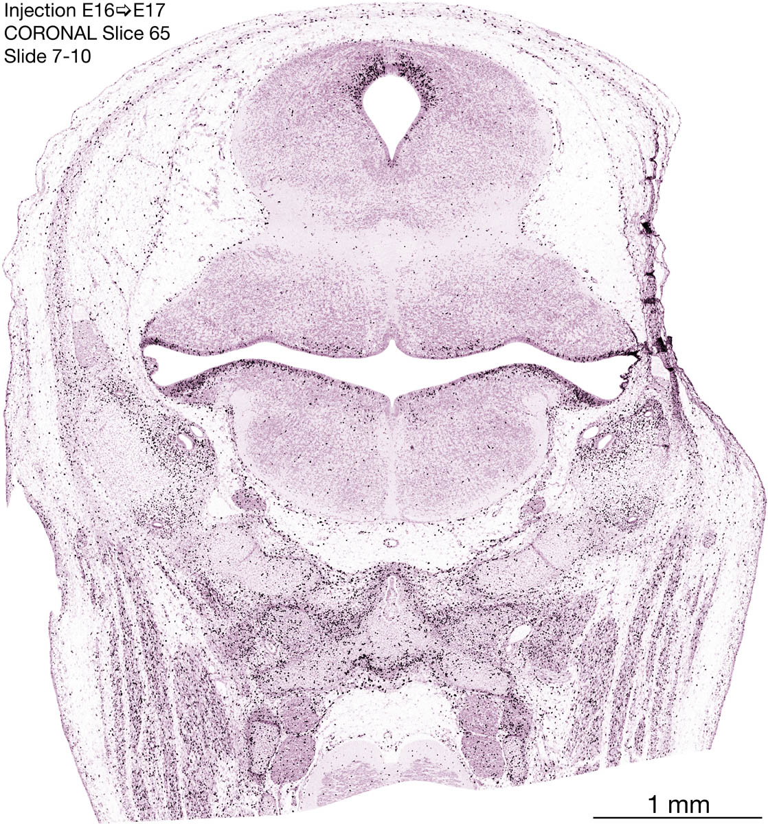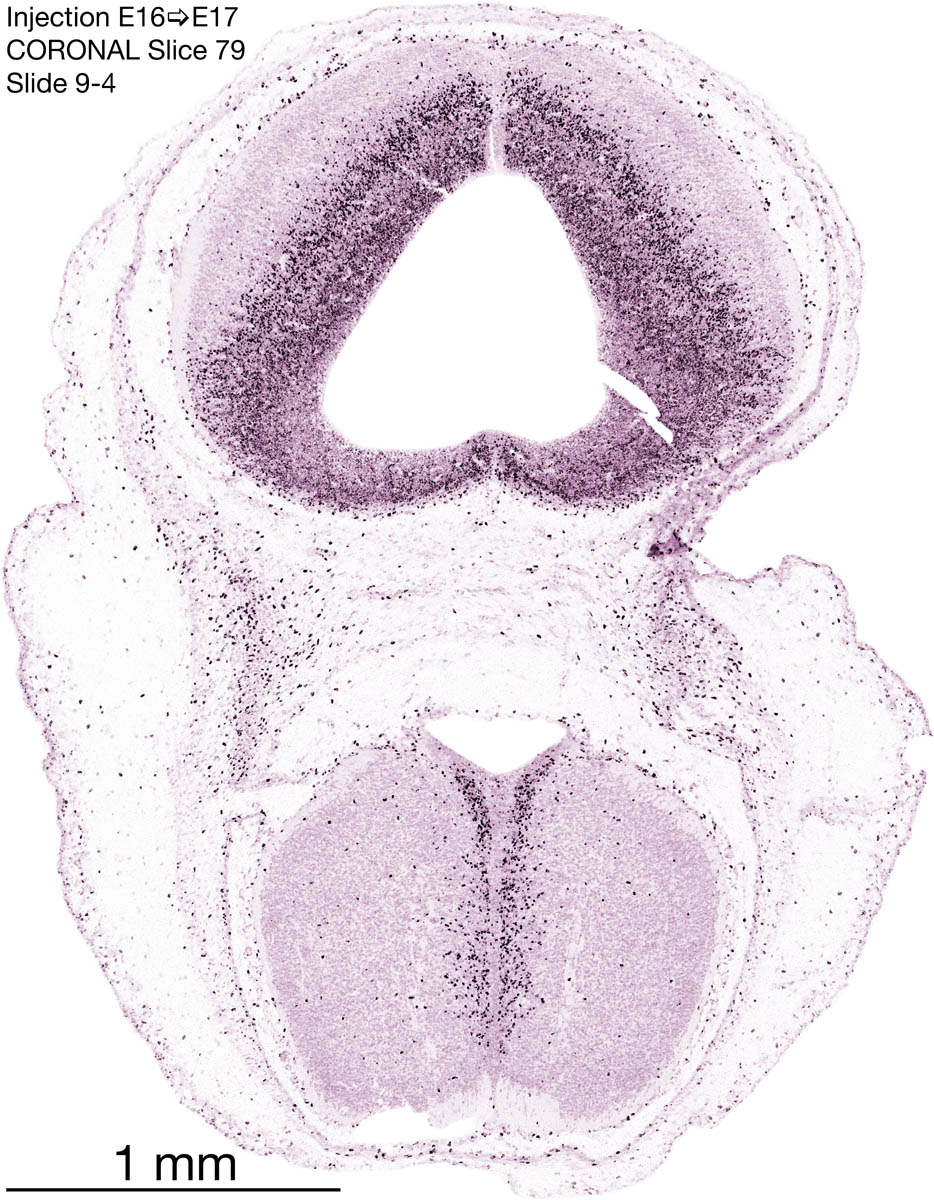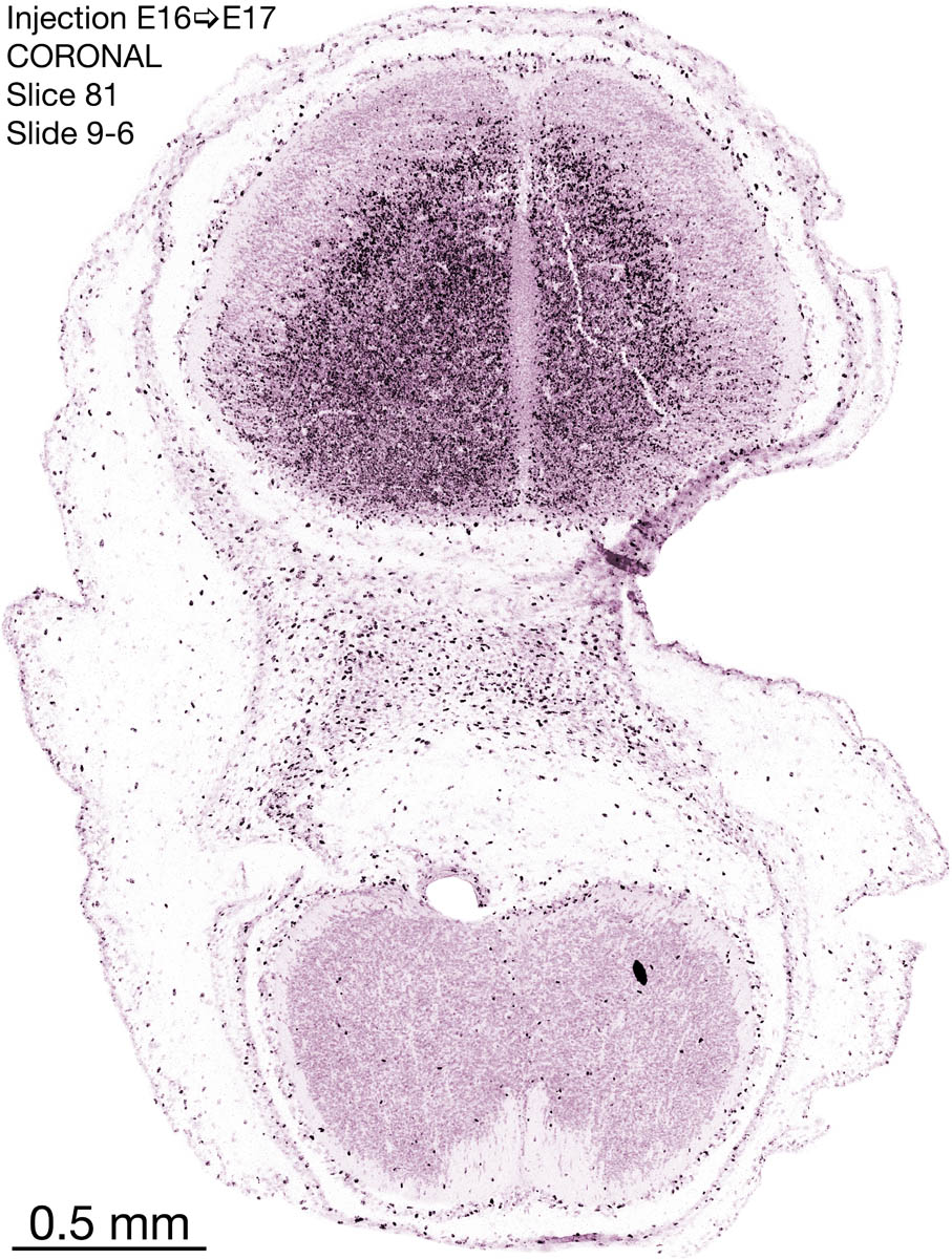 The following images are from a coronally-sectioned head of an E17 rat embryo exposed to tritiated thymidine on E16–24 hr survival. Note the heavily-labeled cells just outside the germinal zones, while the germinal zones themselves contain more lightly-labeled cells. Germinal zones in the brainstem continue to shrink and transform to an ependymal layer. The heavily-labeled migrating cells are postmitotic young neurons generated ON E16. By now, UNLABELED cells (generated before E16) take up most of the space outside the germinal and migratory zones. The pattern of heavily-labeled cells outside the cerebral cortex neuroepithelium deserves special mention. Notice that the labeled cells are in BANDS. We have postulated that these bands contain layer-specific neurons destined to settle in Layers V and VI in the mature cerebral cortex. We call this area the Stratified Transitional Field. See the neocortical development page in neurondevelopment.org for more information. The cerebellum now contains a prominent superficial band of labeled cells–the external germinal layer that will generate all short-axon neurons in the cerebellar cortex.