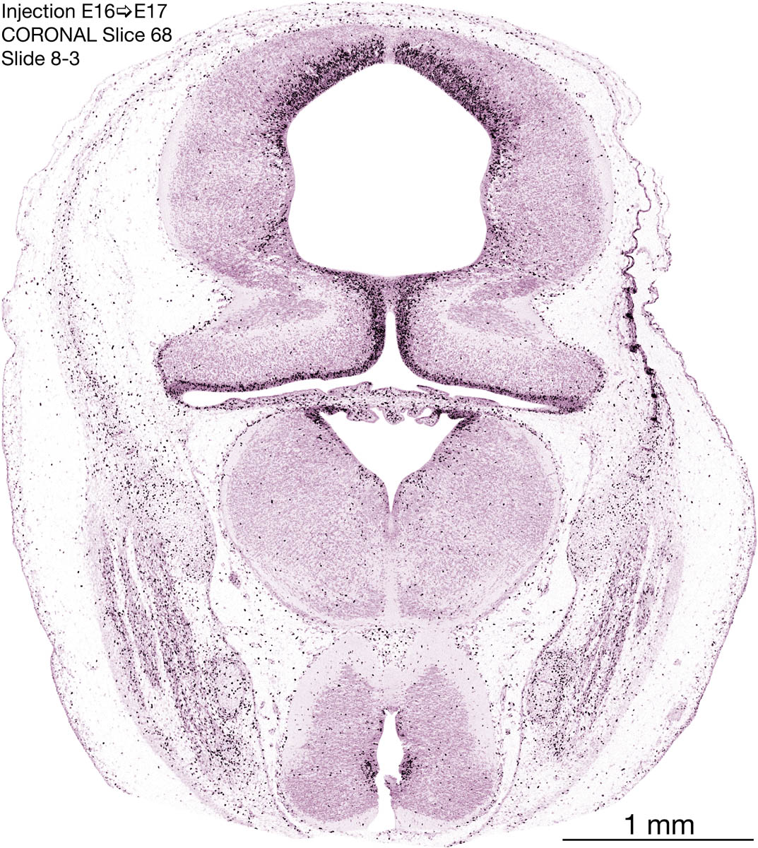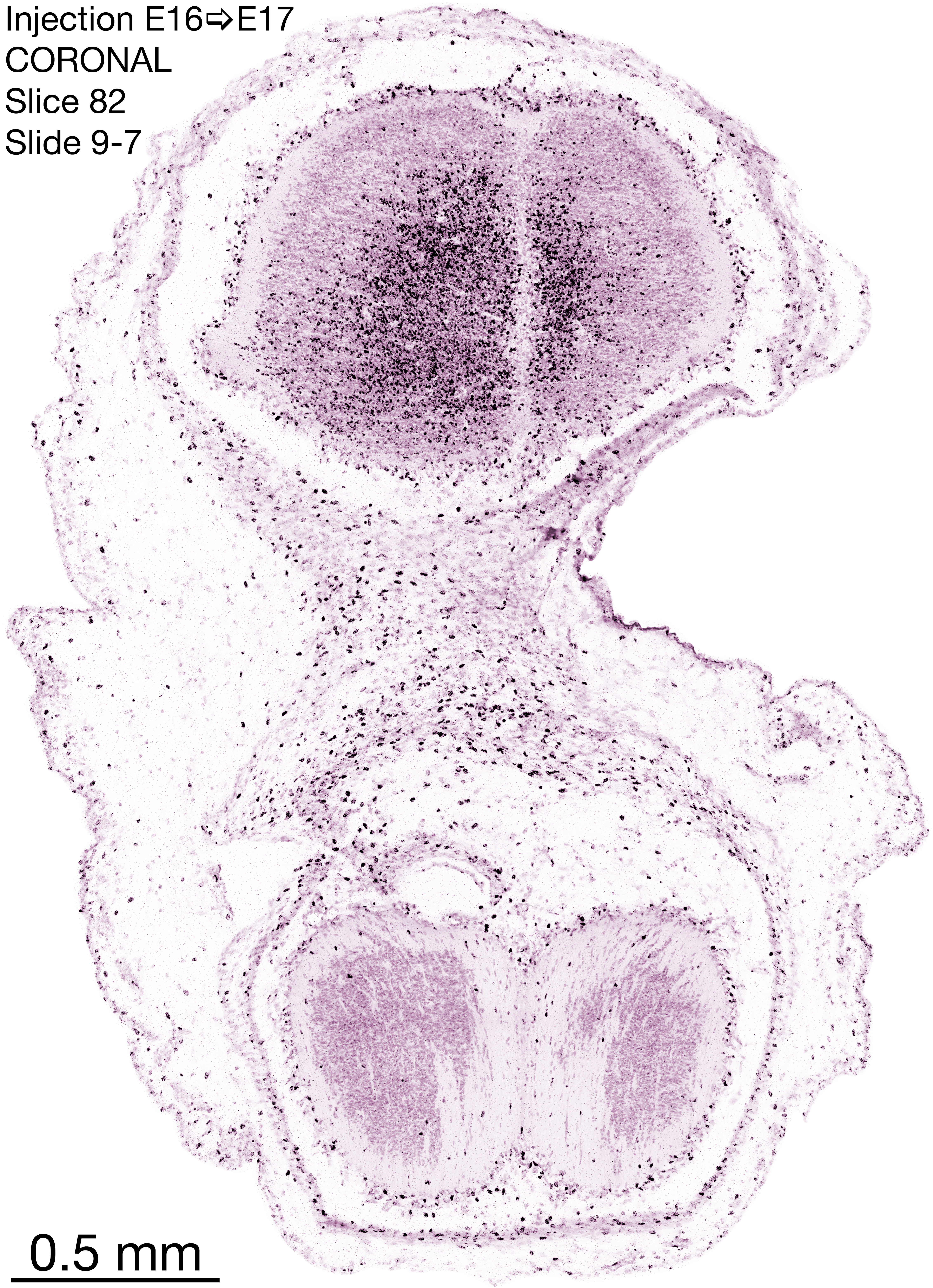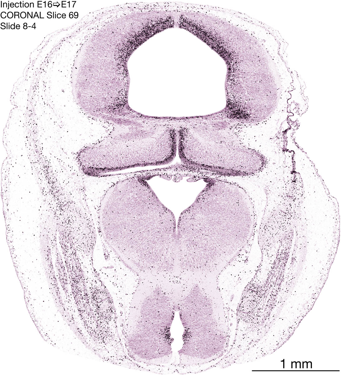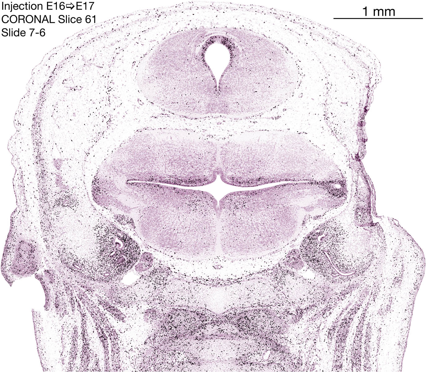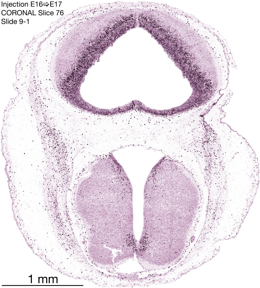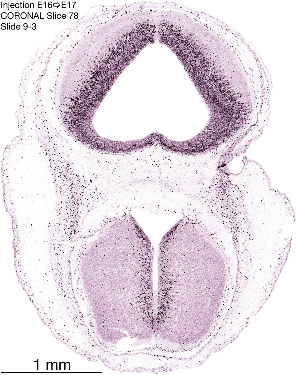 The following images are from a coronally-sectioned head of an E17 rat embryo exposed to tritiated thymidine on E16–24 hr survival. Note the heavily-labeled cells just outside the germinal zones, while the germinal zones themselves contain more lightly-labeled cells. Germinal zones in the brainstem continue to shrink and transform to an ependymal layer. The heavily-labeled migrating cells are postmitotic young neurons generated ON E16. By now, UNLABELED cells (generated before E16) take up most of the space outside the germinal and migratory zones. The pattern of heavily-labeled cells outside the cerebral cortex neuroepithelium deserves special mention. Notice that the labeled cells are in BANDS. We have postulated that these bands contain layer-specific neurons destined to settle in Layers V and VI in the mature cerebral cortex. We call this area the Stratified Transitional Field. See the neocortical development page in neurondevelopment.org for more information. The cerebellum now contains a prominent superficial band of labeled cells–the external germinal layer that will generate all short-axon neurons in the cerebellar cortex.