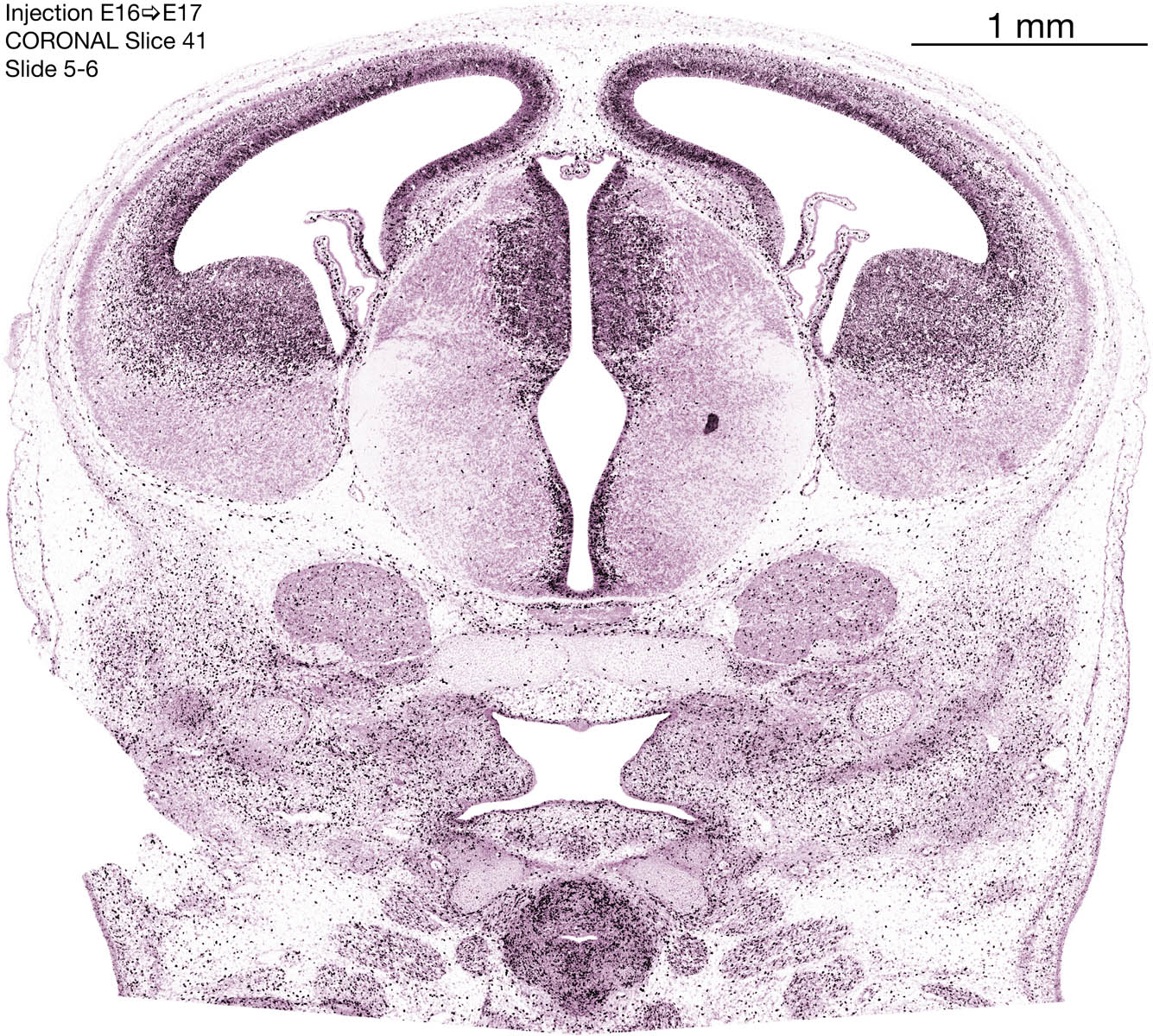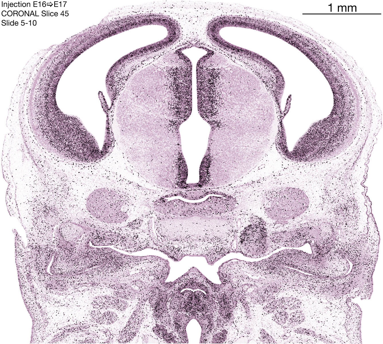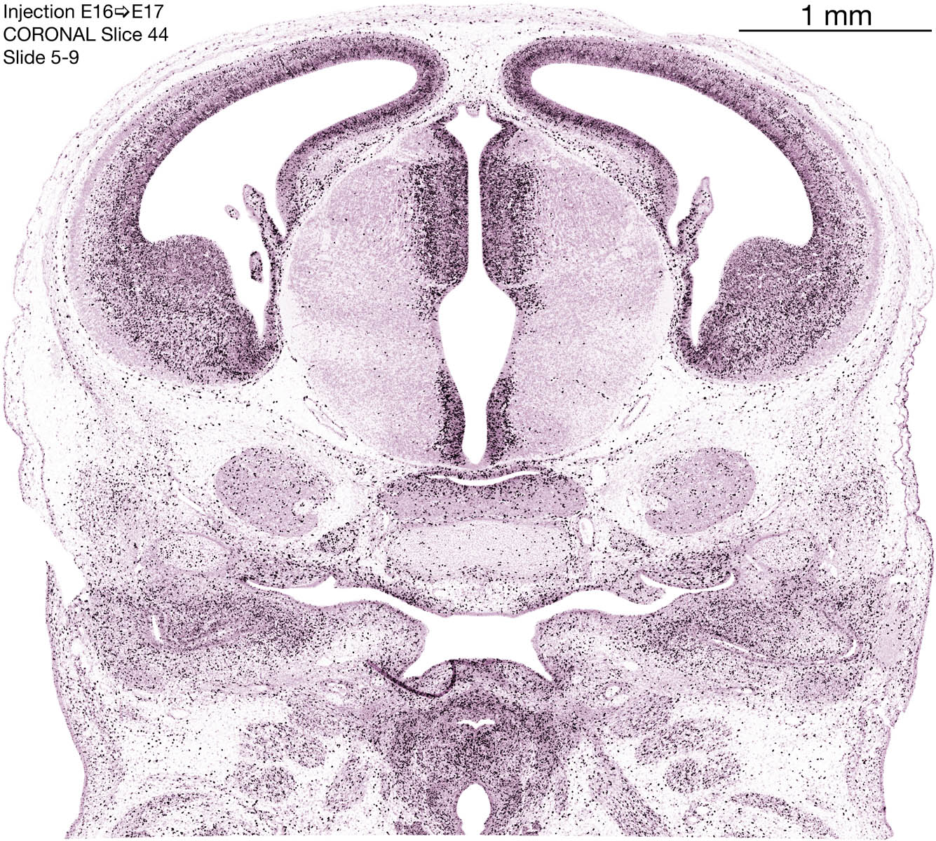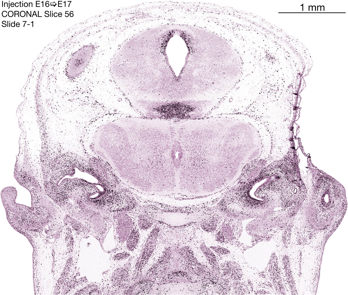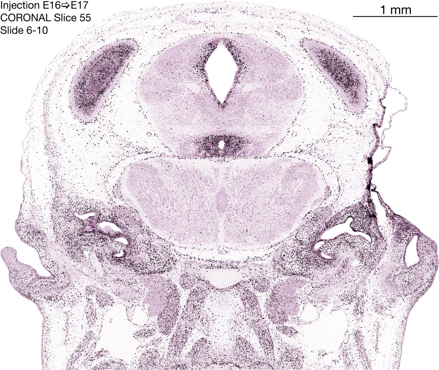 The following images are from a coronally-sectioned head of an E17 rat embryo exposed to tritiated thymidine on E16–24 hr survival. Note the heavily-labeled cells just outside the germinal zones, while the germinal zones themselves contain more lightly-labeled cells. Germinal zones in the brainstem continue to shrink and transform to an ependymal layer. The heavily-labeled migrating cells are postmitotic young neurons generated ON E16. By now, UNLABELED cells (generated before E16) take up most of the space outside the germinal and migratory zones. The pattern of heavily-labeled cells outside the cerebral cortex neuroepithelium deserves special mention. Notice that the labeled cells are in BANDS. We have postulated that these bands contain layer-specific neurons destined to settle in Layers V and VI in the mature cerebral cortex. We call this area the Stratified Transitional Field. See the neocortical development page in neurondevelopment.org for more information. The cerebellum now contains a prominent superficial band of labeled cells–the external germinal layer that will generate all short-axon neurons in the cerebellar cortex.