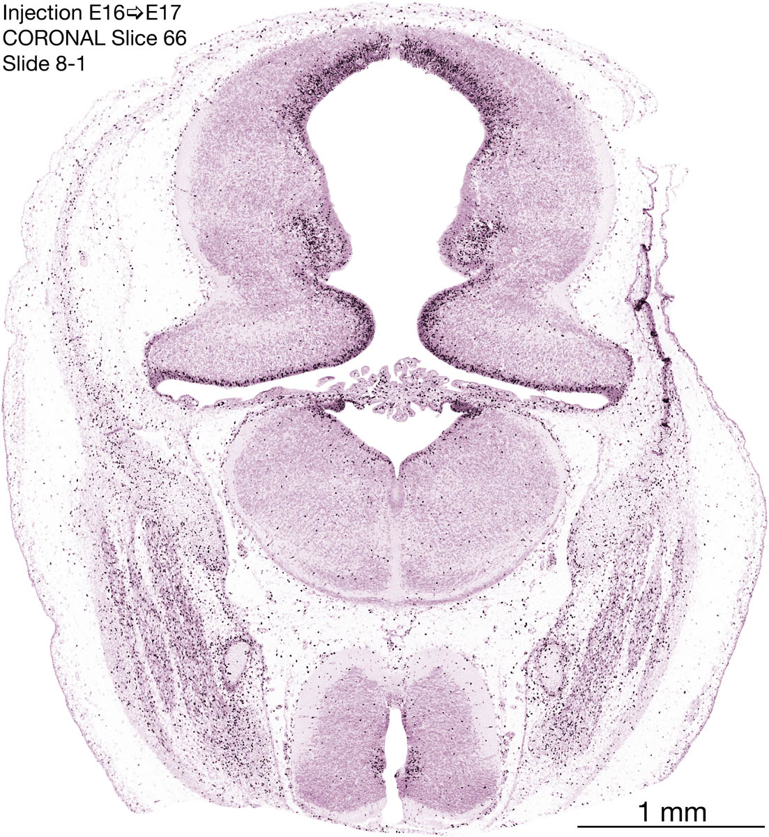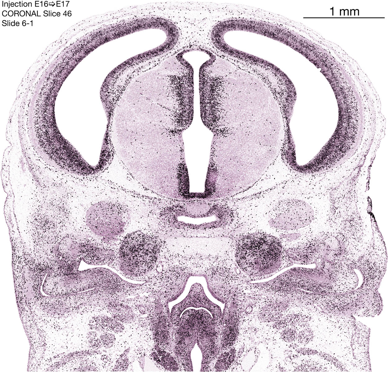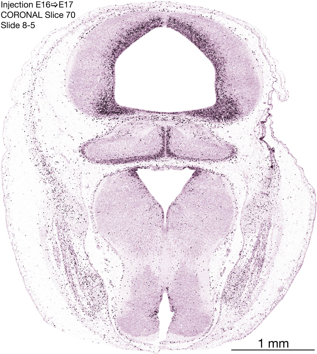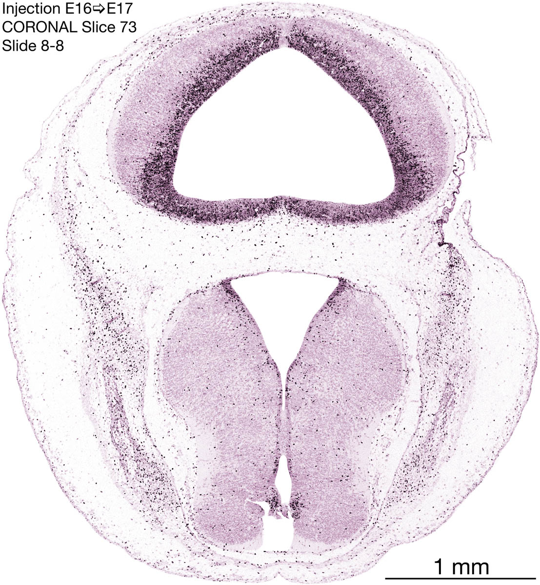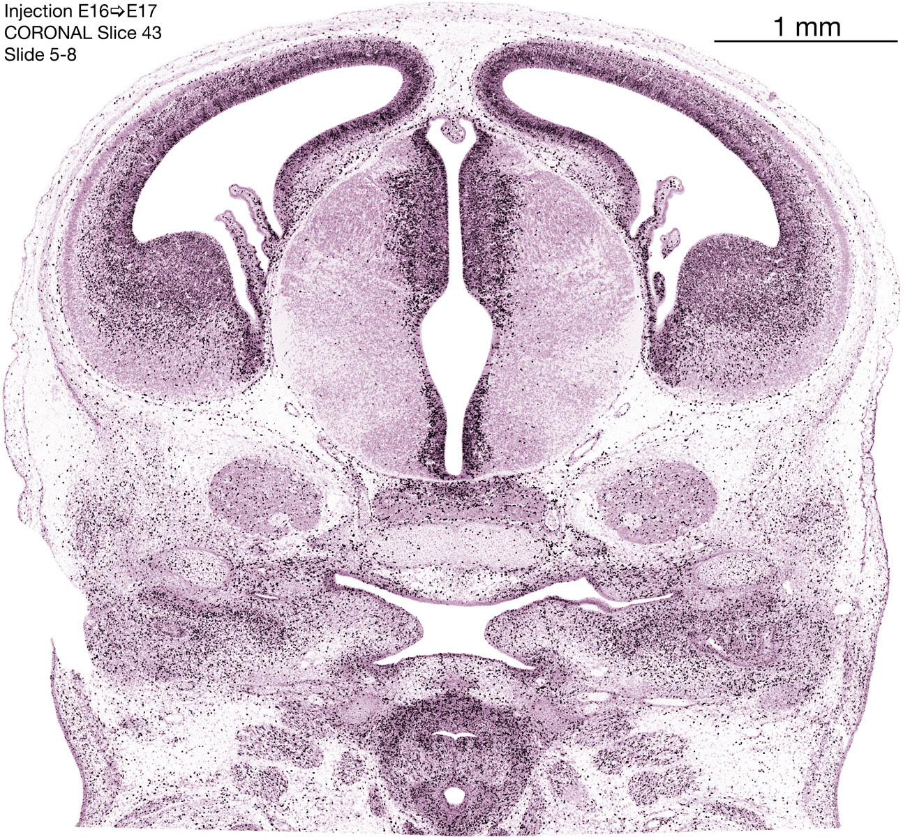 The following images are from a coronally-sectioned head of an E17 rat embryo exposed to tritiated thymidine on E16–24 hr survival. Note the heavily-labeled cells just outside the germinal zones, while the germinal zones themselves contain more lightly-labeled cells. Germinal zones in the brainstem continue to shrink and transform to an ependymal layer. The heavily-labeled migrating cells are postmitotic young neurons generated ON E16. By now, UNLABELED cells (generated before E16) take up most of the space outside the germinal and migratory zones. The pattern of heavily-labeled cells outside the cerebral cortex neuroepithelium deserves special mention. Notice that the labeled cells are in BANDS. We have postulated that these bands contain layer-specific neurons destined to settle in Layers V and VI in the mature cerebral cortex. We call this area the Stratified Transitional Field. See the neocortical development page in neurondevelopment.org for more information. The cerebellum now contains a prominent superficial band of labeled cells–the external germinal layer that will generate all short-axon neurons in the cerebellar cortex.