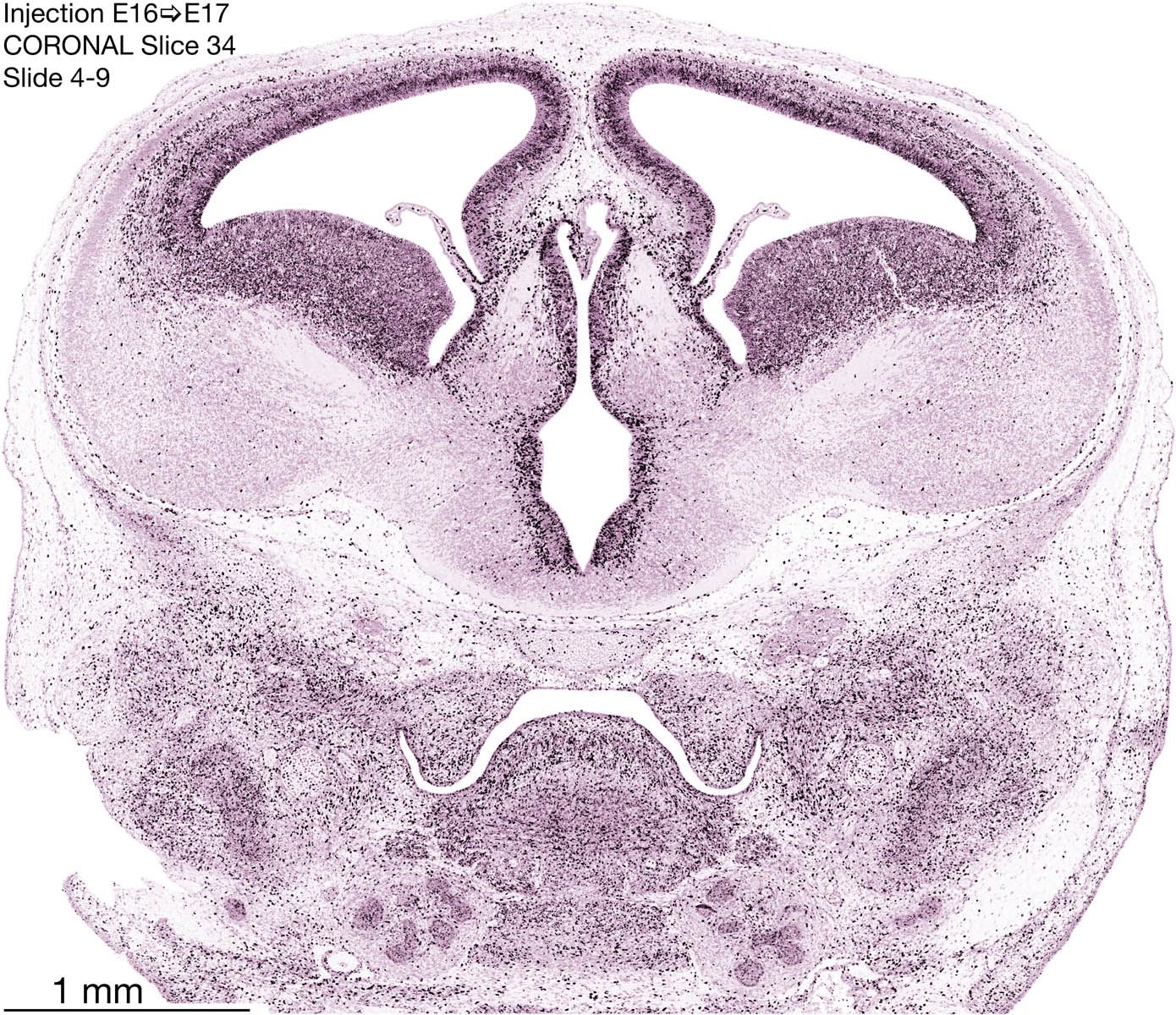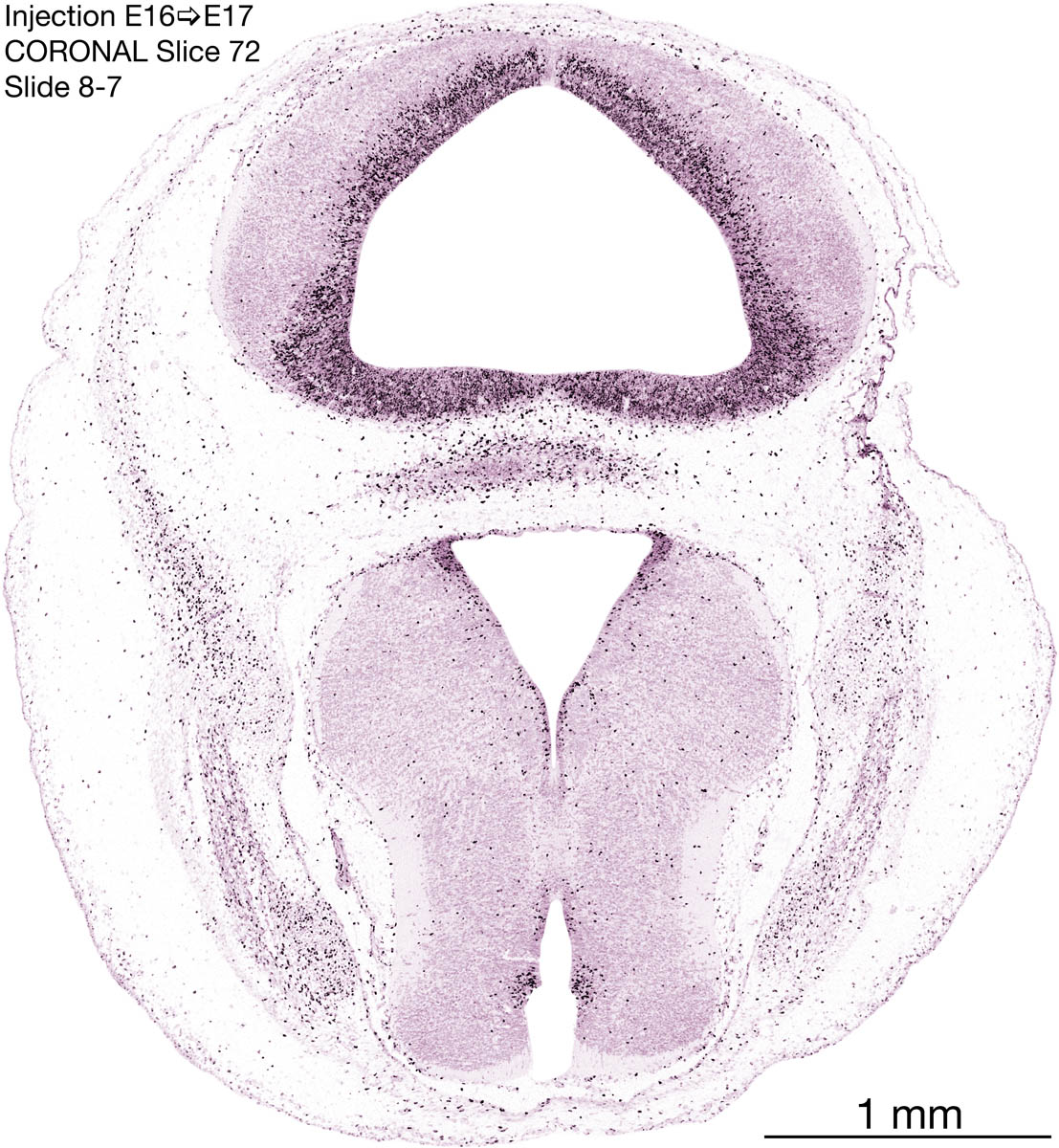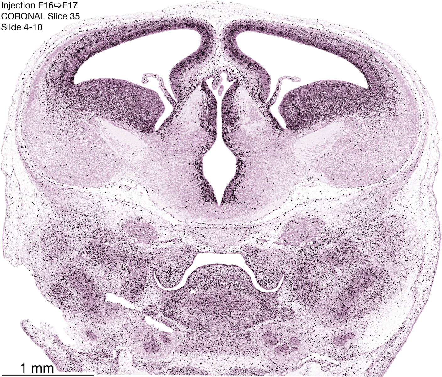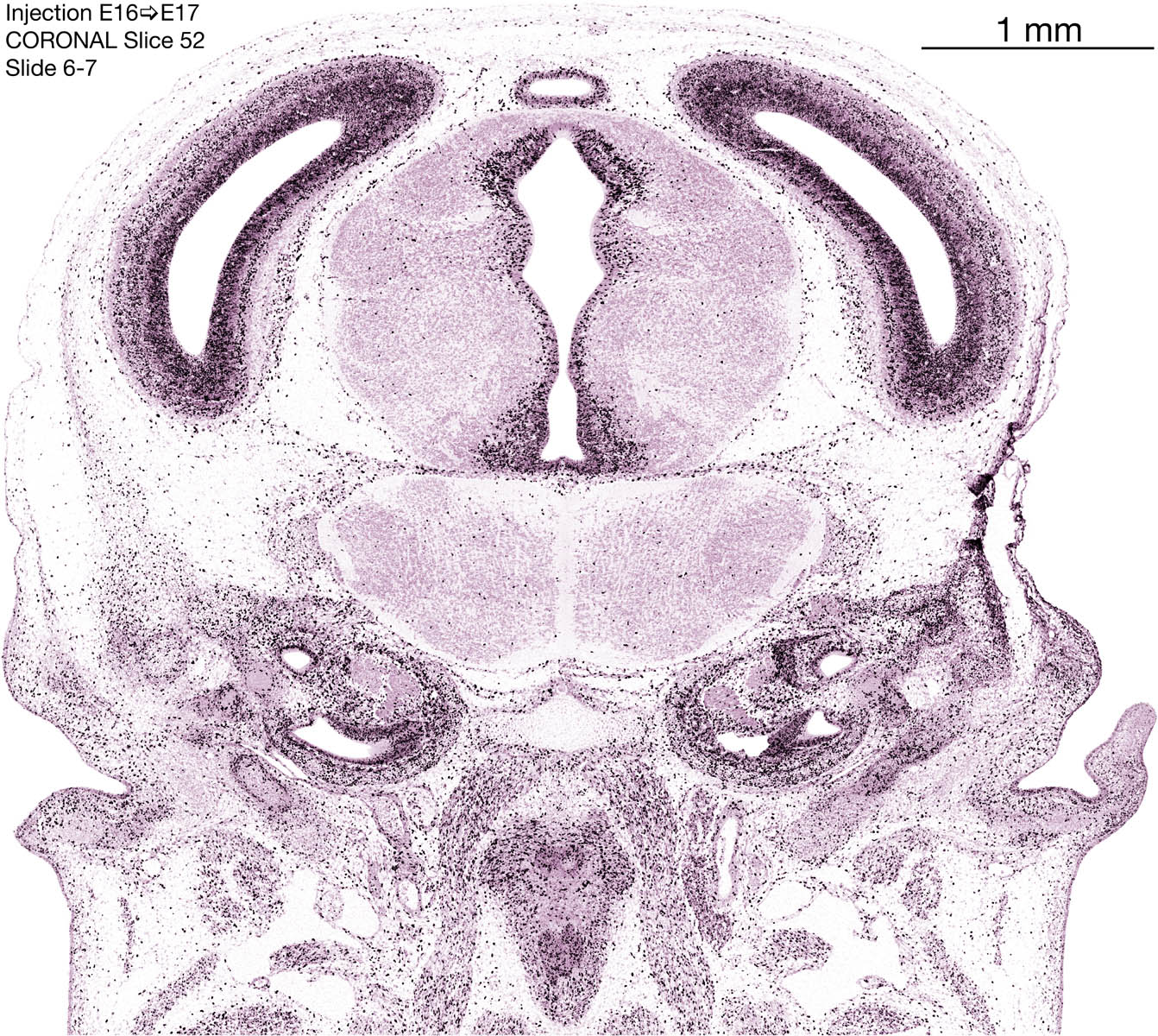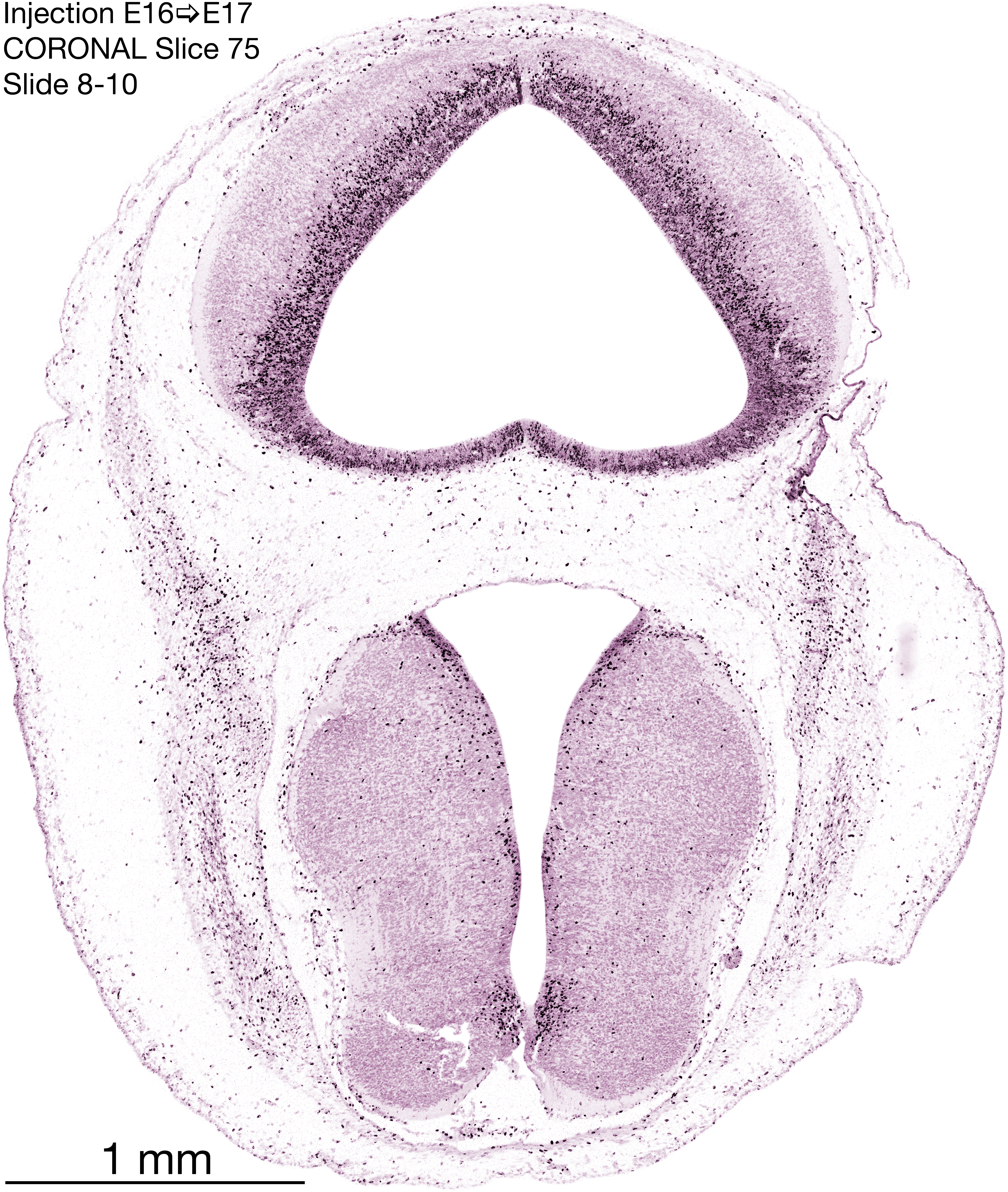 The following images are from a coronally-sectioned head of an E17 rat embryo exposed to tritiated thymidine on E16–24 hr survival. Note the heavily-labeled cells just outside the germinal zones, while the germinal zones themselves contain more lightly-labeled cells. Germinal zones in the brainstem continue to shrink and transform to an ependymal layer. The heavily-labeled migrating cells are postmitotic young neurons generated ON E16. By now, UNLABELED cells (generated before E16) take up most of the space outside the germinal and migratory zones. The pattern of heavily-labeled cells outside the cerebral cortex neuroepithelium deserves special mention. Notice that the labeled cells are in BANDS. We have postulated that these bands contain layer-specific neurons destined to settle in Layers V and VI in the mature cerebral cortex. We call this area the Stratified Transitional Field. See the neocortical development page in neurondevelopment.org for more information. The cerebellum now contains a prominent superficial band of labeled cells–the external germinal layer that will generate all short-axon neurons in the cerebellar cortex.