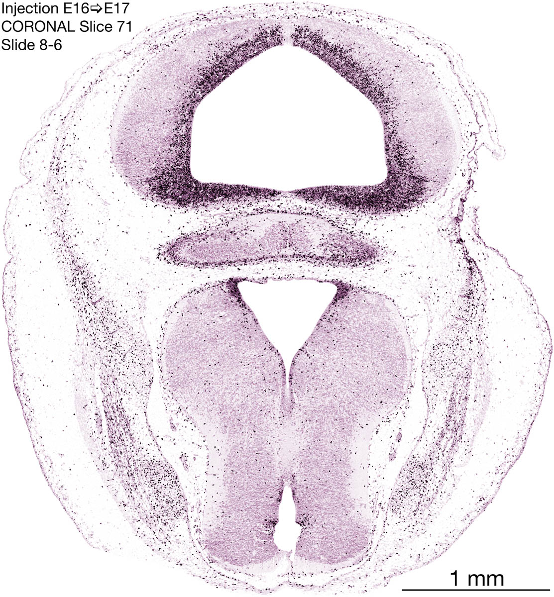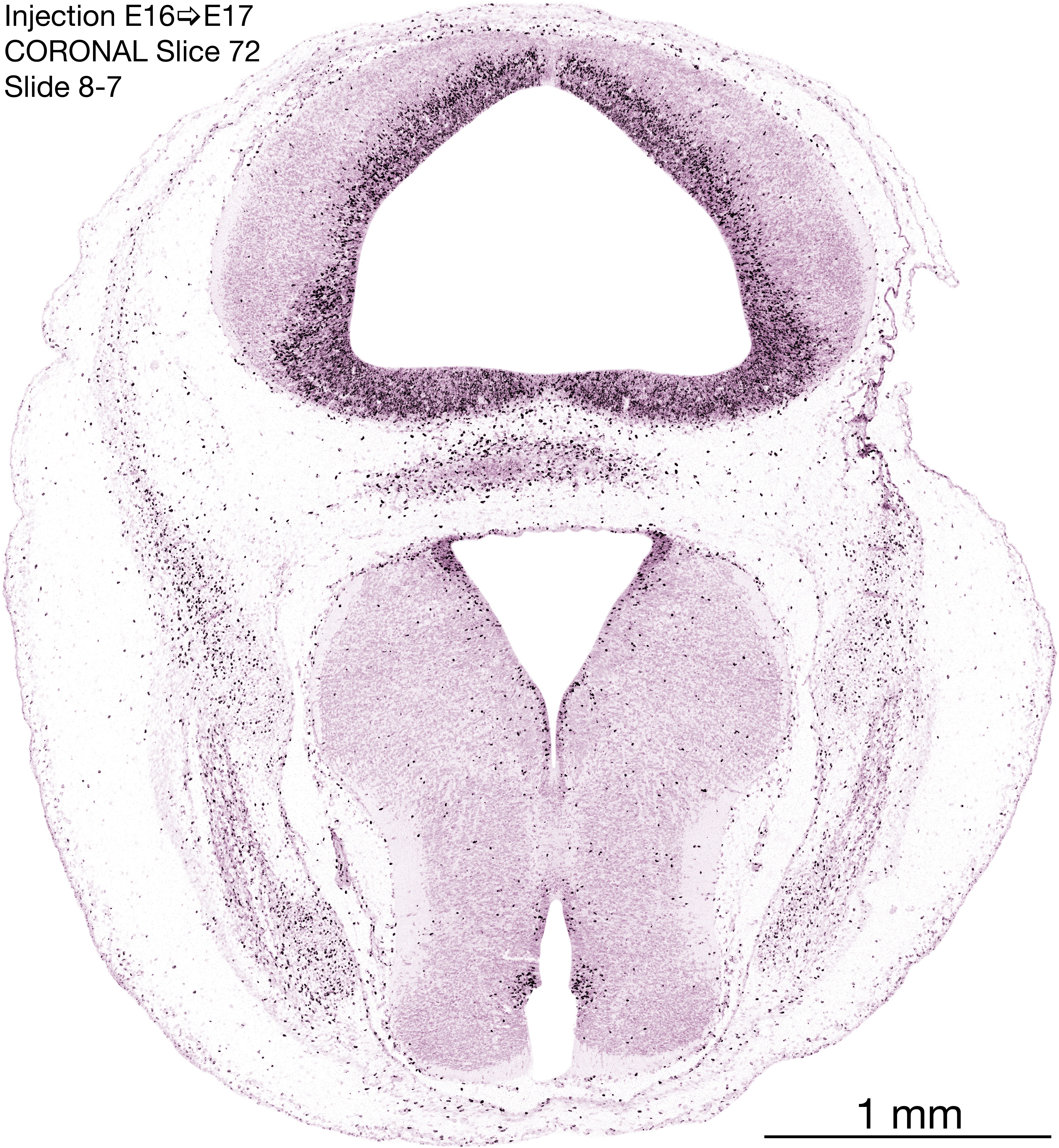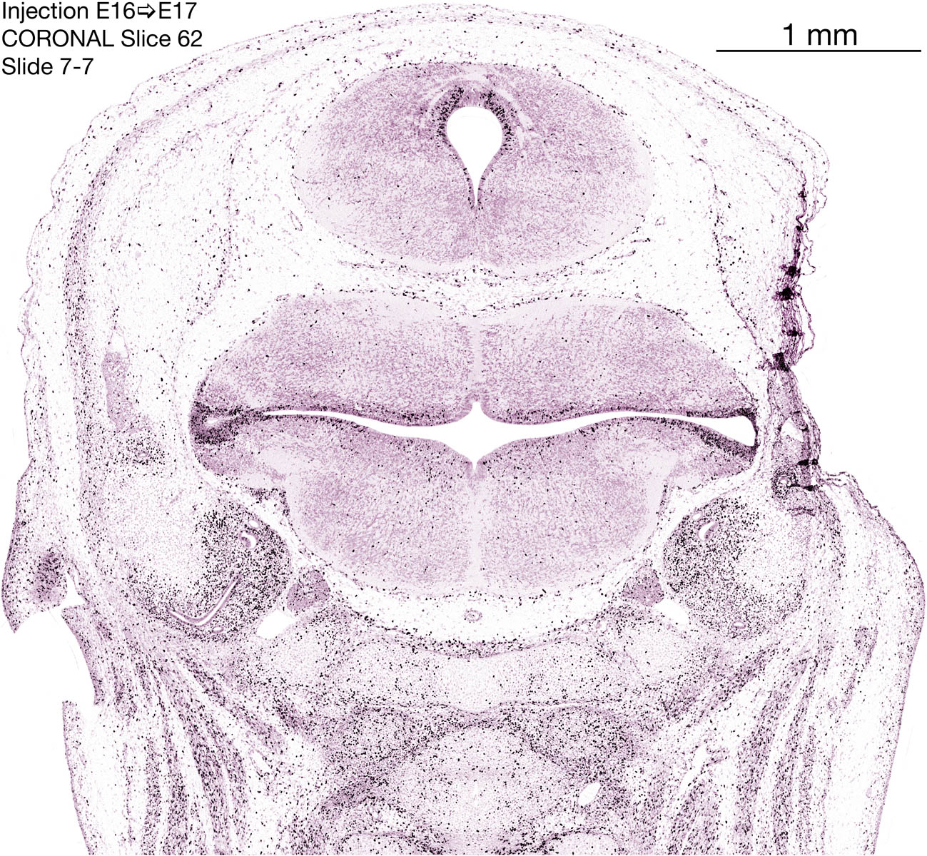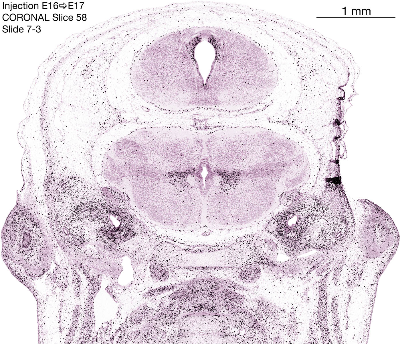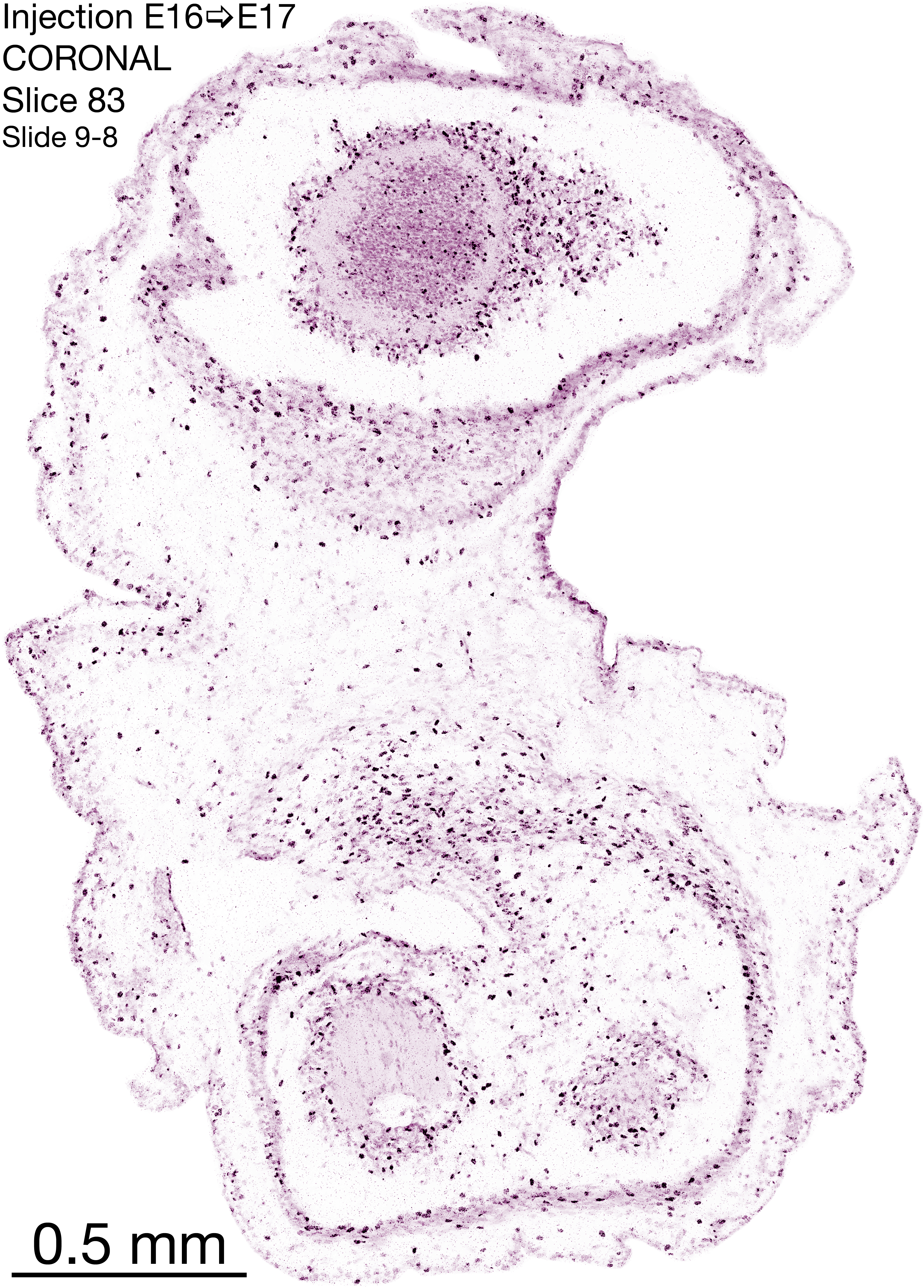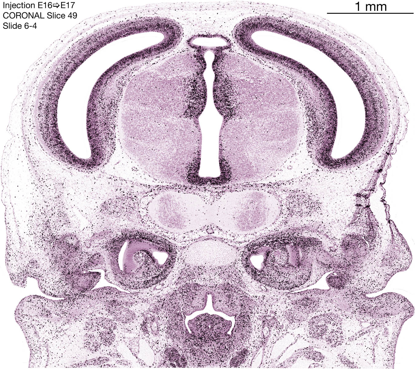The following images are from a coronally-sectioned head of an E17 rat embryo exposed to tritiated thymidine on E16–24 hr survival. Note the heavily-labeled cells just outside the germinal zones, while the germinal zones themselves contain more lightly-labeled cells. Germinal zones in the brainstem continue to shrink and transform to an ependymal layer. The heavily-labeled migrating cells are postmitotic young neurons generated ON E16. By now, UNLABELED cells (generated before E16) take up most of the space outside the germinal and migratory zones. The pattern of heavily-labeled cells outside the cerebral cortex neuroepithelium deserves special mention. Notice that the labeled cells are in BANDS. We have postulated that these bands contain layer-specific neurons destined to settle in Layers V and VI in the mature cerebral cortex. We call this area the Stratified Transitional Field. See the neocortical development page in neurondevelopment.org for more information. The cerebellum now contains a prominent superficial band of labeled cells–the external germinal layer that will generate all short-axon neurons in the cerebellar cortex.
