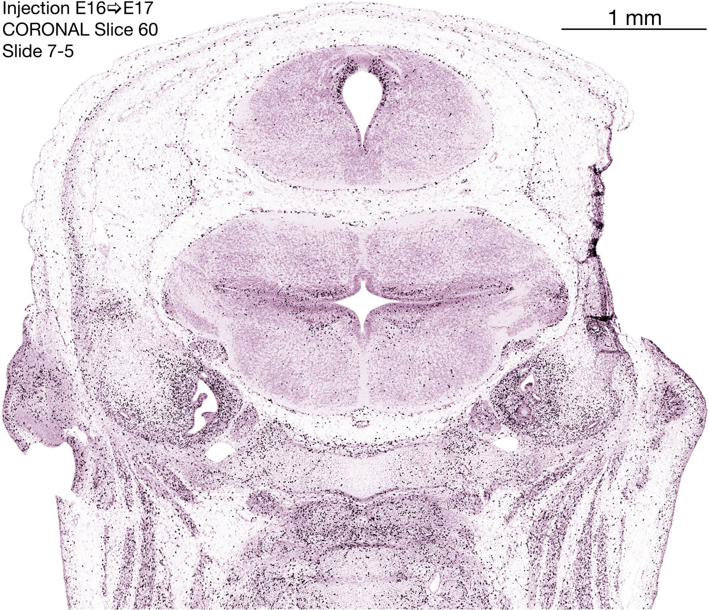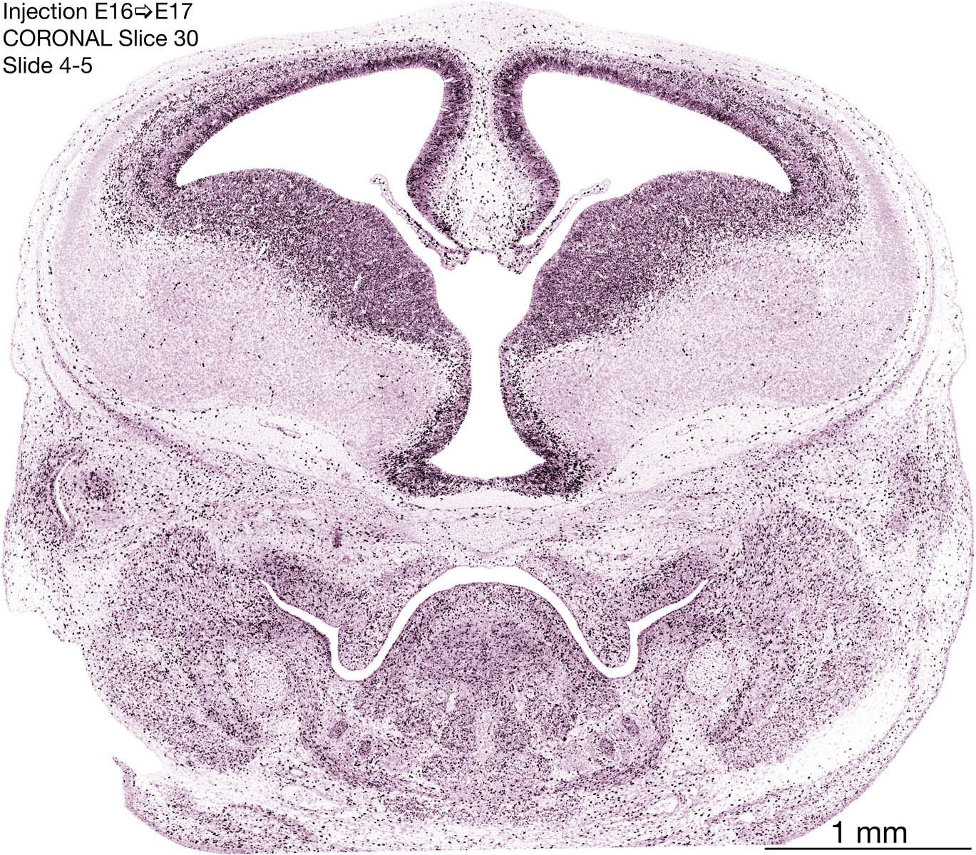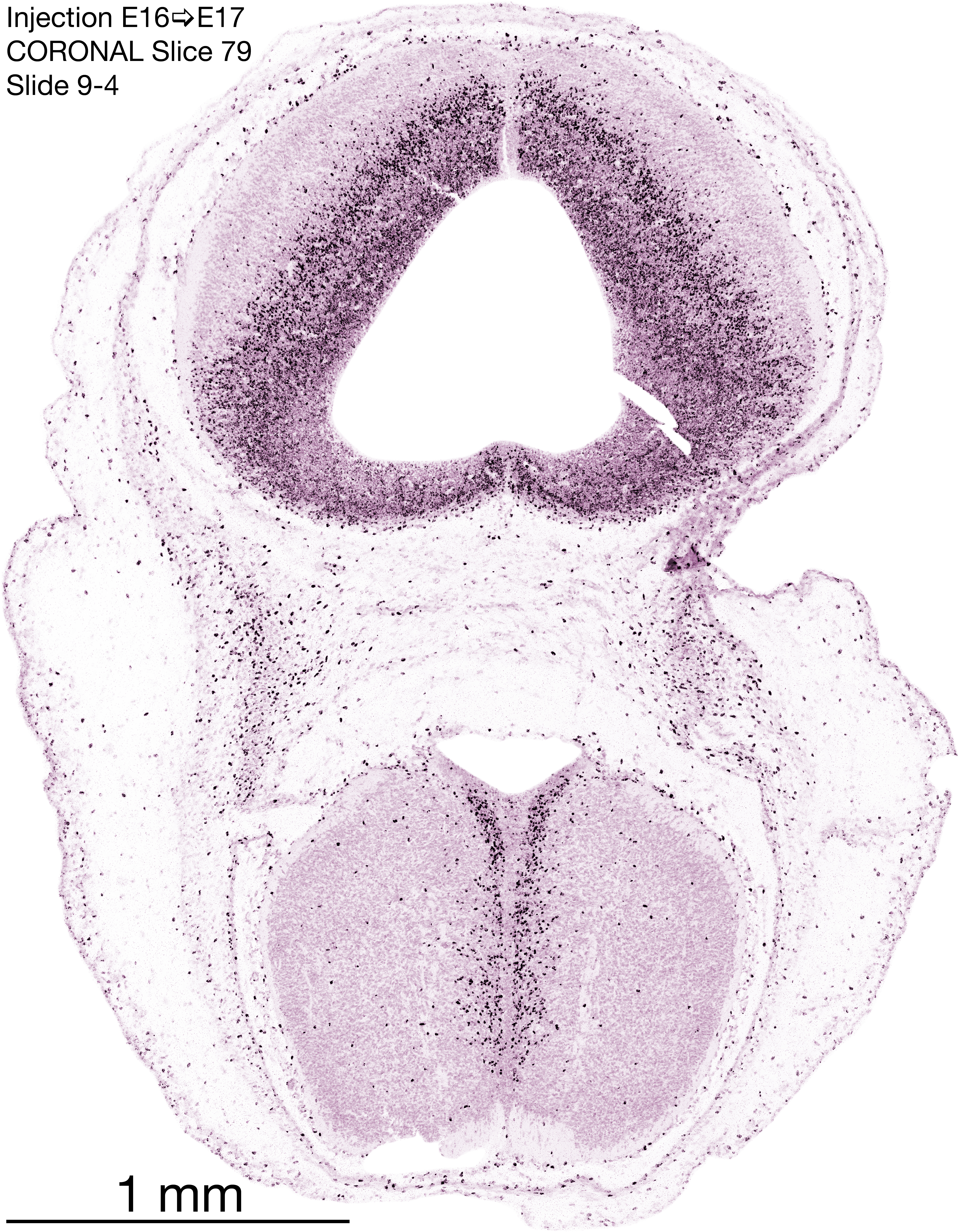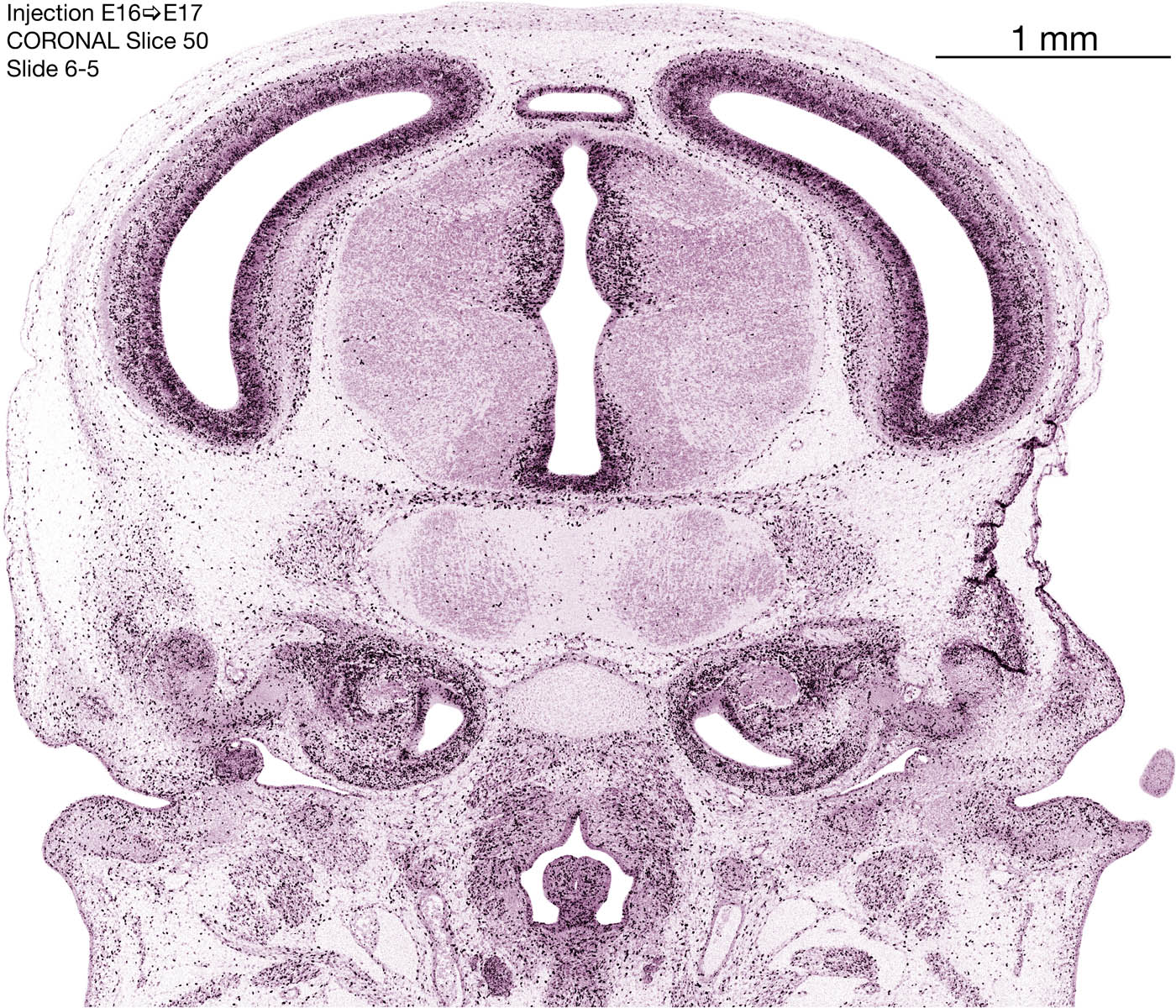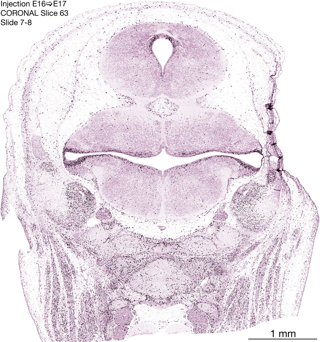 The following images are from a coronally-sectioned head of an E17 rat embryo exposed to tritiated thymidine on E16–24 hr survival. Note the heavily-labeled cells just outside the germinal zones, while the germinal zones themselves contain more lightly-labeled cells. Germinal zones in the brainstem continue to shrink and transform to an ependymal layer. The heavily-labeled migrating cells are postmitotic young neurons generated ON E16. By now, UNLABELED cells (generated before E16) take up most of the space outside the germinal and migratory zones. The pattern of heavily-labeled cells outside the cerebral cortex neuroepithelium deserves special mention. Notice that the labeled cells are in BANDS. We have postulated that these bands contain layer-specific neurons destined to settle in Layers V and VI in the mature cerebral cortex. We call this area the Stratified Transitional Field. See the neocortical development page in neurondevelopment.org for more information. The cerebellum now contains a prominent superficial band of labeled cells–the external germinal layer that will generate all short-axon neurons in the cerebellar cortex.