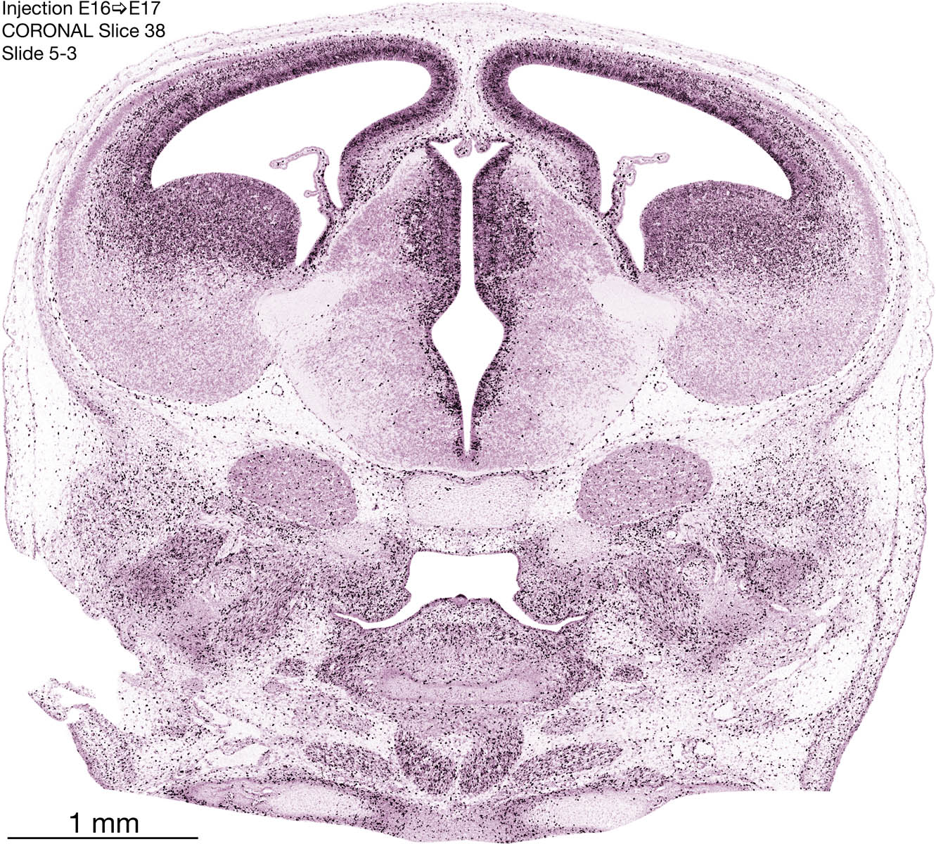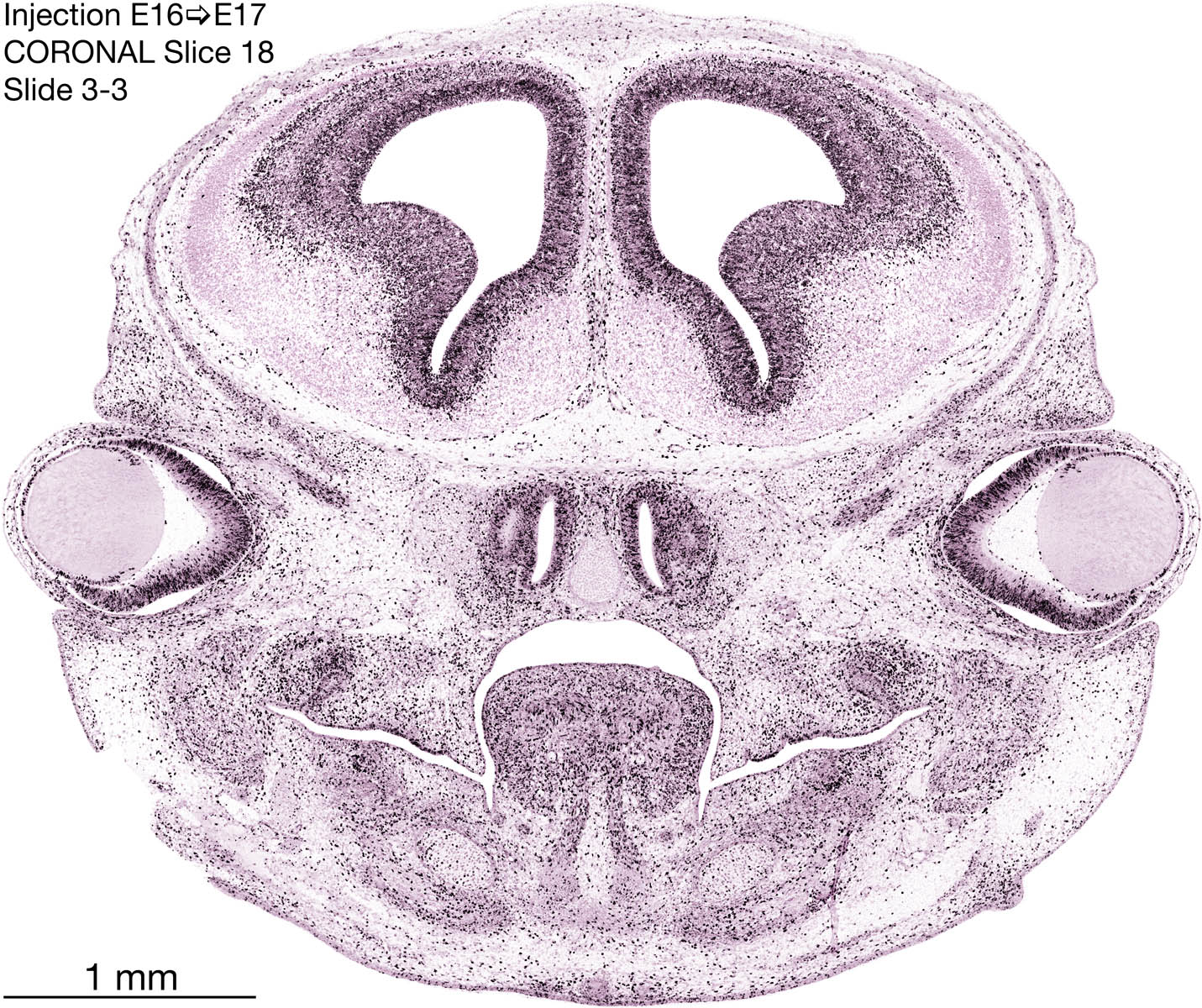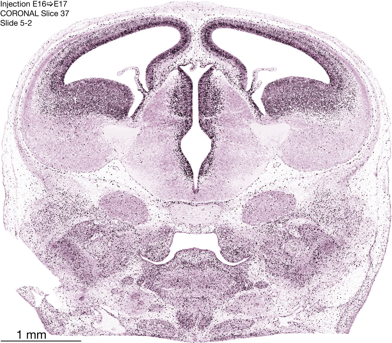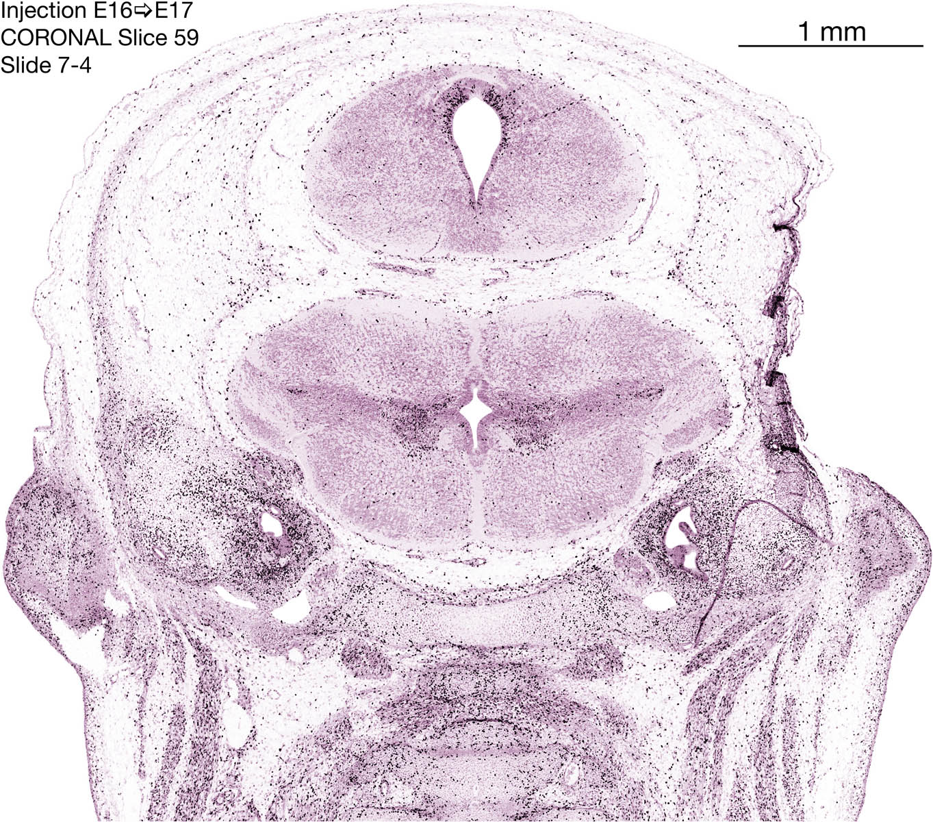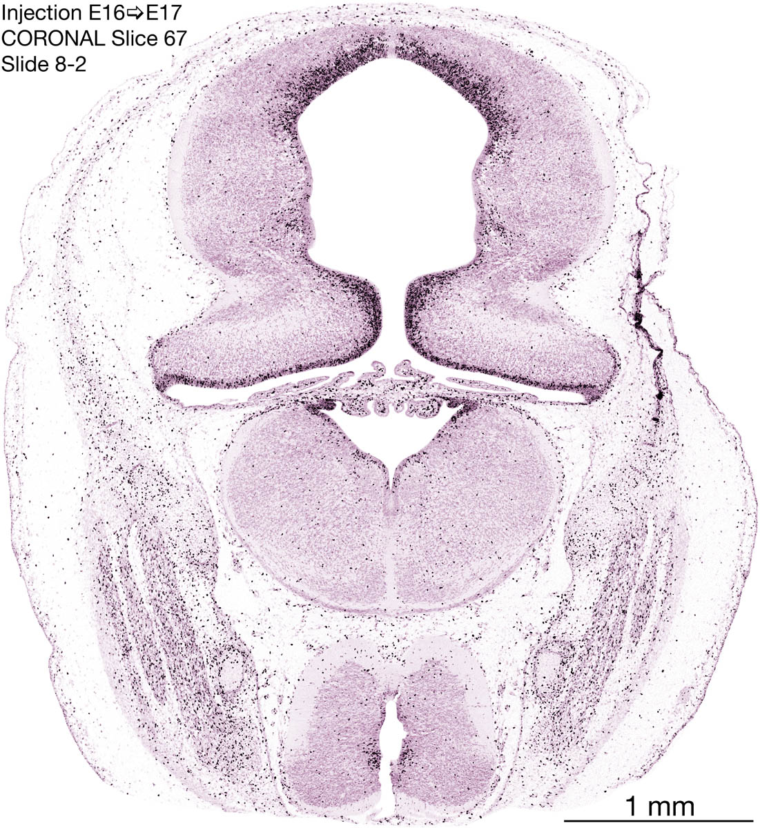 The following images are from a coronally-sectioned head of an E17 rat embryo exposed to tritiated thymidine on E16–24 hr survival. Note the heavily-labeled cells just outside the germinal zones, while the germinal zones themselves contain more lightly-labeled cells. Germinal zones in the brainstem continue to shrink and transform to an ependymal layer. The heavily-labeled migrating cells are postmitotic young neurons generated ON E16. By now, UNLABELED cells (generated before E16) take up most of the space outside the germinal and migratory zones. The pattern of heavily-labeled cells outside the cerebral cortex neuroepithelium deserves special mention. Notice that the labeled cells are in BANDS. We have postulated that these bands contain layer-specific neurons destined to settle in Layers V and VI in the mature cerebral cortex. We call this area the Stratified Transitional Field. See the neocortical development page in neurondevelopment.org for more information. The cerebellum now contains a prominent superficial band of labeled cells–the external germinal layer that will generate all short-axon neurons in the cerebellar cortex.