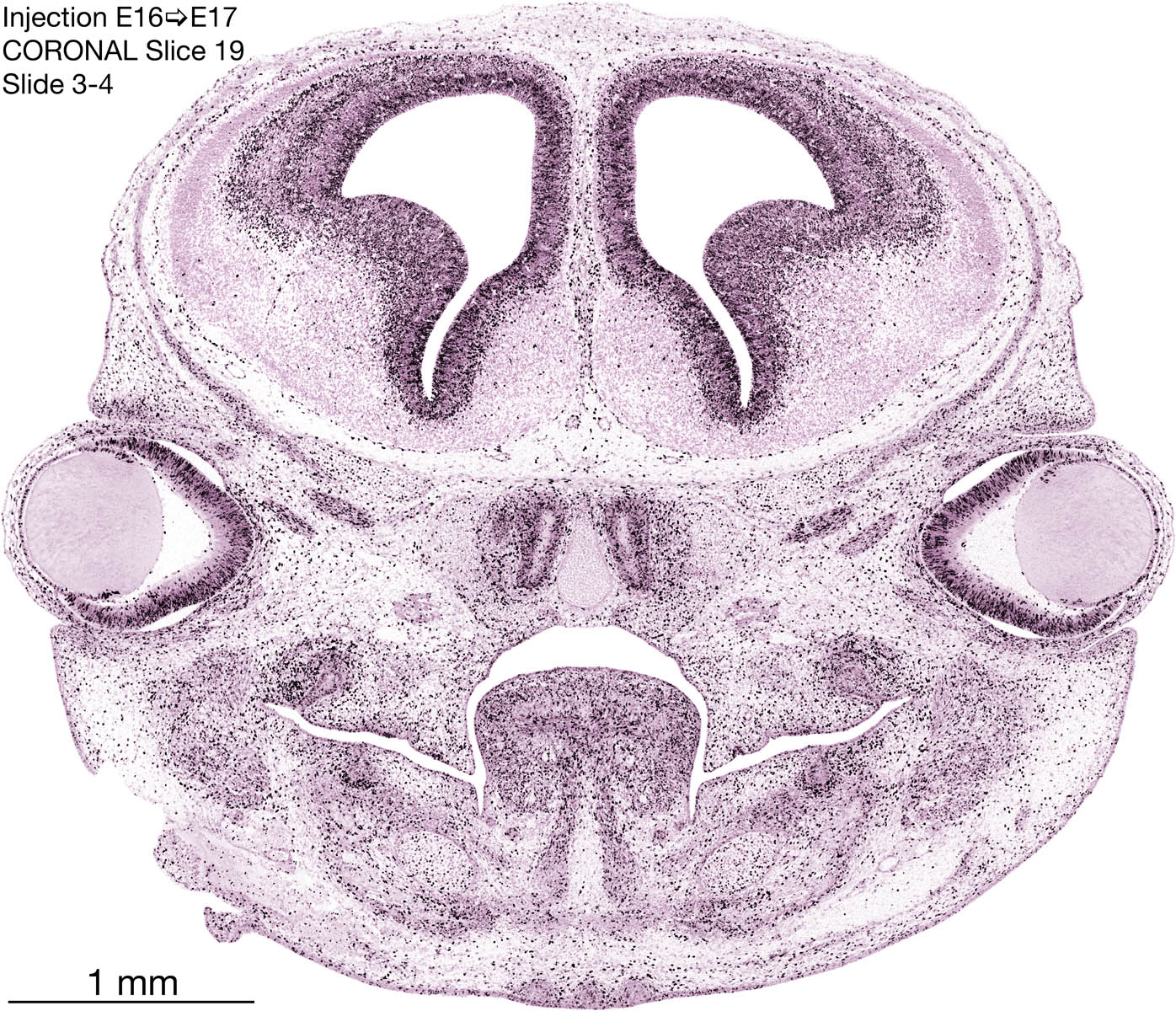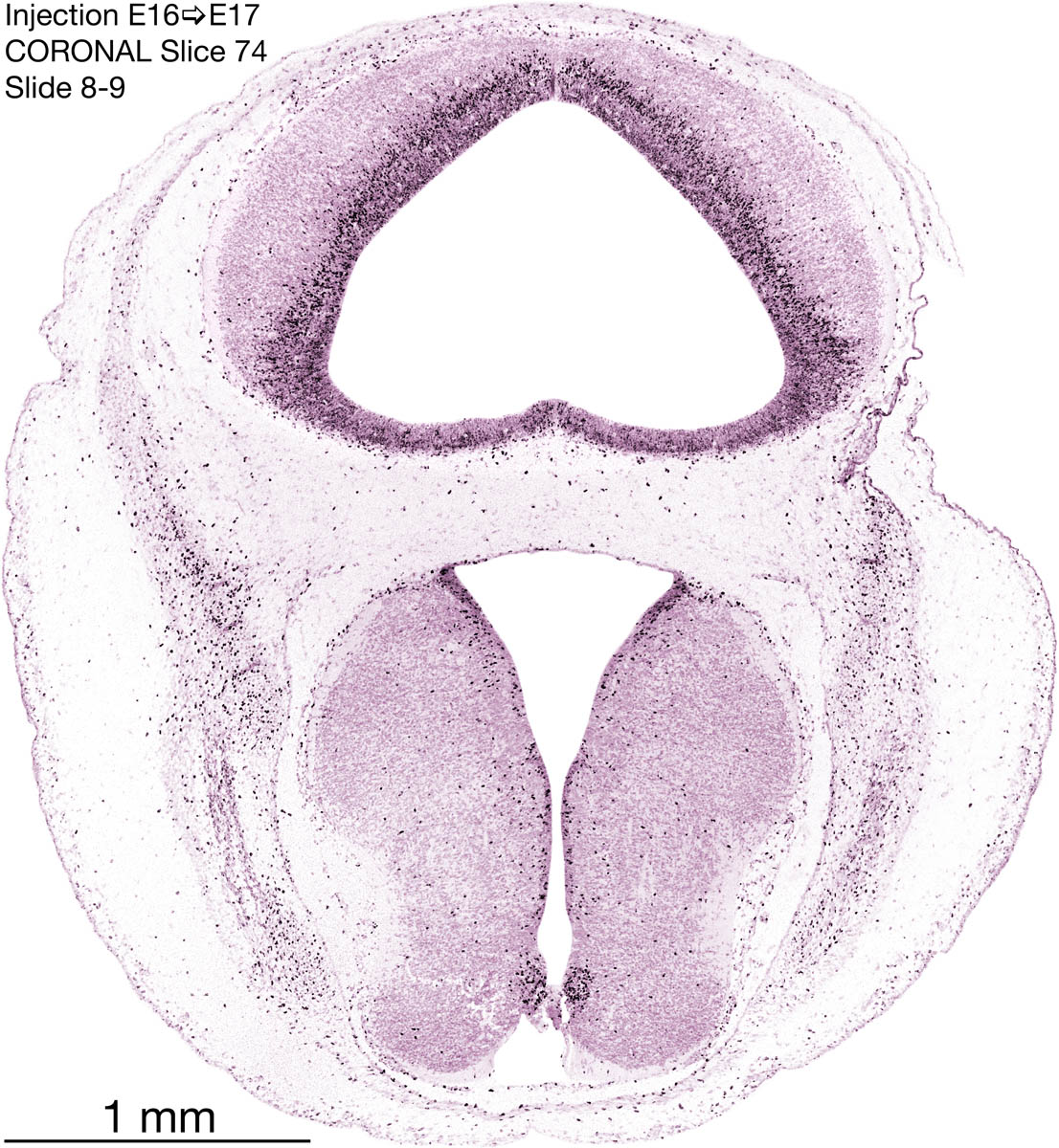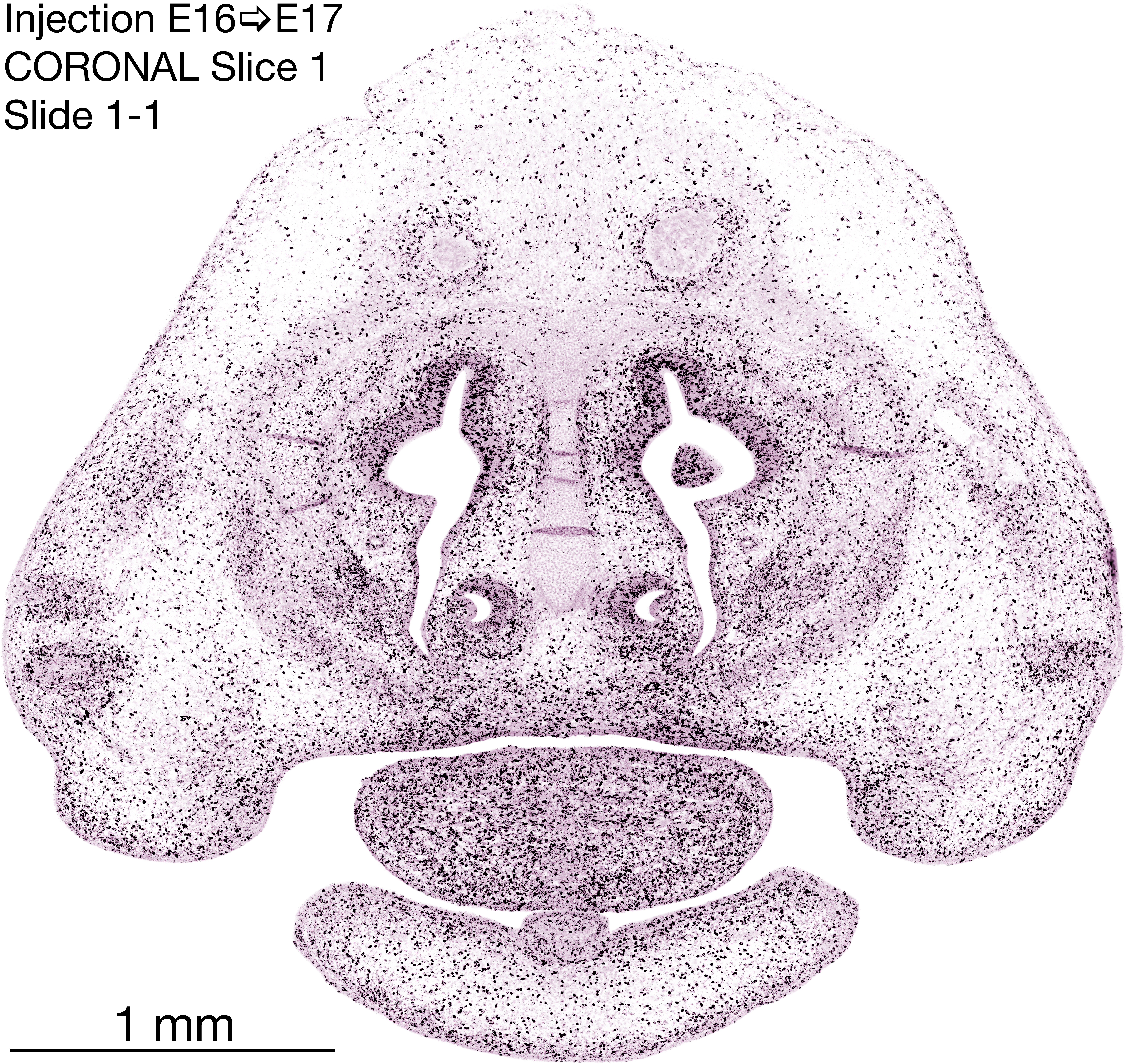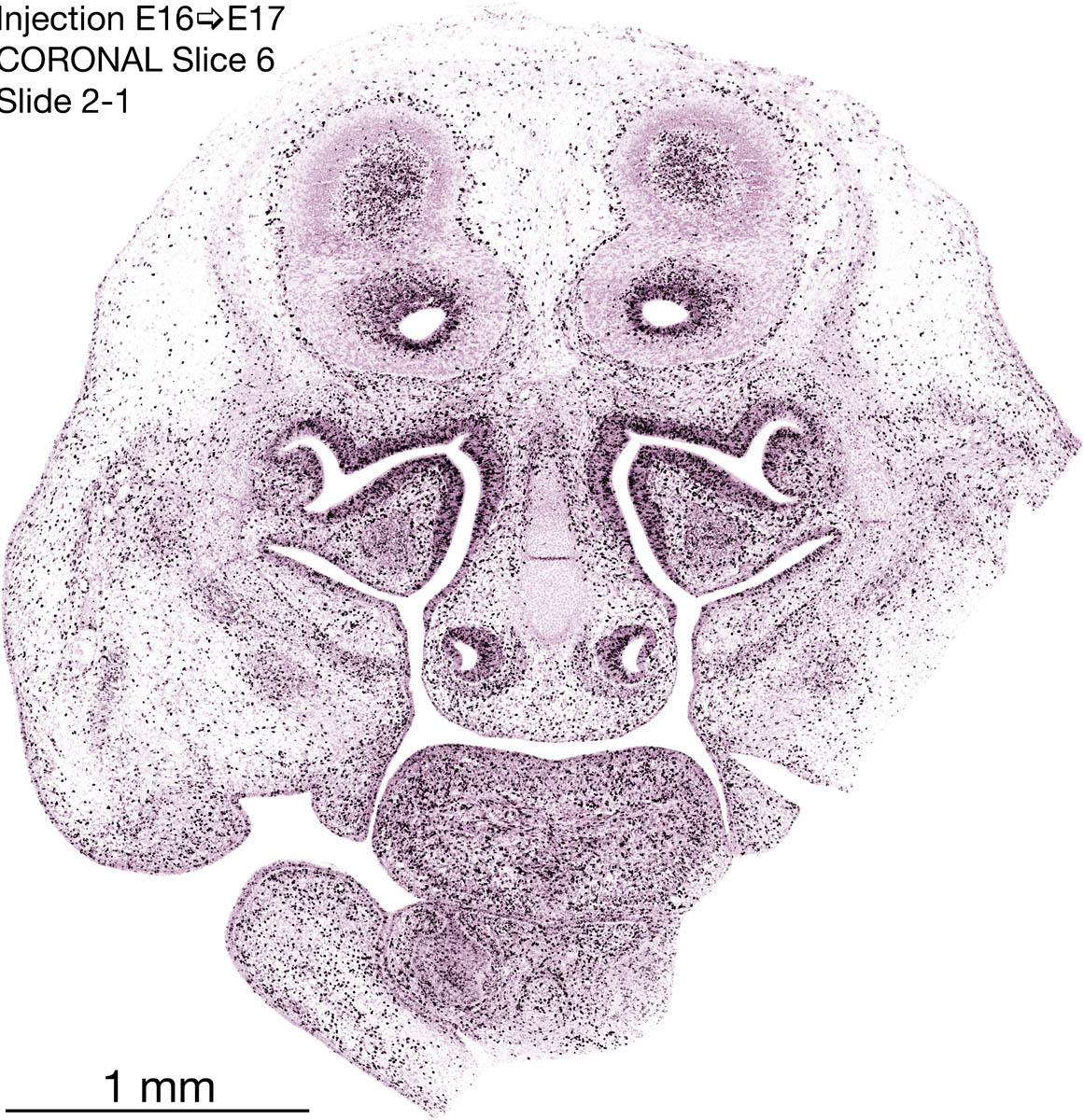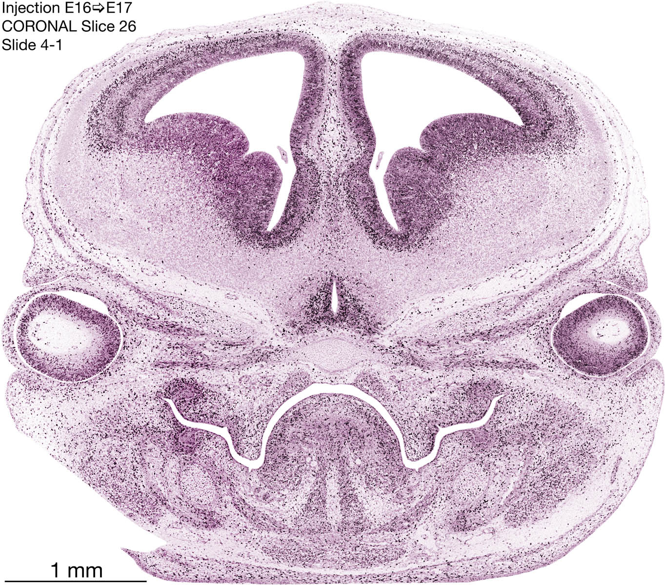 The following images are from a coronally-sectioned head of an E17 rat embryo exposed to tritiated thymidine on E16–24 hr survival. Note the heavily-labeled cells just outside the germinal zones, while the germinal zones themselves contain more lightly-labeled cells. Germinal zones in the brainstem continue to shrink and transform to an ependymal layer. The heavily-labeled migrating cells are postmitotic young neurons generated ON E16. By now, UNLABELED cells (generated before E16) take up most of the space outside the germinal and migratory zones. The pattern of heavily-labeled cells outside the cerebral cortex neuroepithelium deserves special mention. Notice that the labeled cells are in BANDS. We have postulated that these bands contain layer-specific neurons destined to settle in Layers V and VI in the mature cerebral cortex. We call this area the Stratified Transitional Field. See the neocortical development page in neurondevelopment.org for more information. The cerebellum now contains a prominent superficial band of labeled cells–the external germinal layer that will generate all short-axon neurons in the cerebellar cortex.