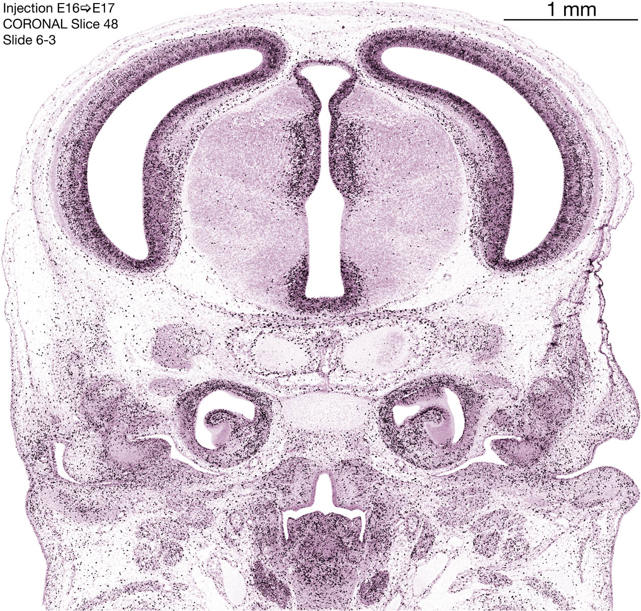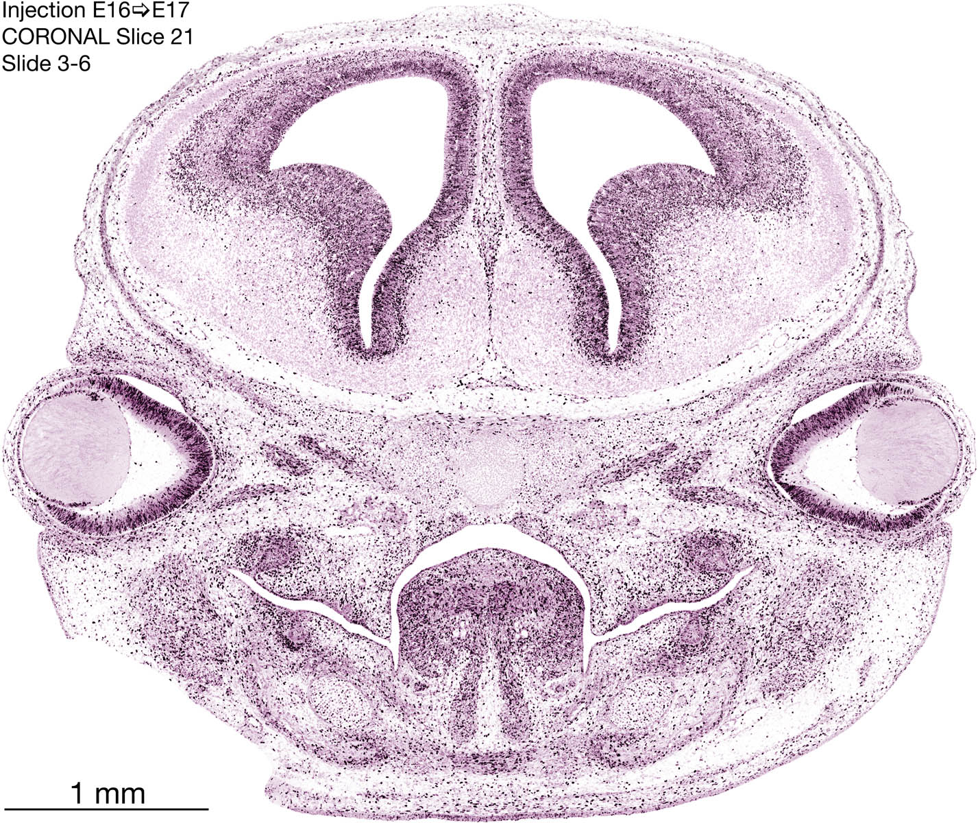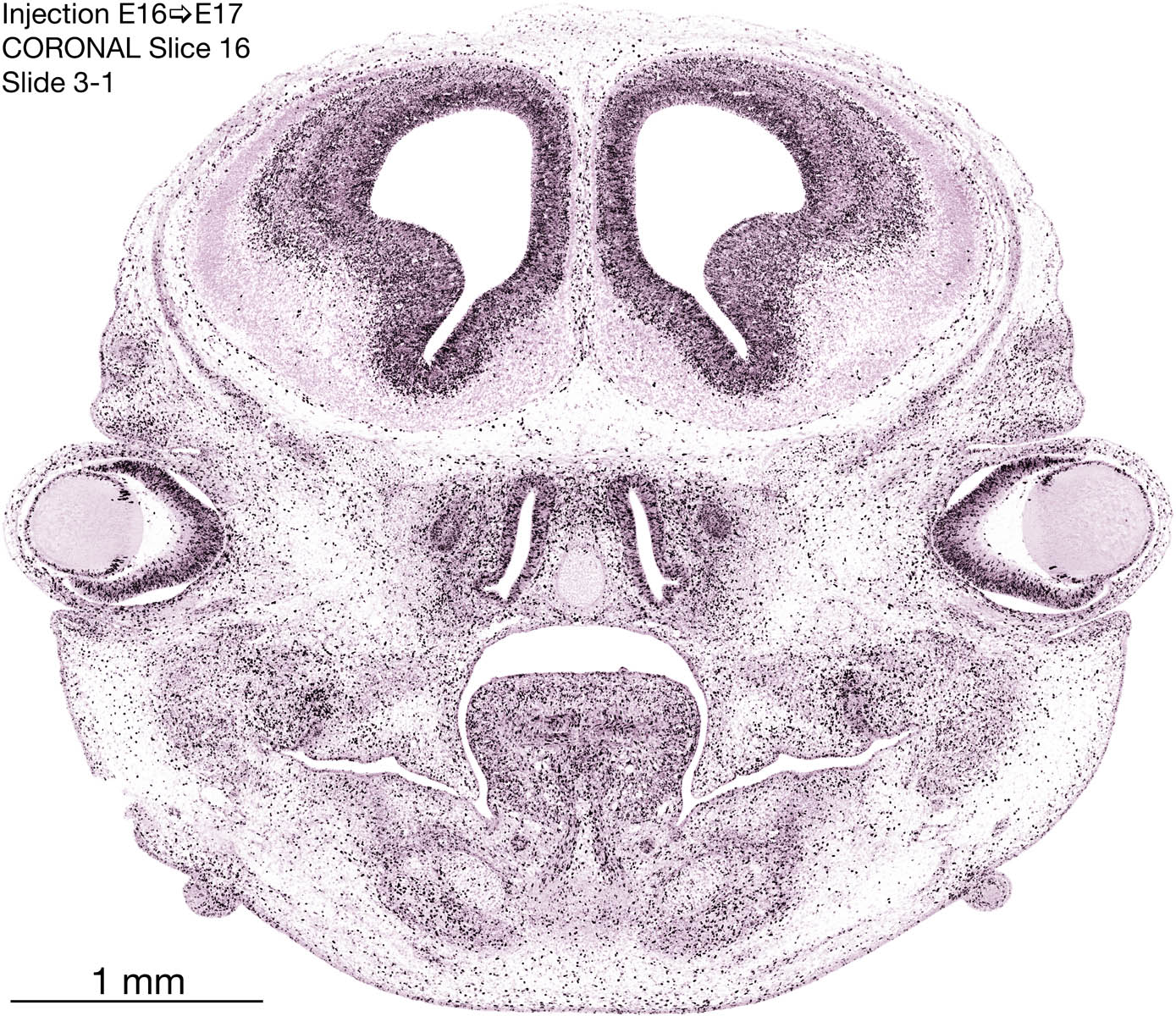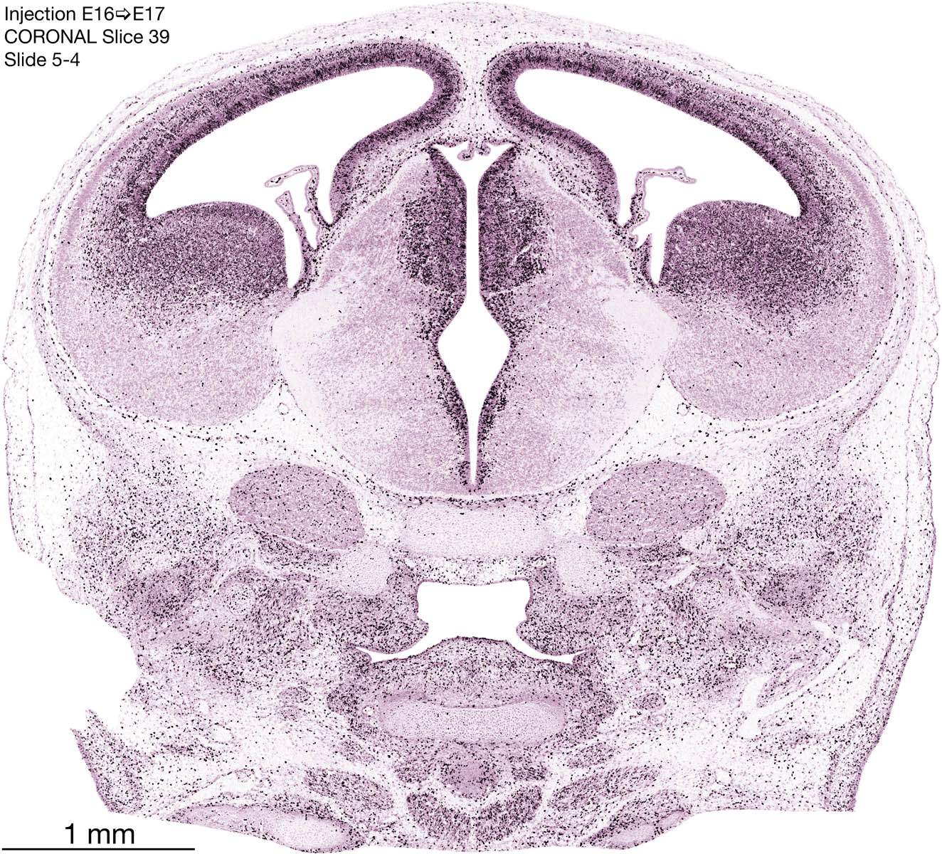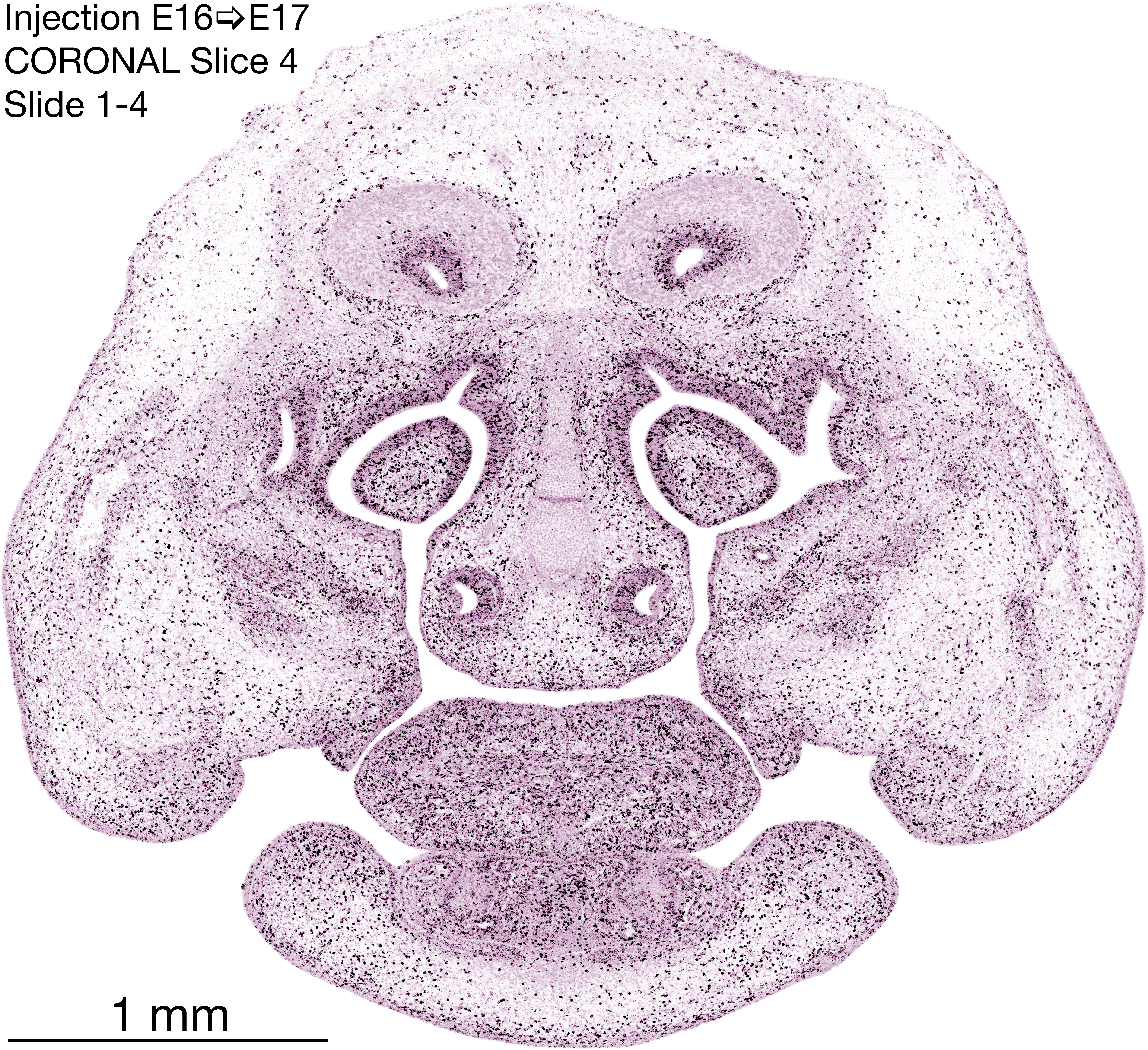 The following images are from a coronally-sectioned head of an E17 rat embryo exposed to tritiated thymidine on E16–24 hr survival. Note the heavily-labeled cells just outside the germinal zones, while the germinal zones themselves contain more lightly-labeled cells. Germinal zones in the brainstem continue to shrink and transform to an ependymal layer. The heavily-labeled migrating cells are postmitotic young neurons generated ON E16. By now, UNLABELED cells (generated before E16) take up most of the space outside the germinal and migratory zones. The pattern of heavily-labeled cells outside the cerebral cortex neuroepithelium deserves special mention. Notice that the labeled cells are in BANDS. We have postulated that these bands contain layer-specific neurons destined to settle in Layers V and VI in the mature cerebral cortex. We call this area the Stratified Transitional Field. See the neocortical development page in neurondevelopment.org for more information. The cerebellum now contains a prominent superficial band of labeled cells–the external germinal layer that will generate all short-axon neurons in the cerebellar cortex.