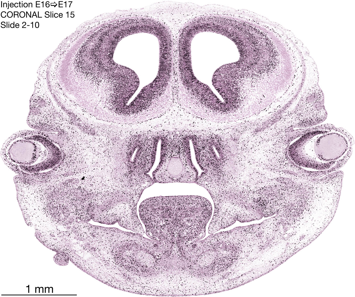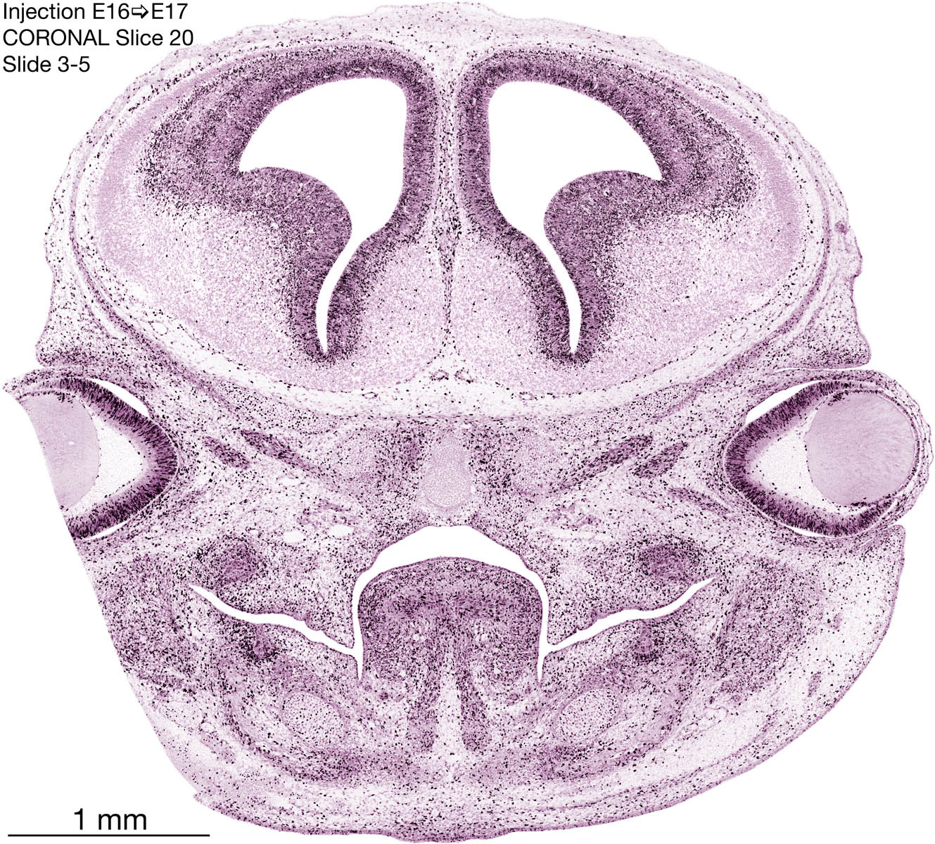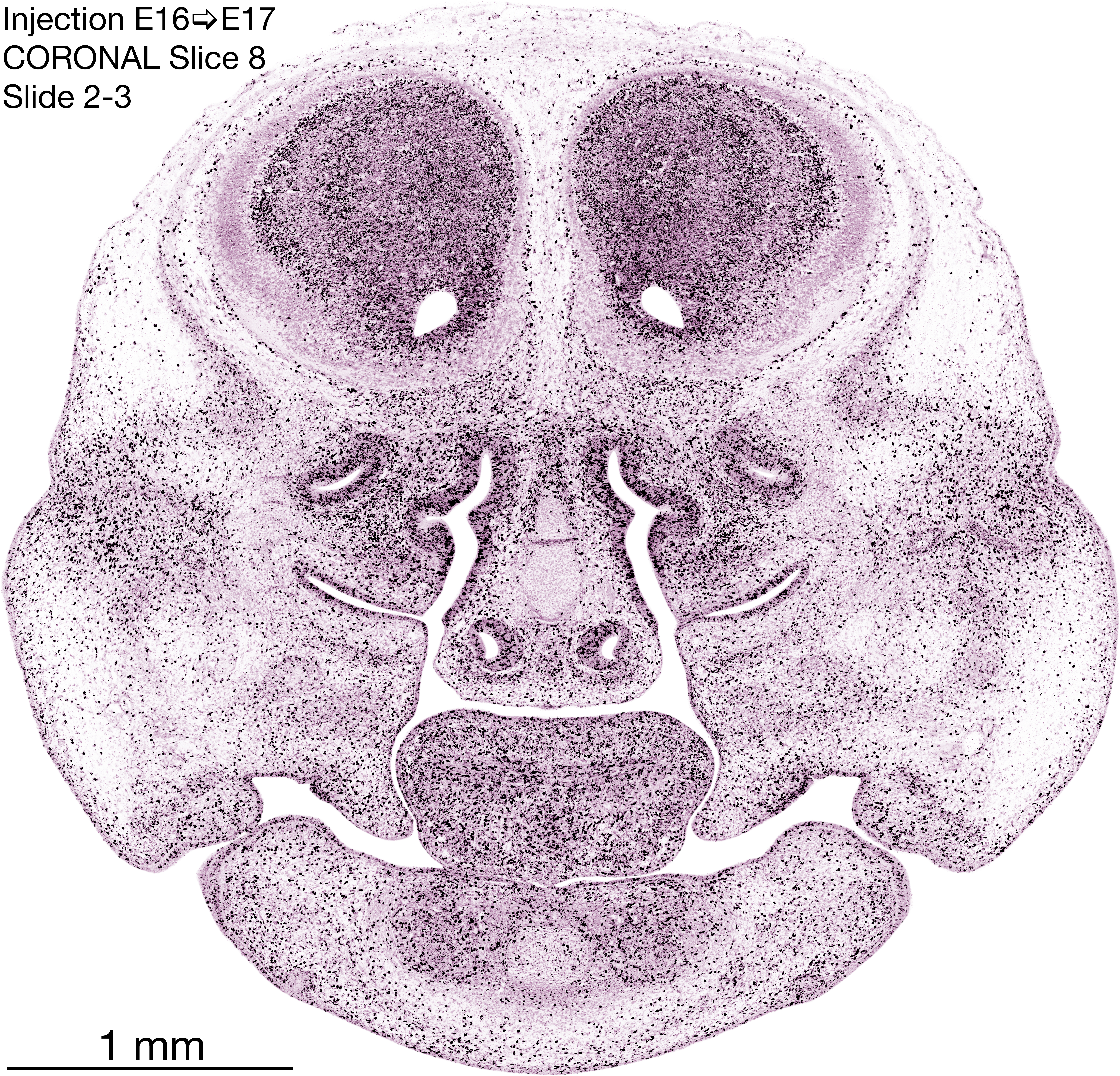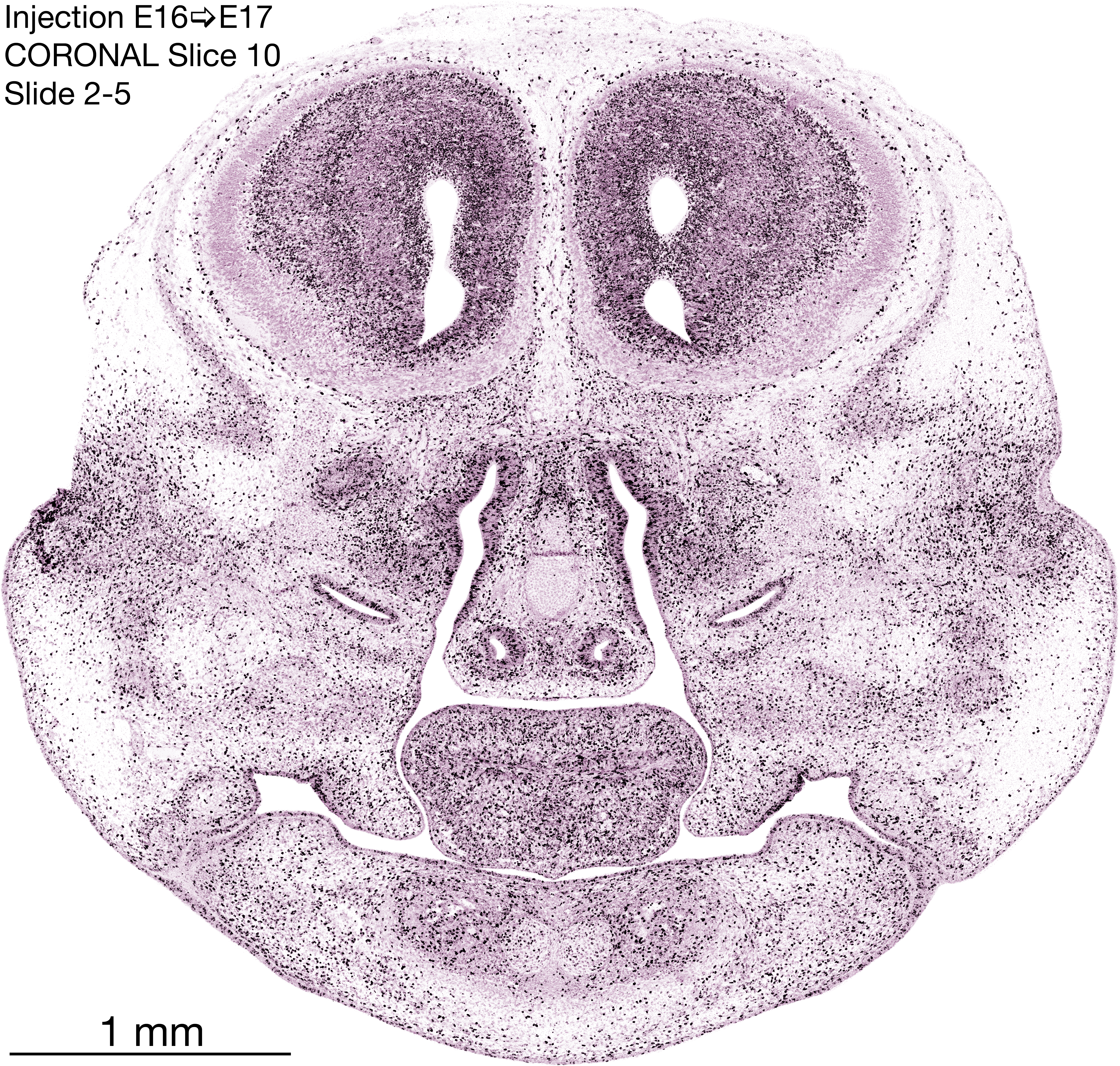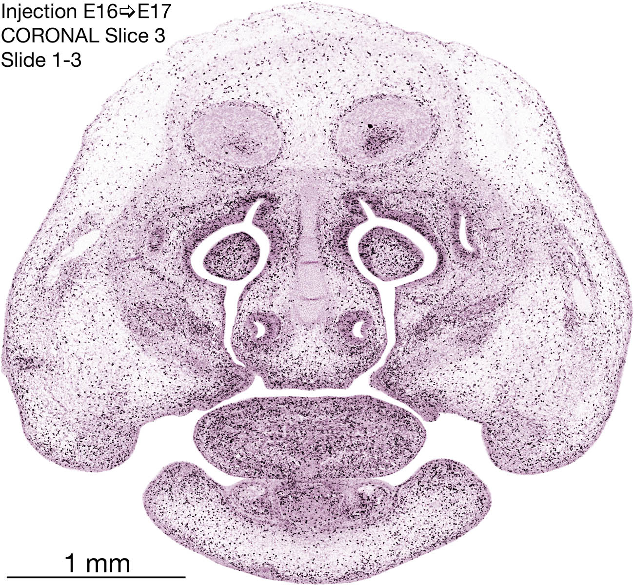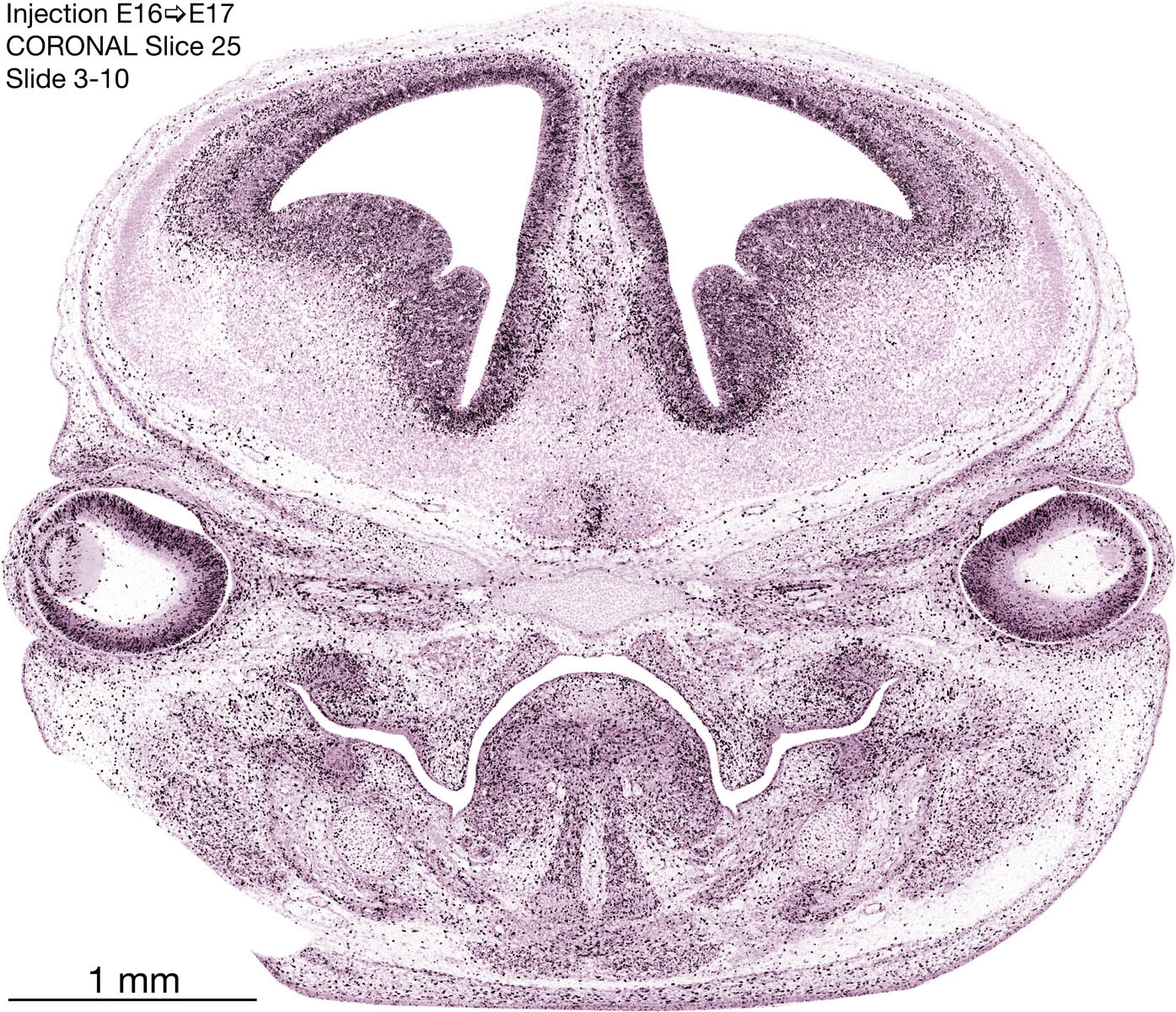 The following images are from a coronally-sectioned head of an E17 rat embryo exposed to tritiated thymidine on E16–24 hr survival. Note the heavily-labeled cells just outside the germinal zones, while the germinal zones themselves contain more lightly-labeled cells. Germinal zones in the brainstem continue to shrink and transform to an ependymal layer. The heavily-labeled migrating cells are postmitotic young neurons generated ON E16. By now, UNLABELED cells (generated before E16) take up most of the space outside the germinal and migratory zones. The pattern of heavily-labeled cells outside the cerebral cortex neuroepithelium deserves special mention. Notice that the labeled cells are in BANDS. We have postulated that these bands contain layer-specific neurons destined to settle in Layers V and VI in the mature cerebral cortex. We call this area the Stratified Transitional Field. See the neocortical development page in neurondevelopment.org for more information. The cerebellum now contains a prominent superficial band of labeled cells–the external germinal layer that will generate all short-axon neurons in the cerebellar cortex.