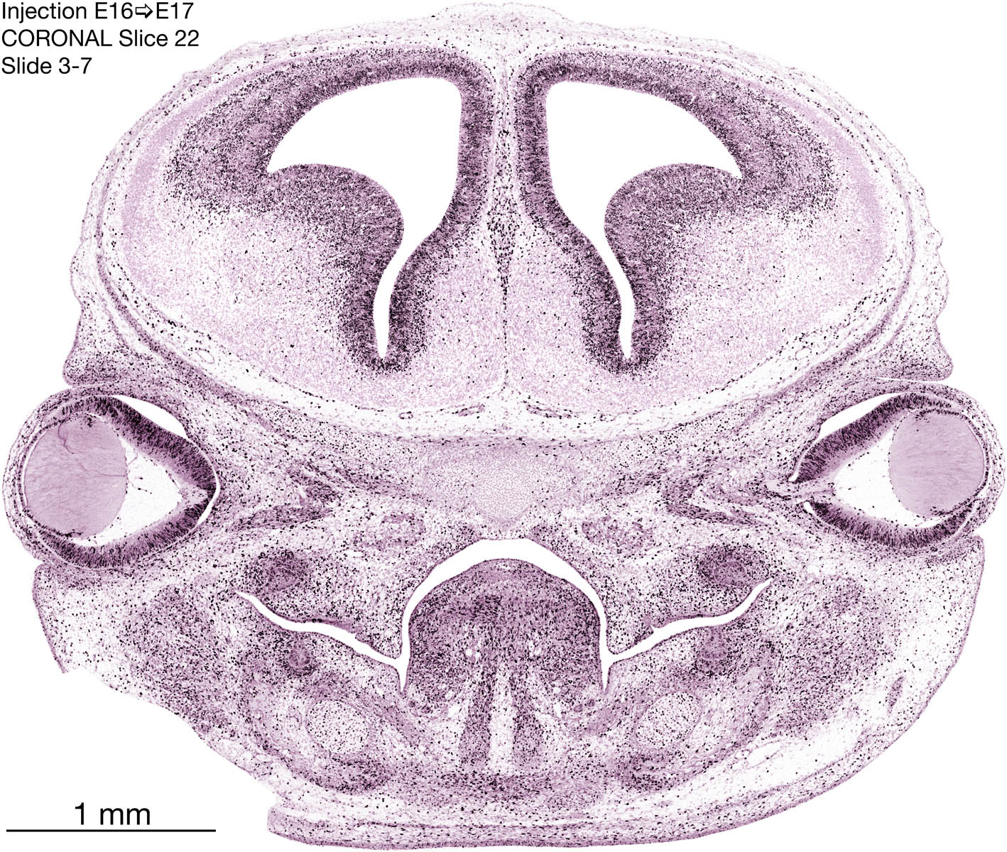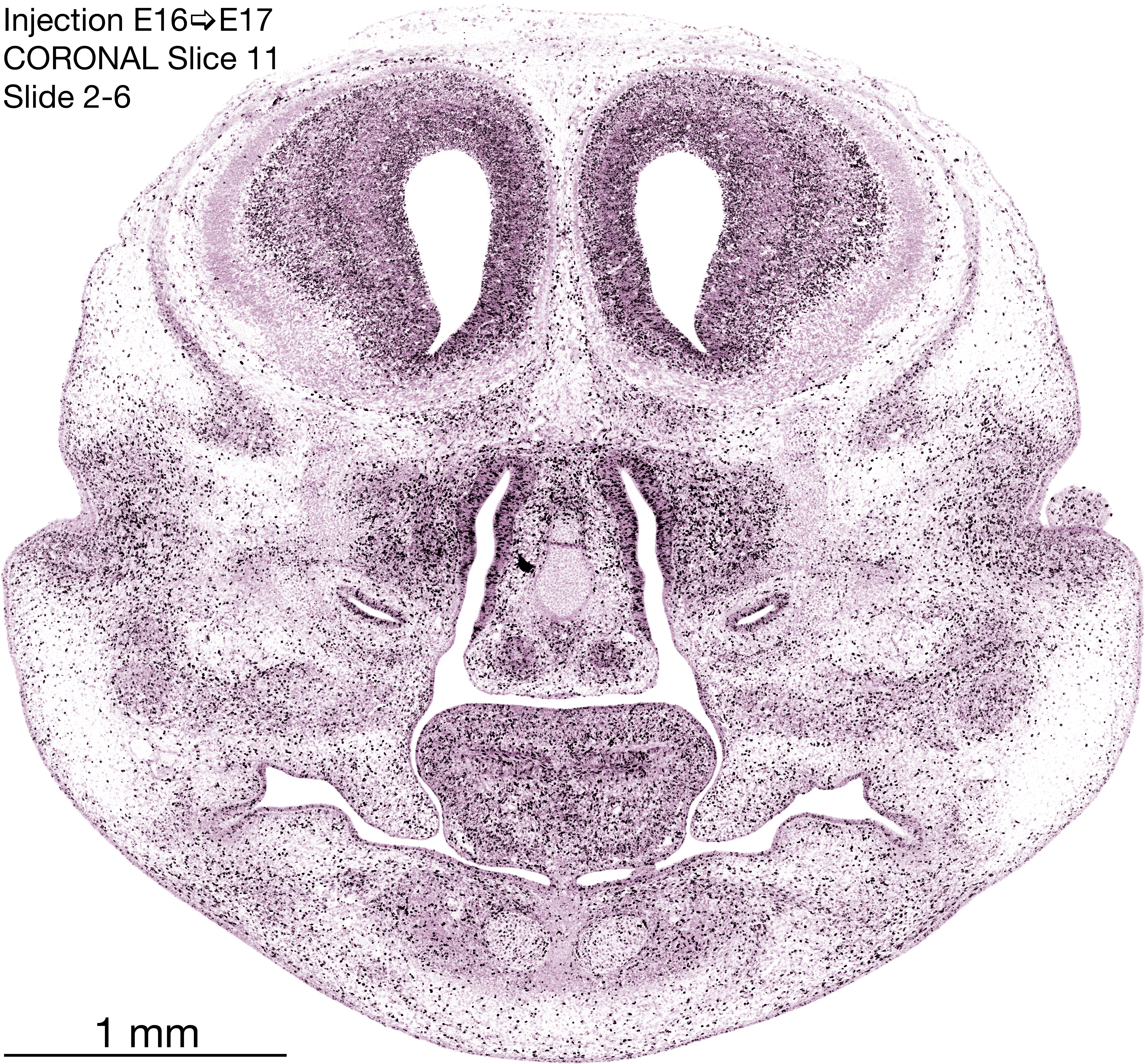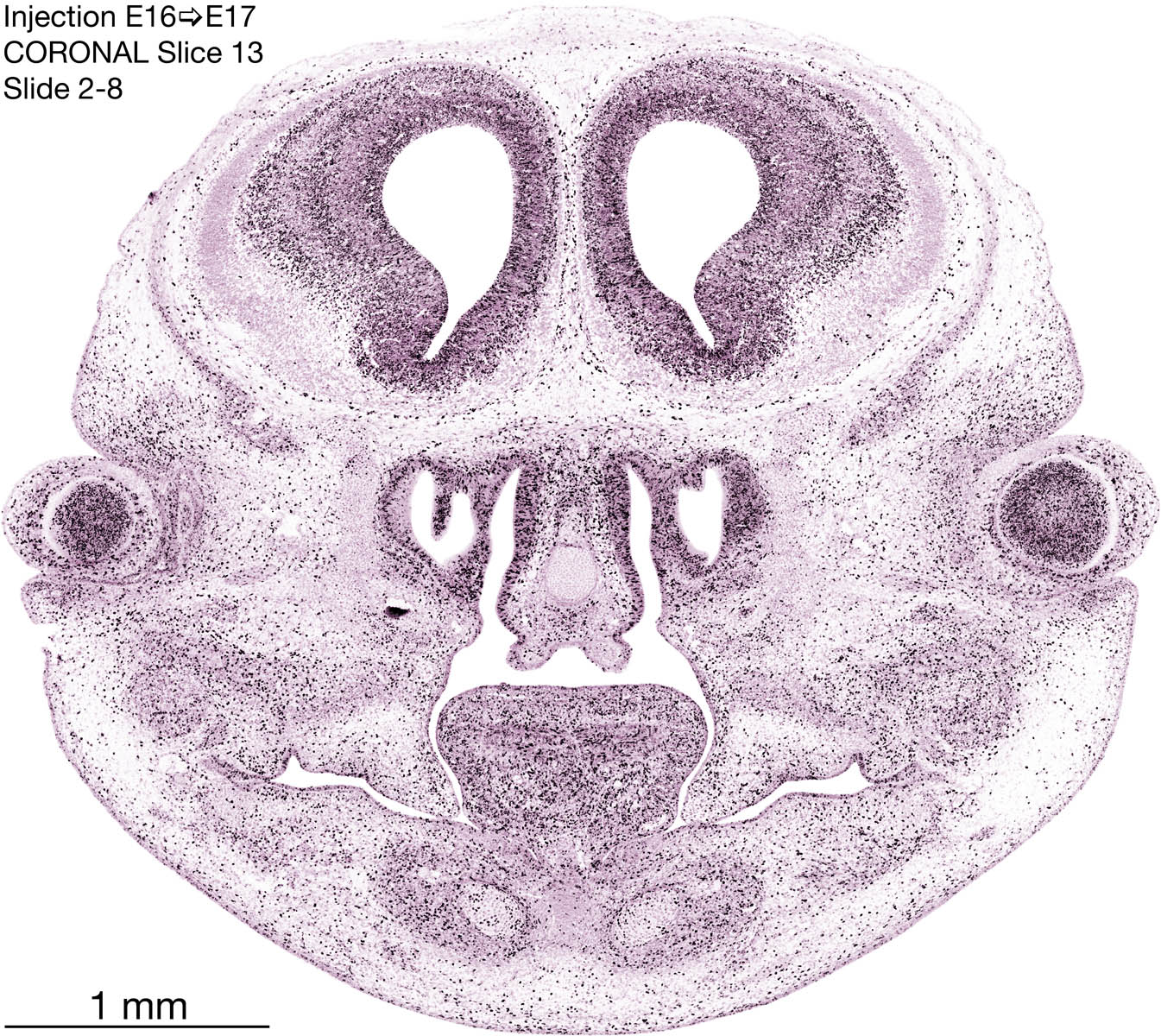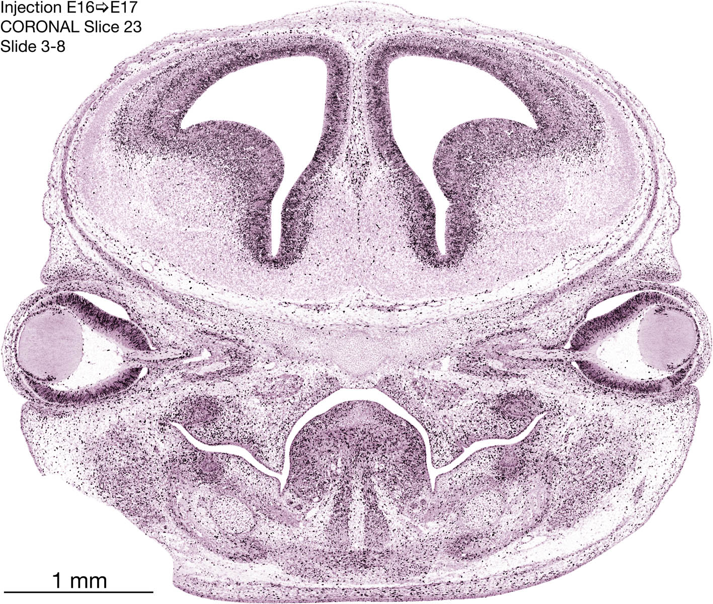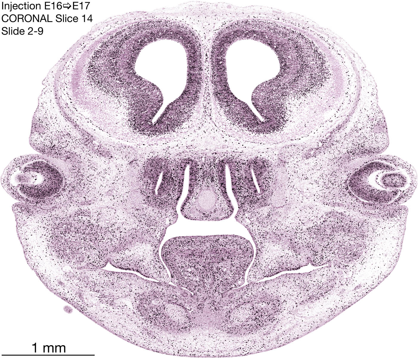The following images are from a coronally-sectioned head of an E17 rat embryo exposed to tritiated thymidine on E16–24 hr survival. Note the heavily-labeled cells just outside the germinal zones, while the germinal zones themselves contain more lightly-labeled cells. Germinal zones in the brainstem continue to shrink and transform to an ependymal layer. The heavily-labeled migrating cells are postmitotic young neurons generated ON E16. By now, UNLABELED cells (generated before E16) take up most of the space outside the germinal and migratory zones. The pattern of heavily-labeled cells outside the cerebral cortex neuroepithelium deserves special mention. Notice that the labeled cells are in BANDS. We have postulated that these bands contain layer-specific neurons destined to settle in Layers V and VI in the mature cerebral cortex. We call this area the Stratified Transitional Field. See the neocortical development page in neurondevelopment.org for more information. The cerebellum now contains a prominent superficial band of labeled cells–the external germinal layer that will generate all short-axon neurons in the cerebellar cortex.