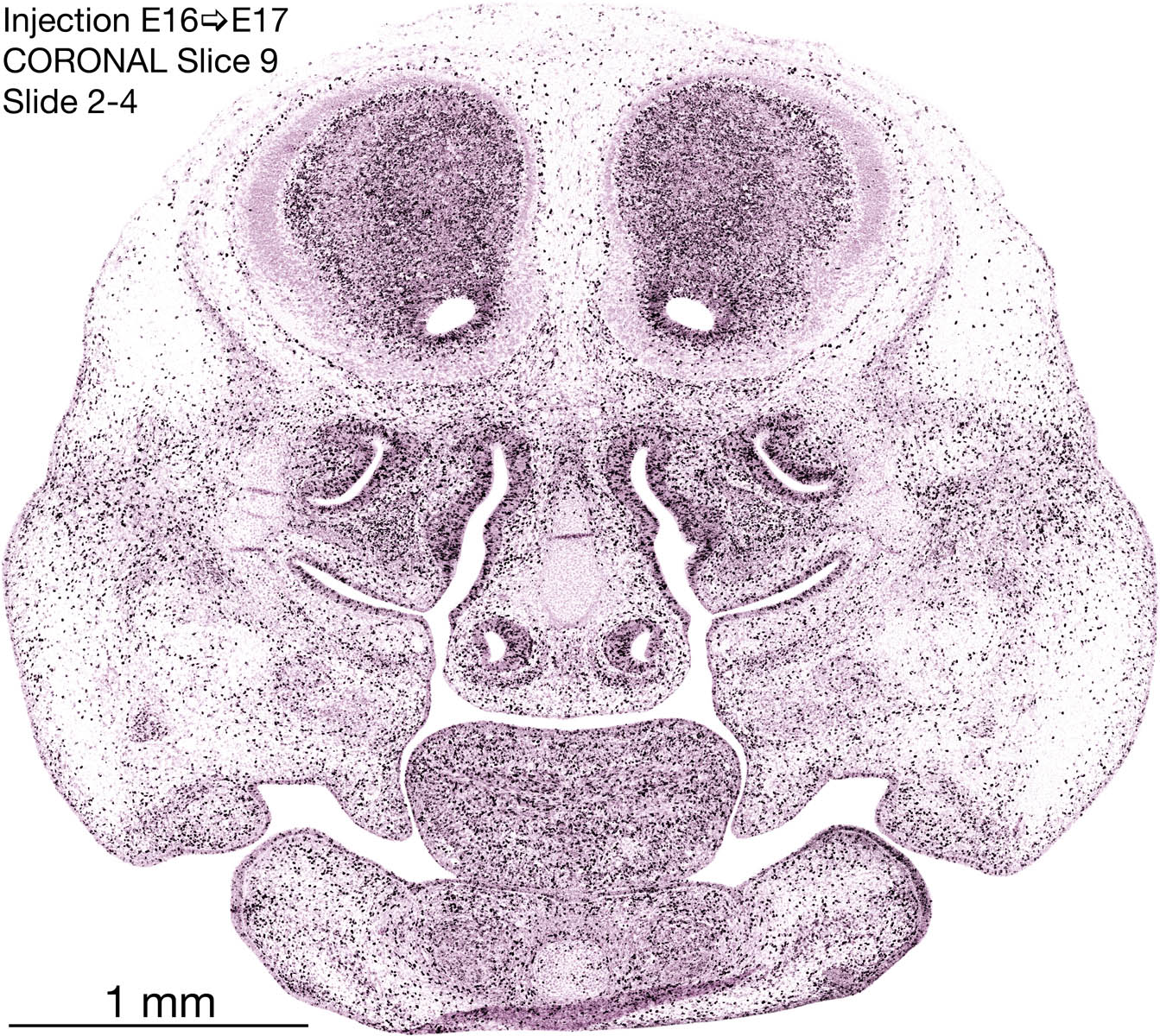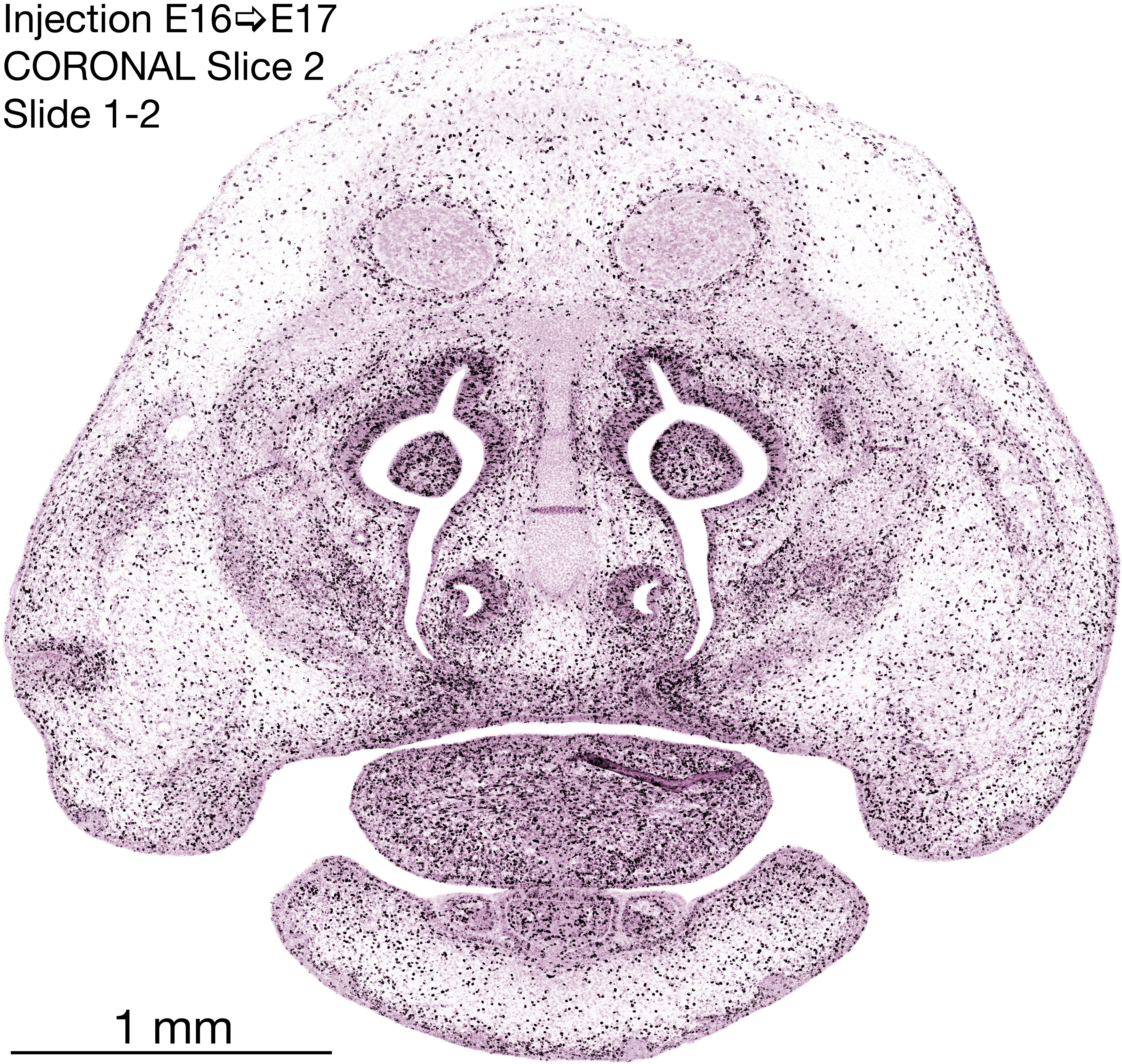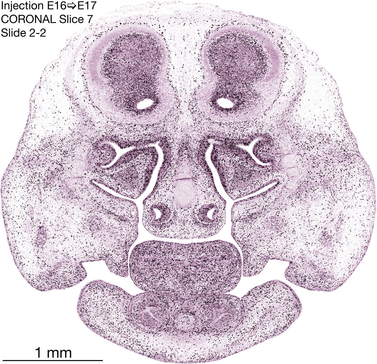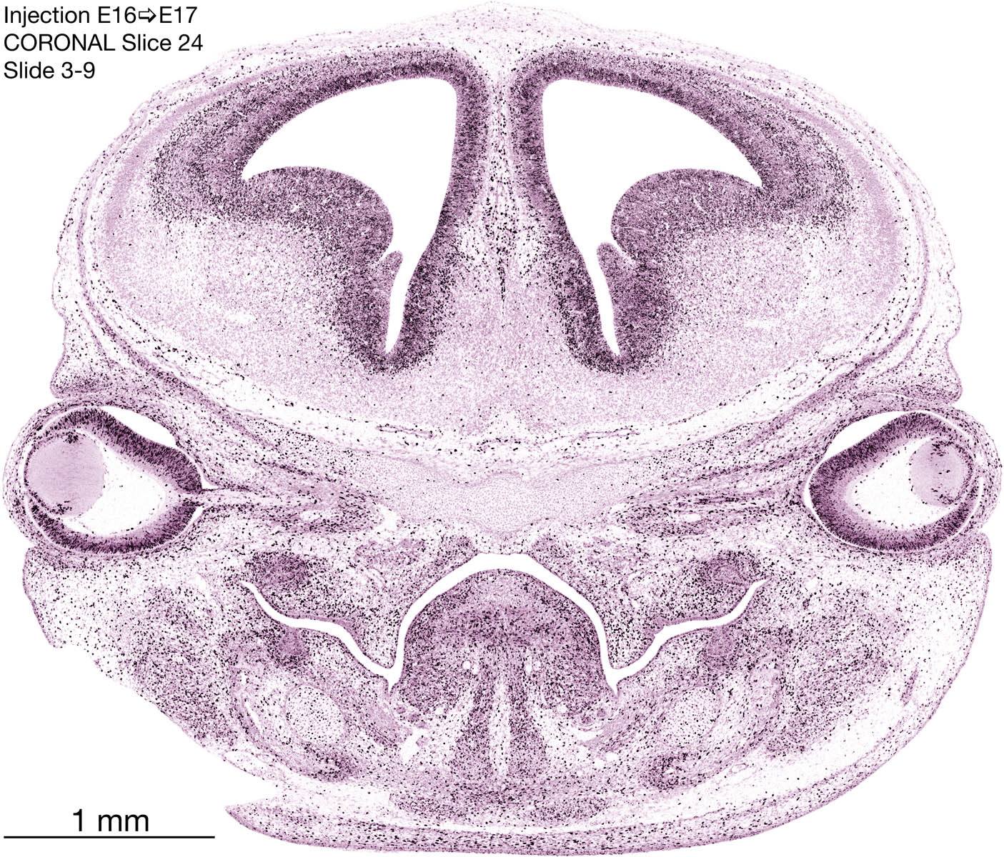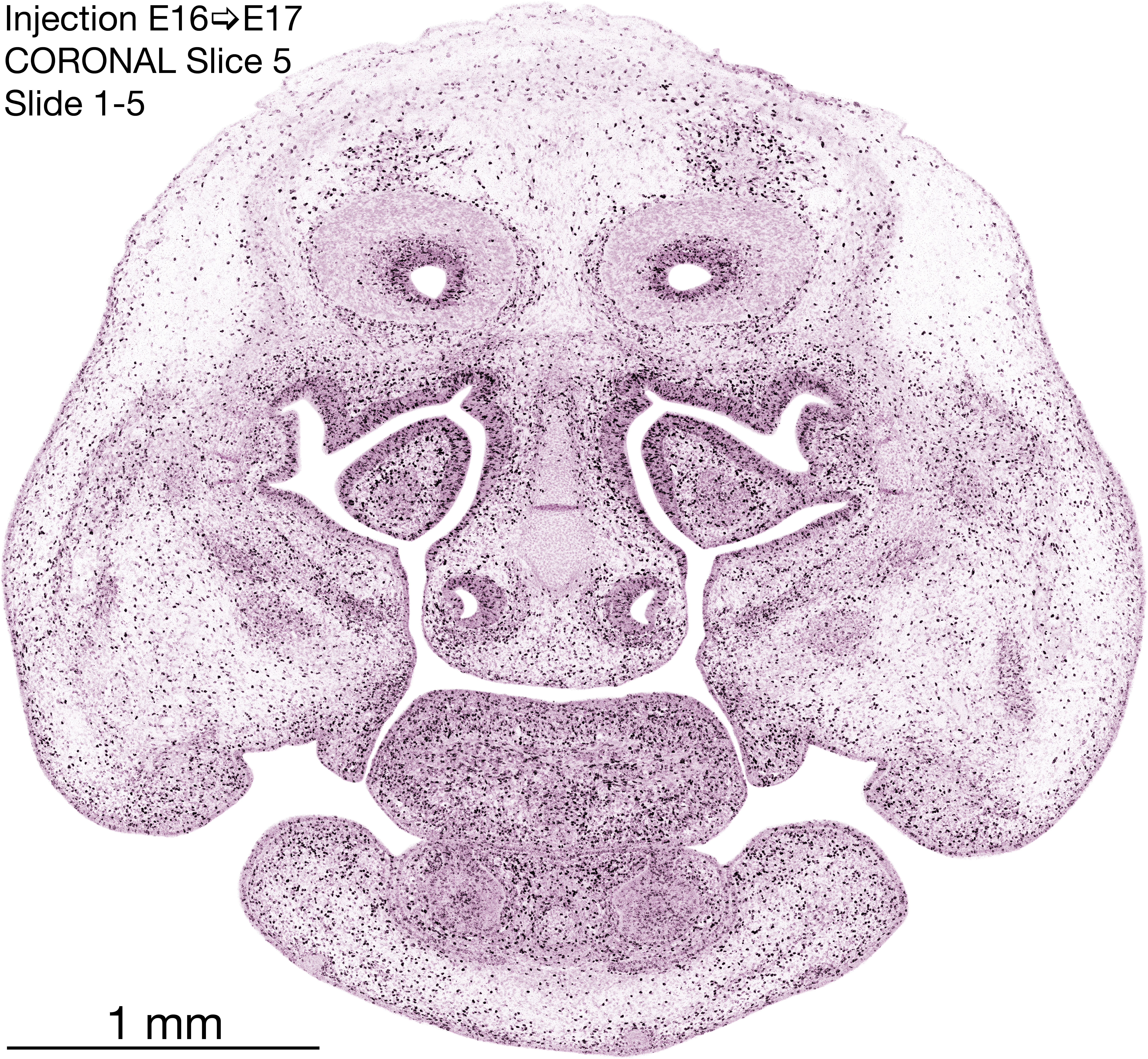 The following images are from a coronally-sectioned head of an E17 rat embryo exposed to tritiated thymidine on E16–24 hr survival. Note the heavily-labeled cells just outside the germinal zones, while the germinal zones themselves contain more lightly-labeled cells. Germinal zones in the brainstem continue to shrink and transform to an ependymal layer. The heavily-labeled migrating cells are postmitotic young neurons generated ON E16. By now, UNLABELED cells (generated before E16) take up most of the space outside the germinal and migratory zones. The pattern of heavily-labeled cells outside the cerebral cortex neuroepithelium deserves special mention. Notice that the labeled cells are in BANDS. We have postulated that these bands contain layer-specific neurons destined to settle in Layers V and VI in the mature cerebral cortex. We call this area the Stratified Transitional Field. See the neocortical development page in neurondevelopment.org for more information. The cerebellum now contains a prominent superficial band of labeled cells–the external germinal layer that will generate all short-axon neurons in the cerebellar cortex.