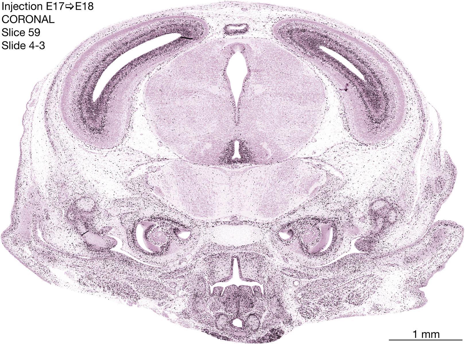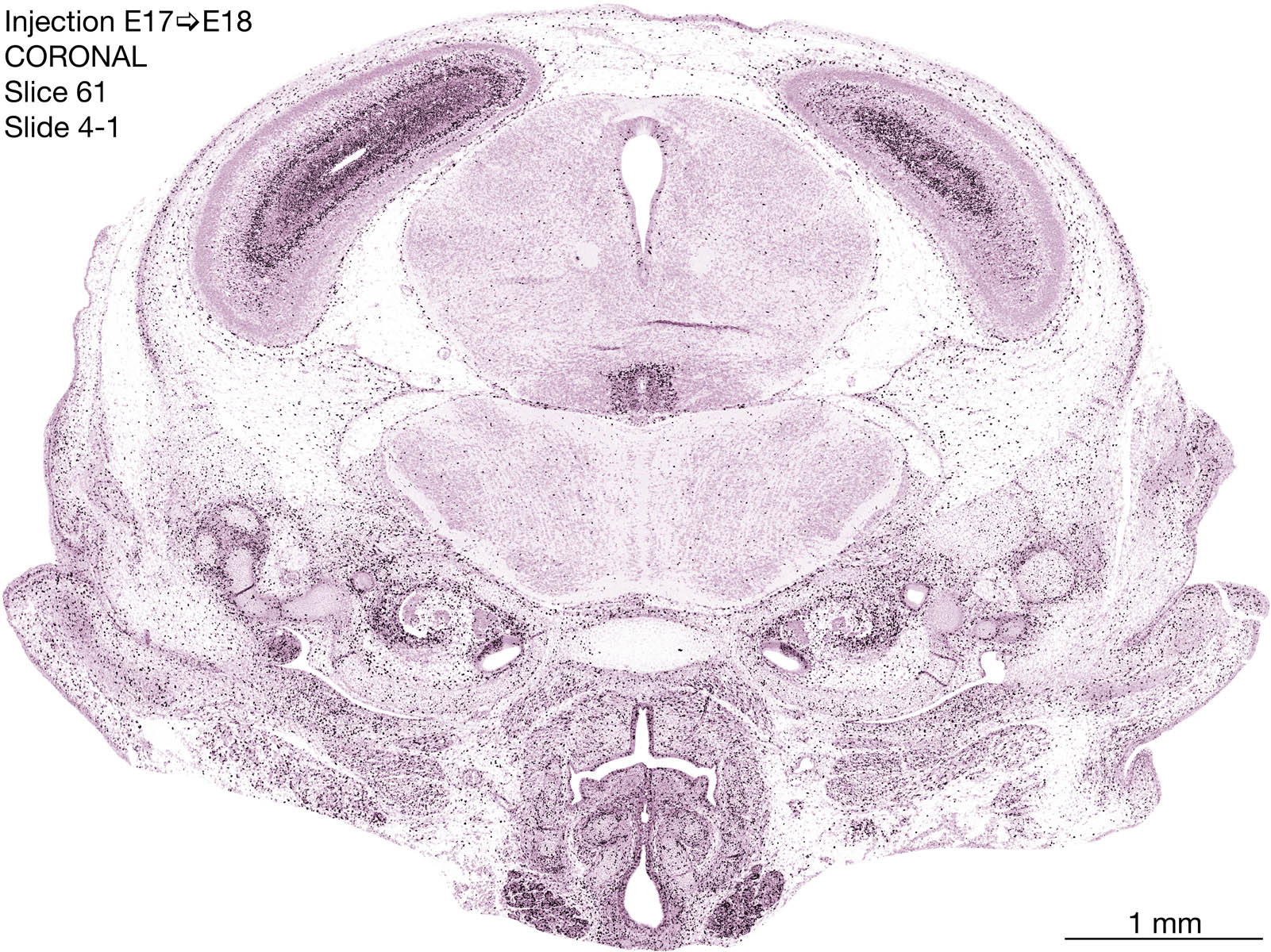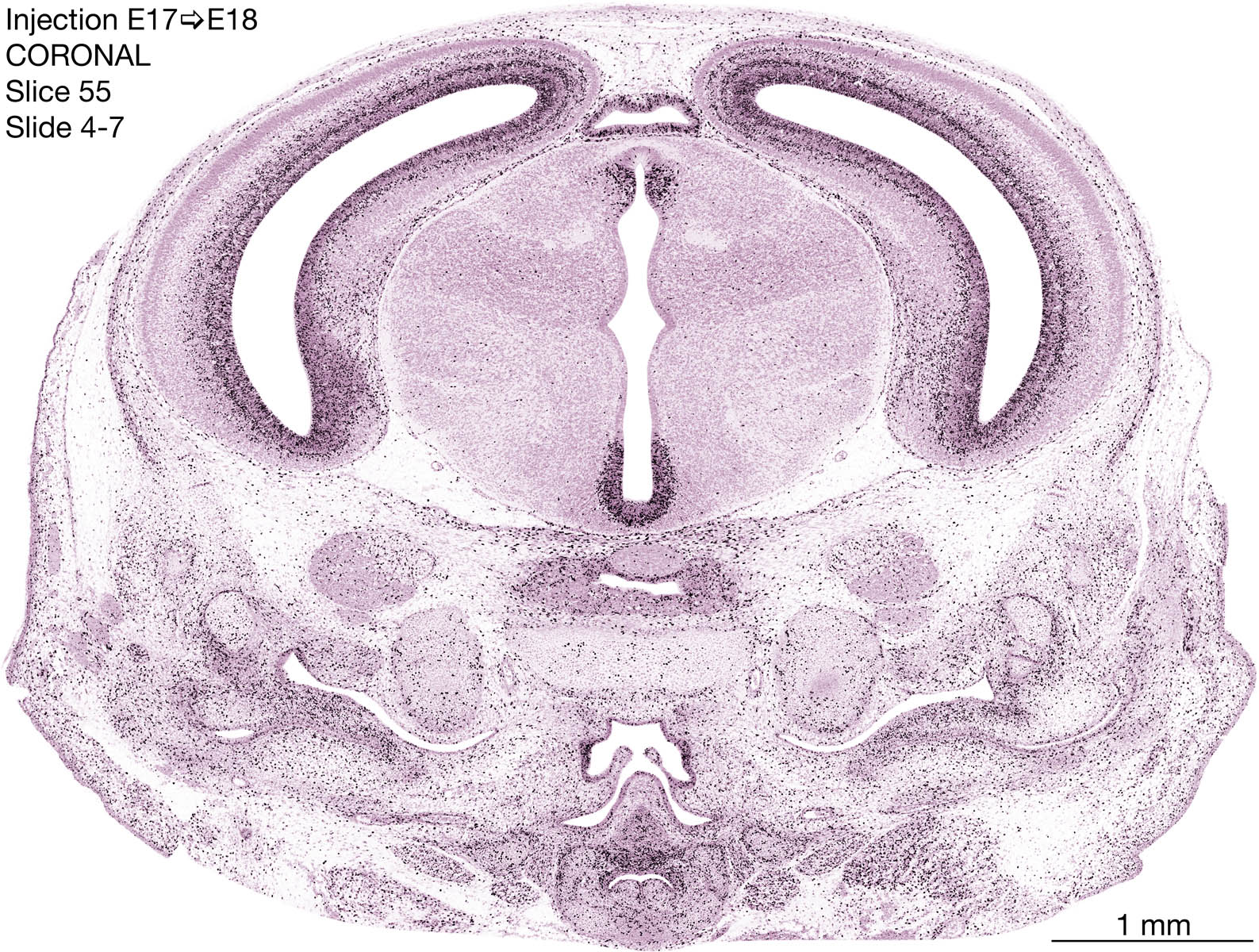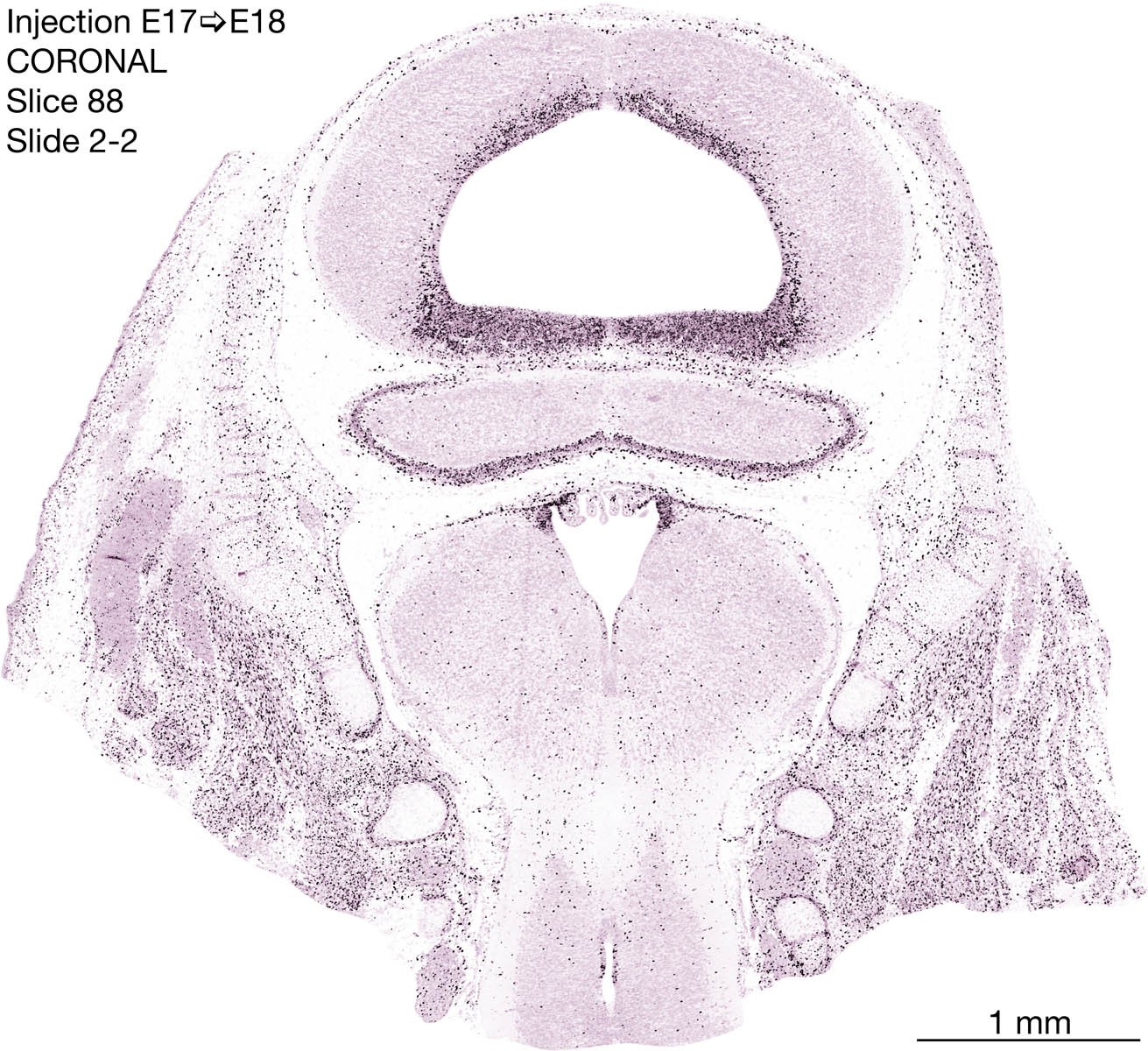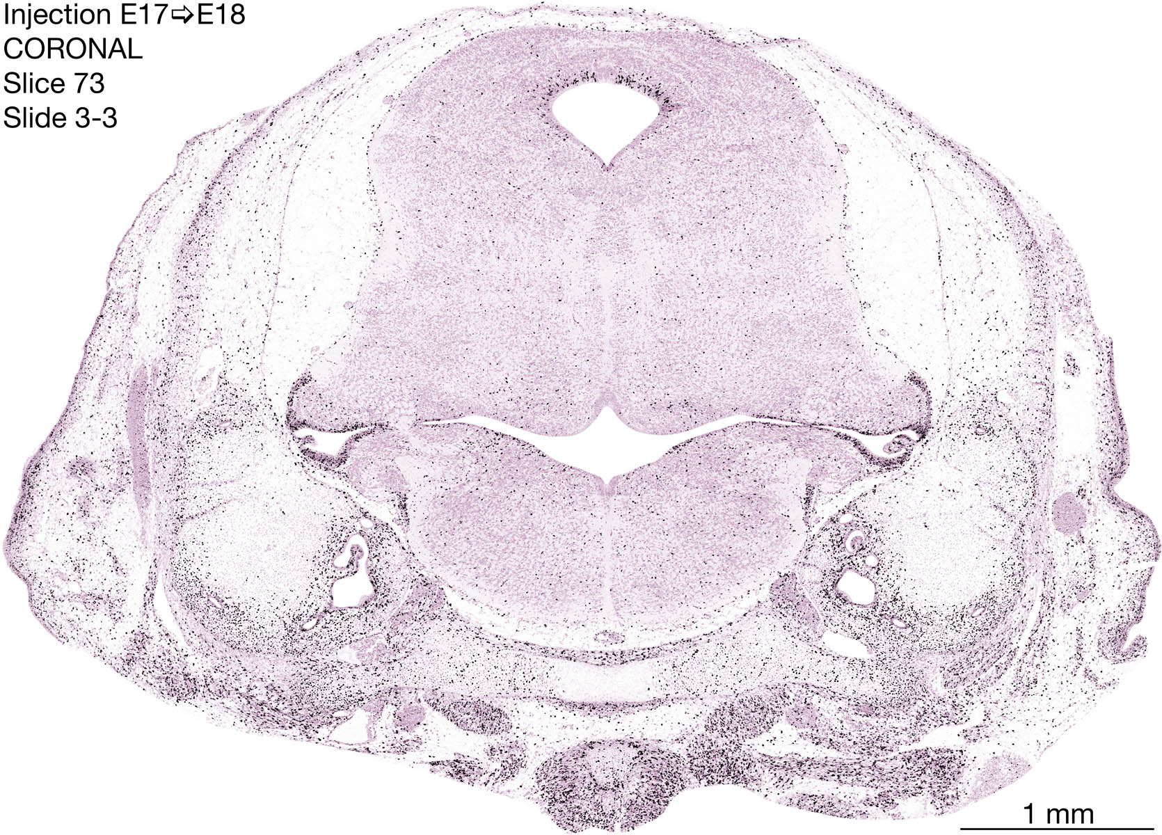 The following images are from a coronally-sectioned head of an E18 rat embryo exposed to tritiated thymidine on E17–24 hr survival. Note the heavily-labeled cells just outside the germinal zones are now mainly in the diencephalon and forebrain. These are postmitotic young neurons generated ON E17. Note that the banded labeling is prominent outside the neocortical neuroepithelium. Many of the germinal zones in the brainstem have become transformed into the primitive ependyma, and the entire brainstem is becoming more mature; the only primitive area is the cerebellum, where the external germinal layer is now more prominent.