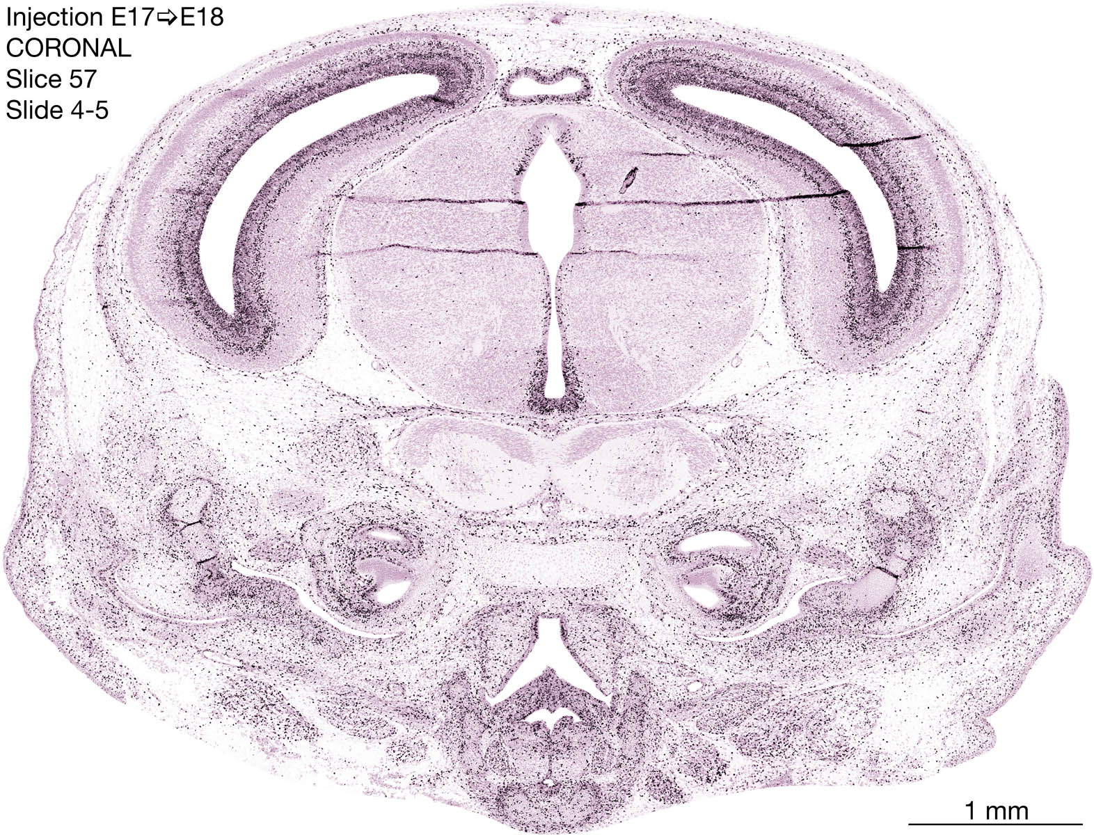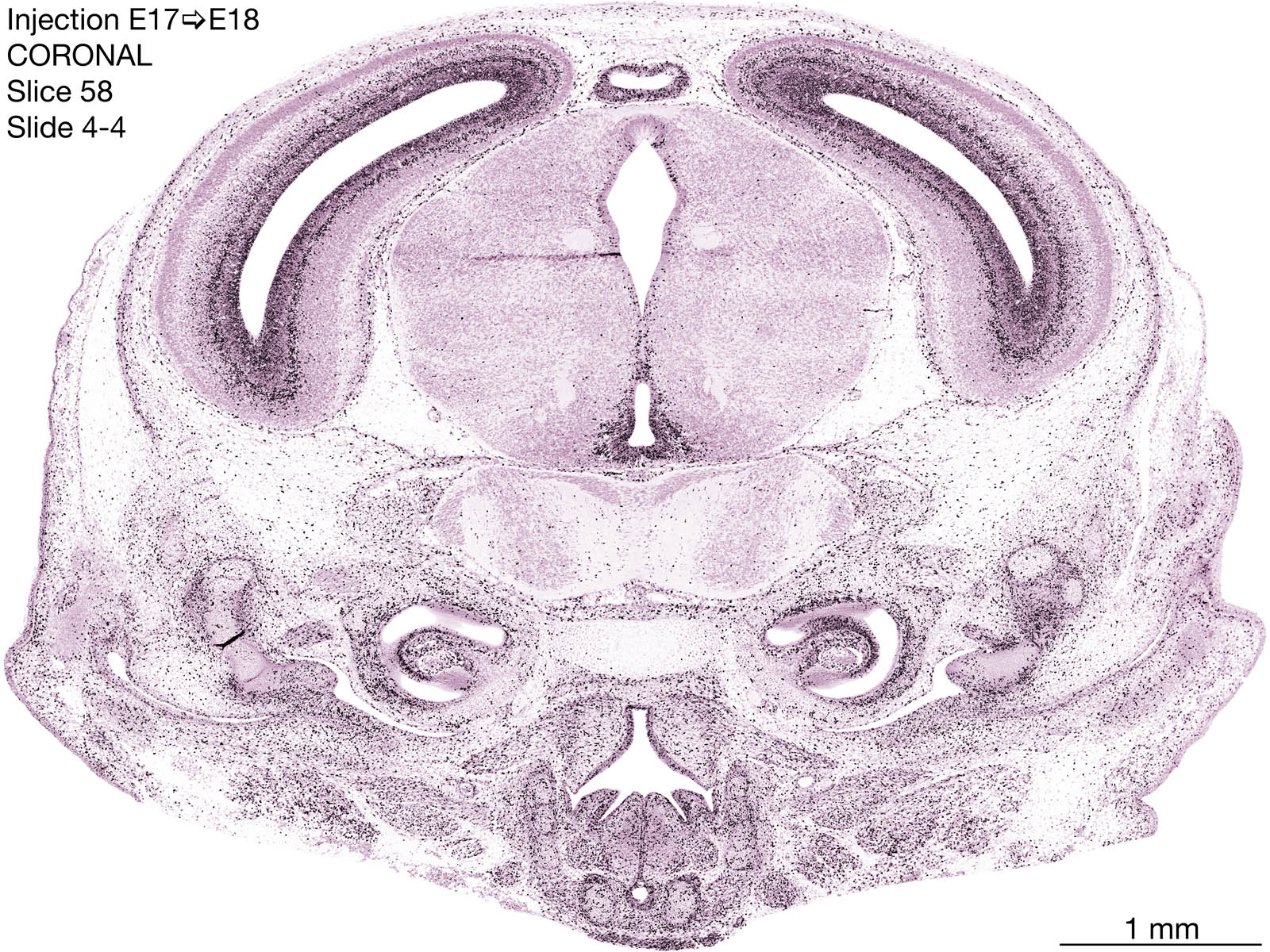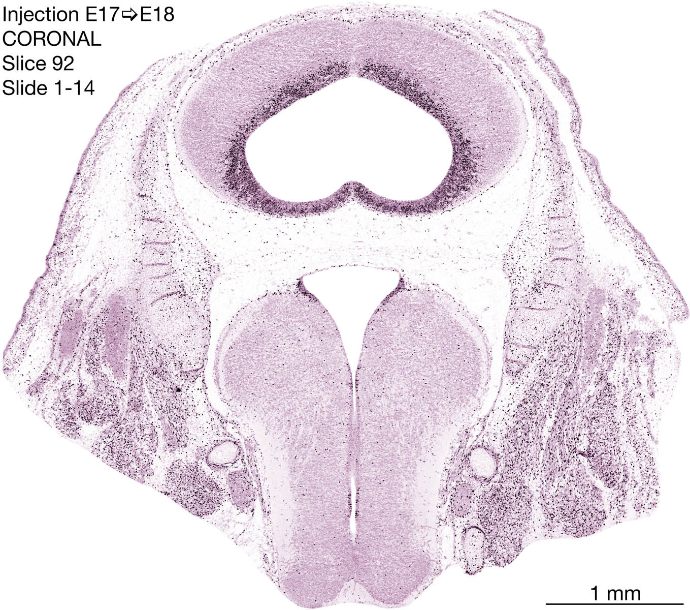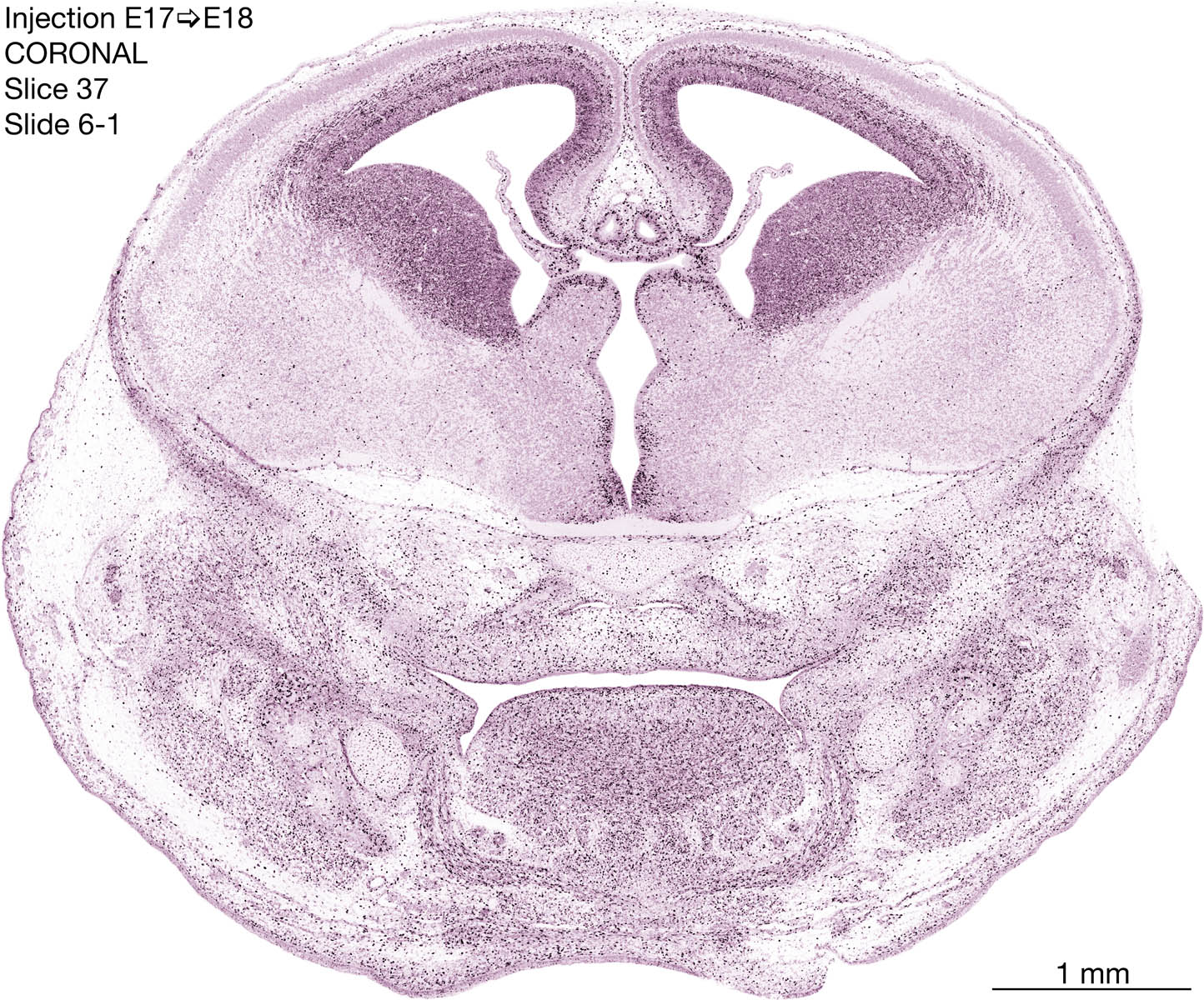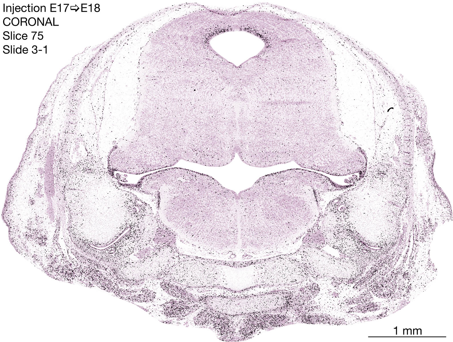 The following images are from a coronally-sectioned head of an E18 rat embryo exposed to tritiated thymidine on E17–24 hr survival. Note the heavily-labeled cells just outside the germinal zones are now mainly in the diencephalon and forebrain. These are postmitotic young neurons generated ON E17. Note that the banded labeling is prominent outside the neocortical neuroepithelium. Many of the germinal zones in the brainstem have become transformed into the primitive ependyma, and the entire brainstem is becoming more mature; the only primitive area is the cerebellum, where the external germinal layer is now more prominent.