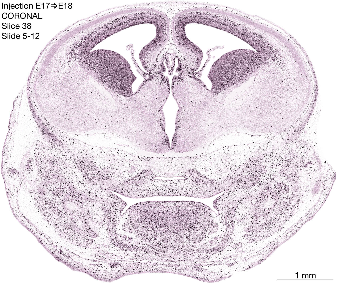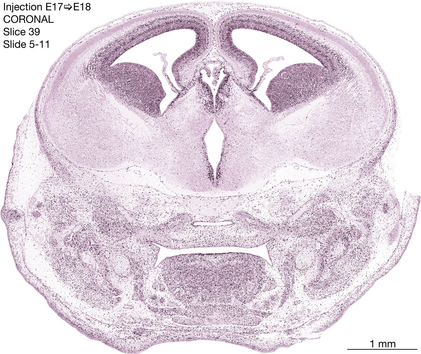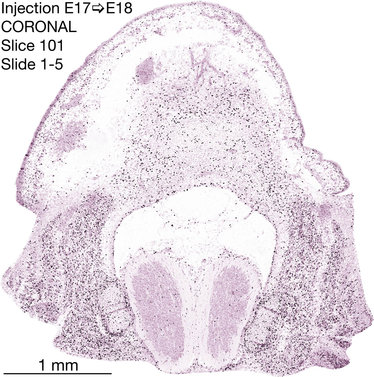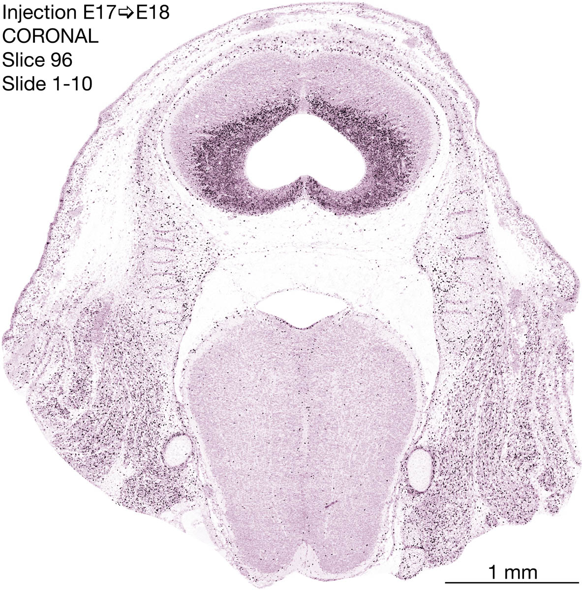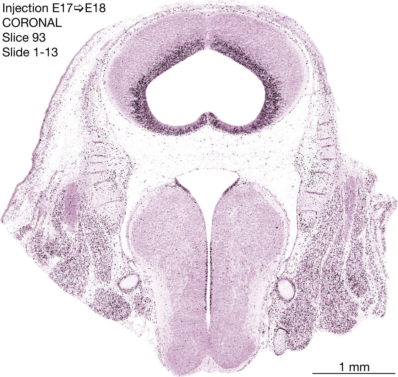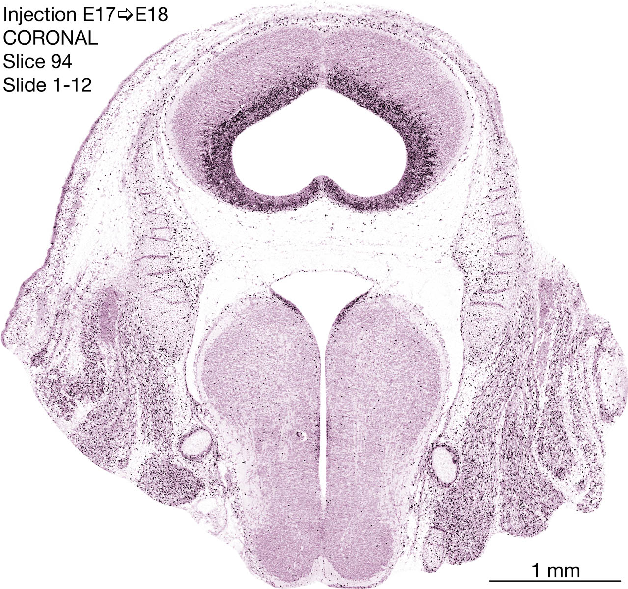 The following images are from a coronally-sectioned head of an E18 rat embryo exposed to tritiated thymidine on E17–24 hr survival. Note the heavily-labeled cells just outside the germinal zones are now mainly in the diencephalon and forebrain. These are postmitotic young neurons generated ON E17. Note that the banded labeling is prominent outside the neocortical neuroepithelium. Many of the germinal zones in the brainstem have become transformed into the primitive ependyma, and the entire brainstem is becoming more mature; the only primitive area is the cerebellum, where the external germinal layer is now more prominent.
