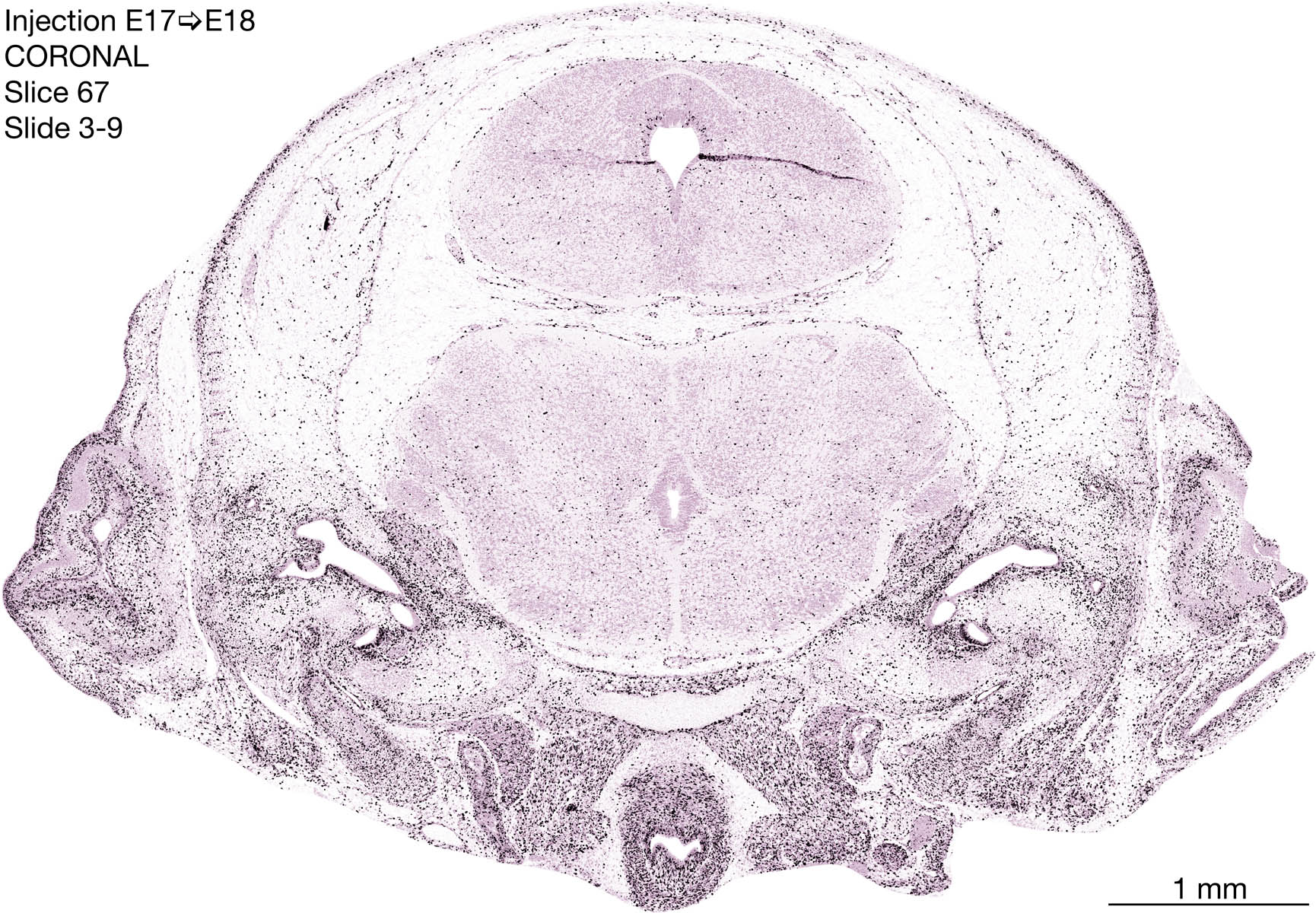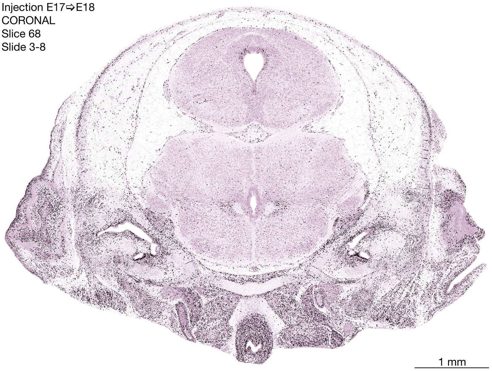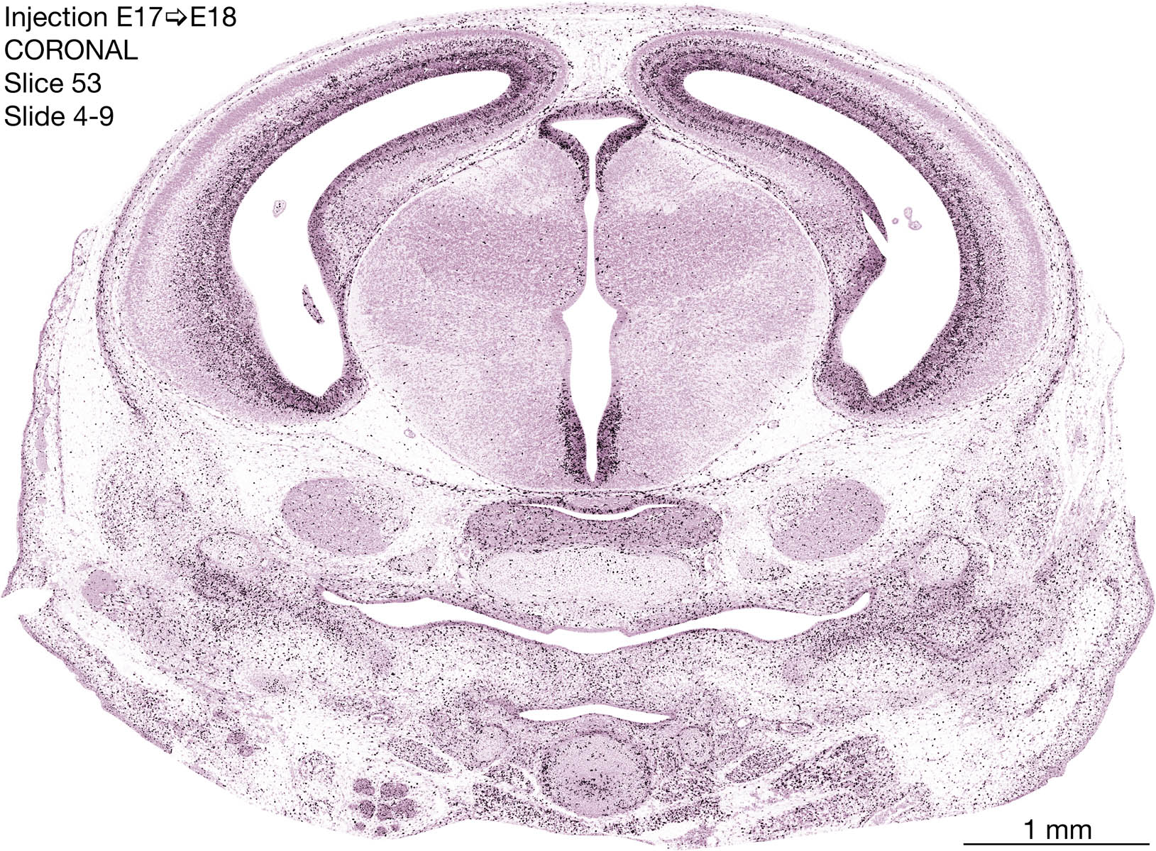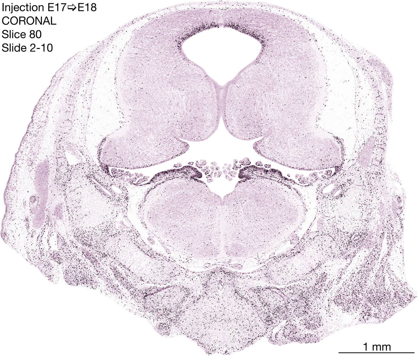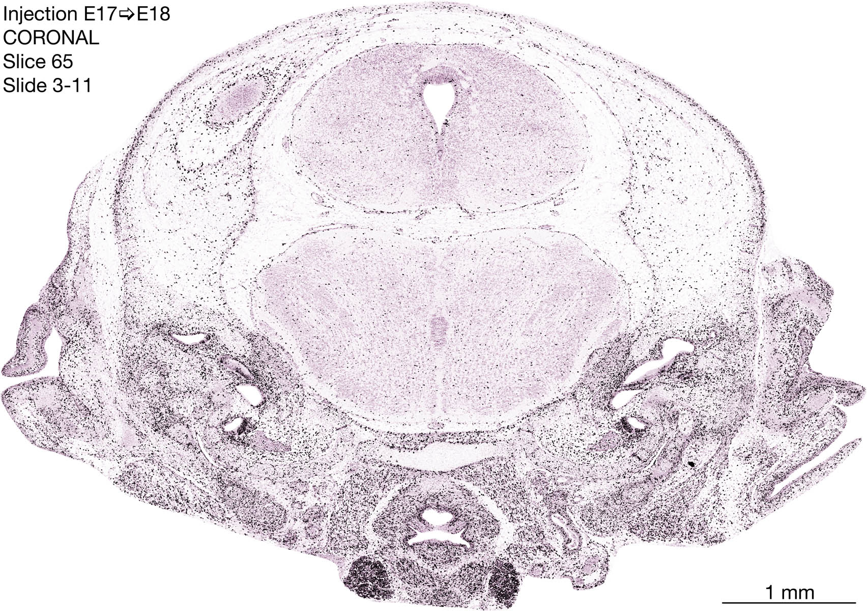 The following images are from a coronally-sectioned head of an E18 rat embryo exposed to tritiated thymidine on E17–24 hr survival. Note the heavily-labeled cells just outside the germinal zones are now mainly in the diencephalon and forebrain. These are postmitotic young neurons generated ON E17. Note that the banded labeling is prominent outside the neocortical neuroepithelium. Many of the germinal zones in the brainstem have become transformed into the primitive ependyma, and the entire brainstem is becoming more mature; the only primitive area is the cerebellum, where the external germinal layer is now more prominent.