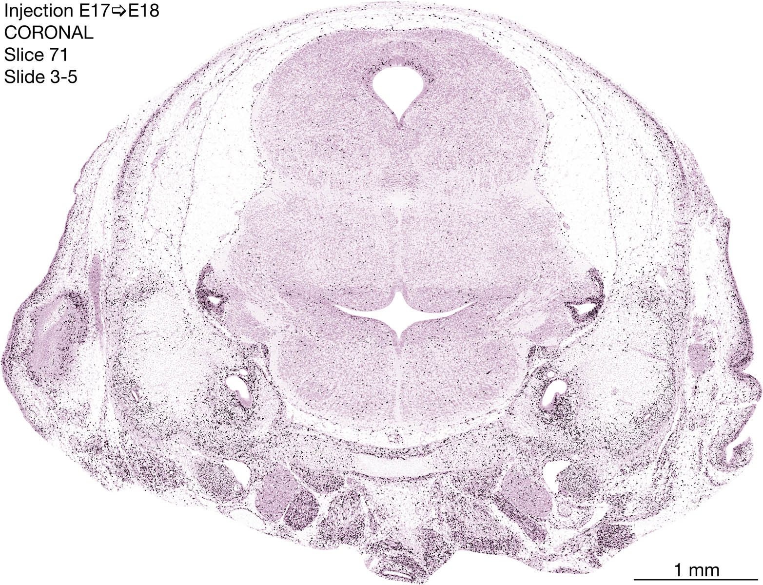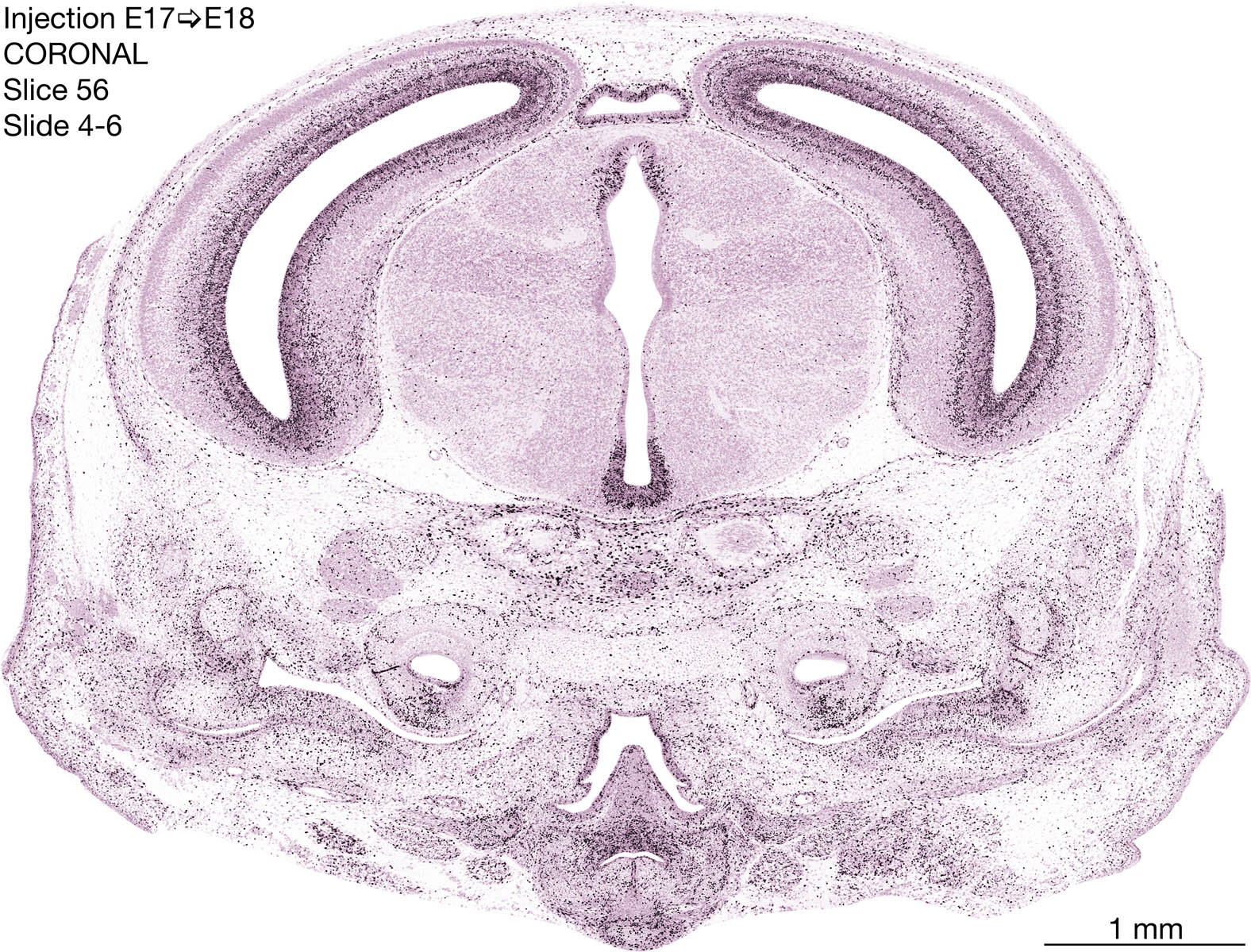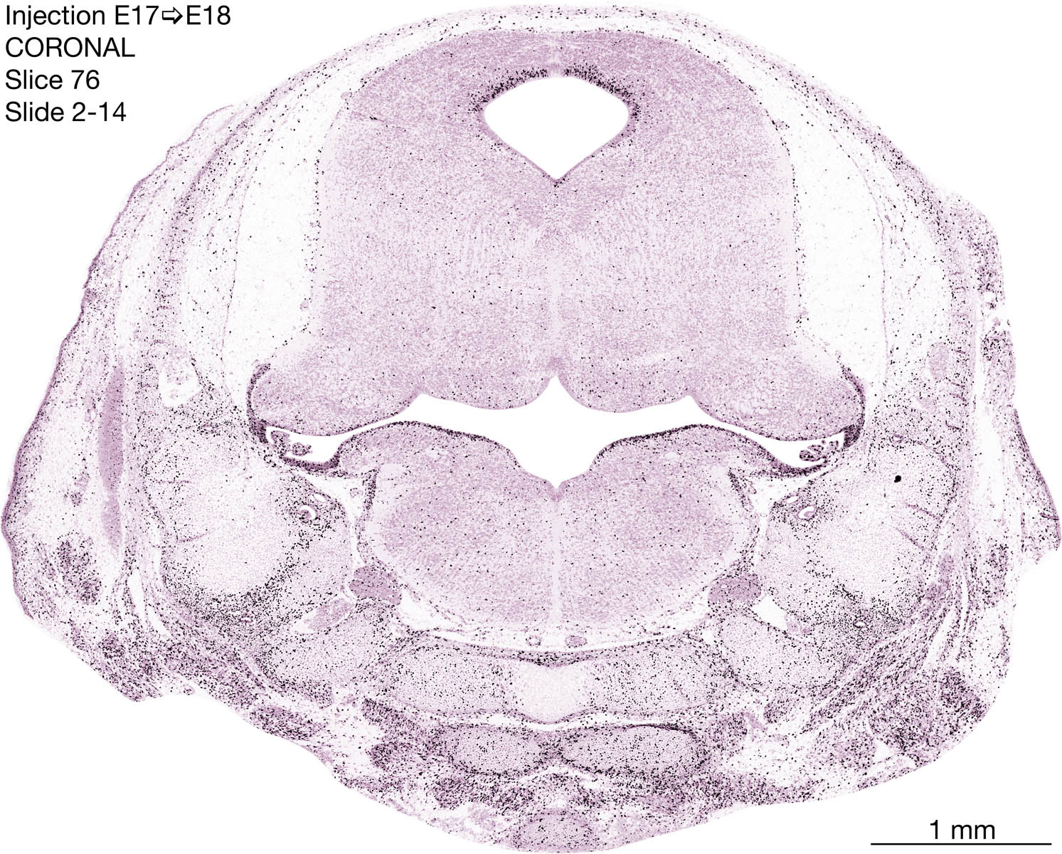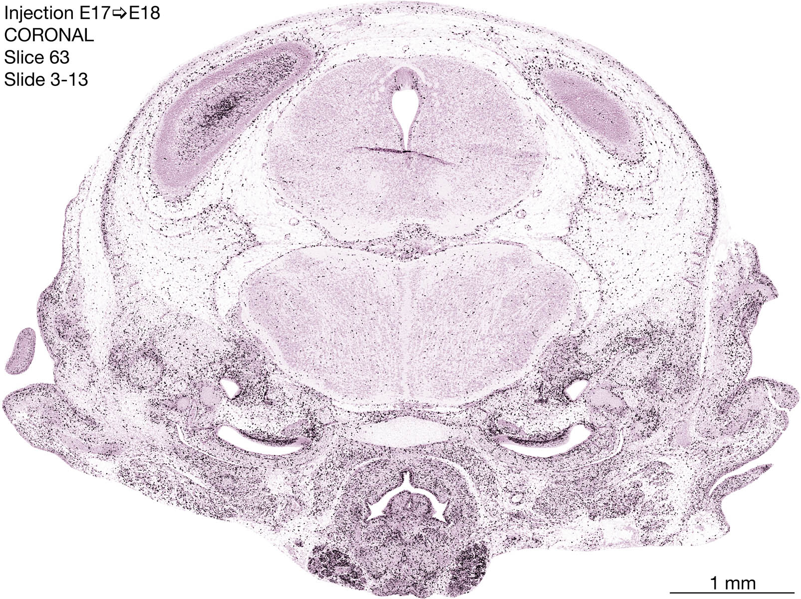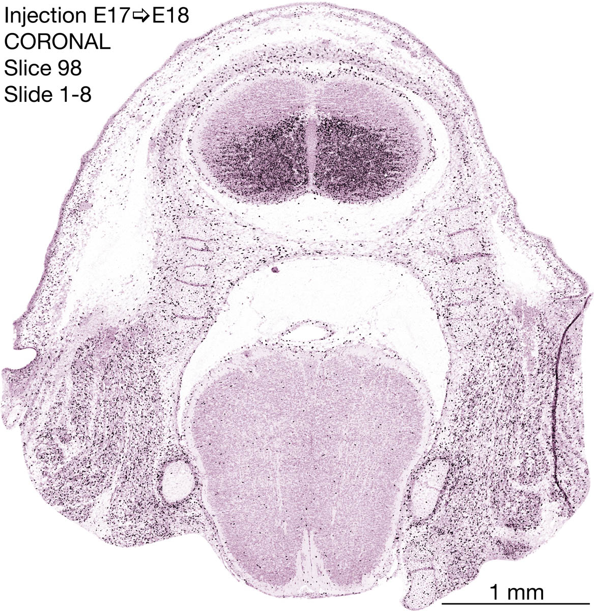 The following images are from a coronally-sectioned head of an E18 rat embryo exposed to tritiated thymidine on E17–24 hr survival. Note the heavily-labeled cells just outside the germinal zones are now mainly in the diencephalon and forebrain. These are postmitotic young neurons generated ON E17. Note that the banded labeling is prominent outside the neocortical neuroepithelium. Many of the germinal zones in the brainstem have become transformed into the primitive ependyma, and the entire brainstem is becoming more mature; the only primitive area is the cerebellum, where the external germinal layer is now more prominent.