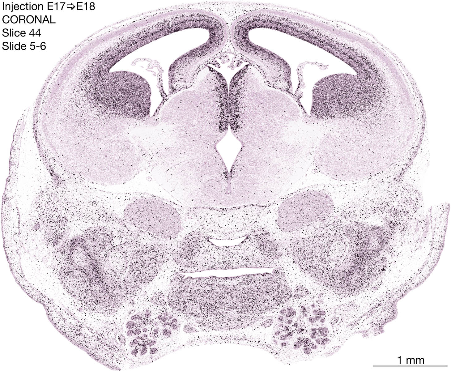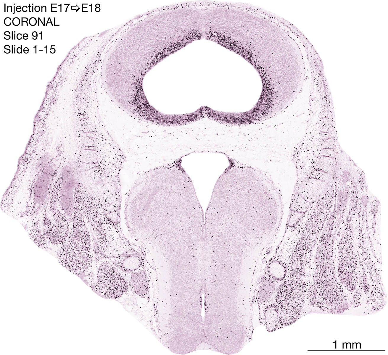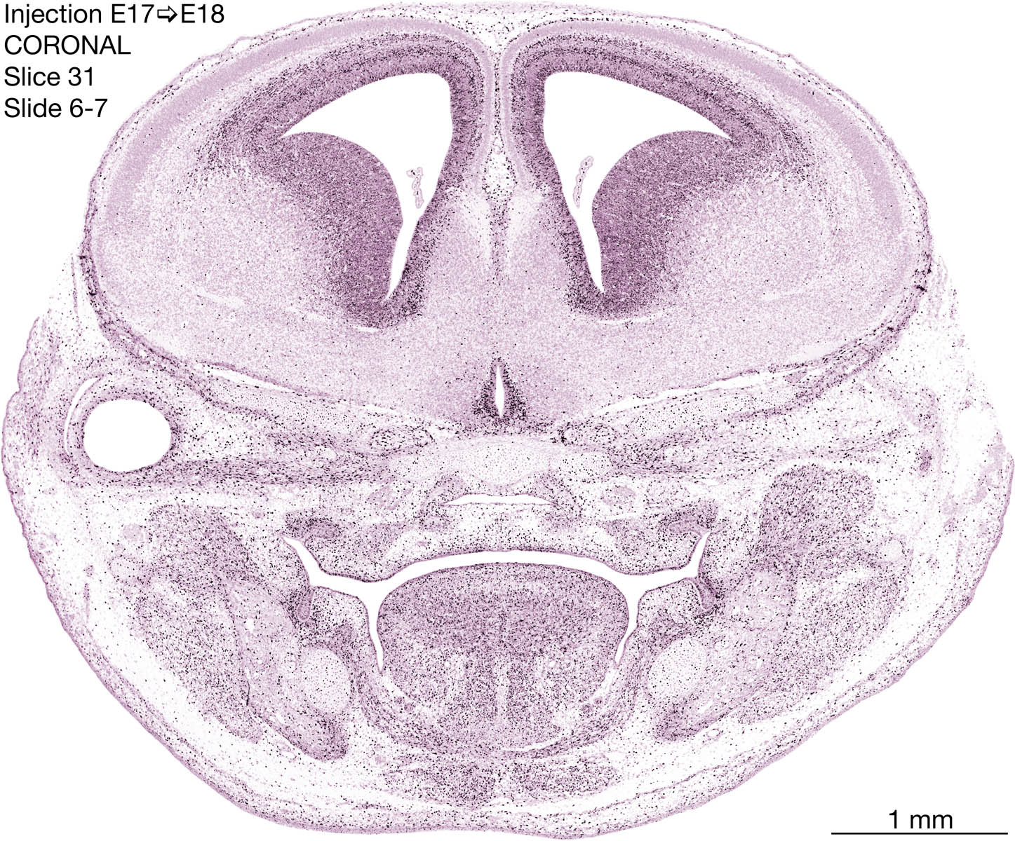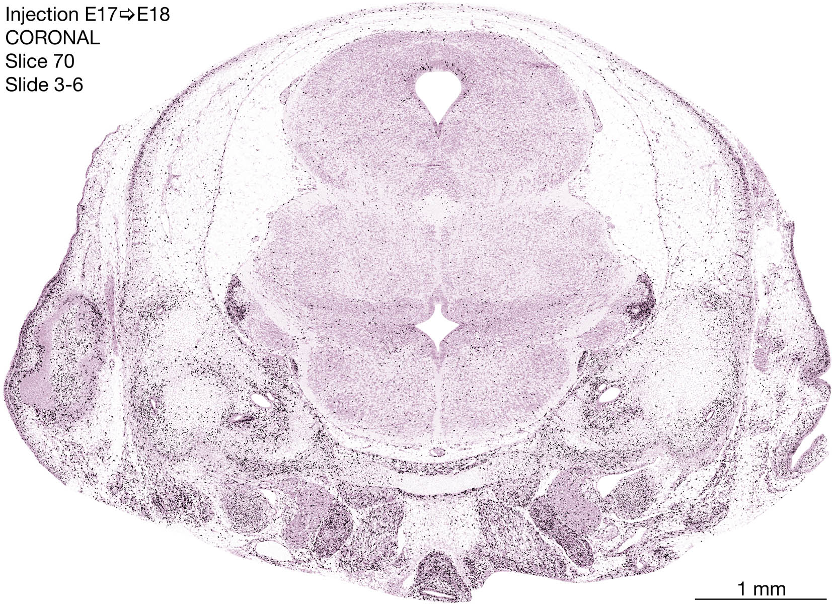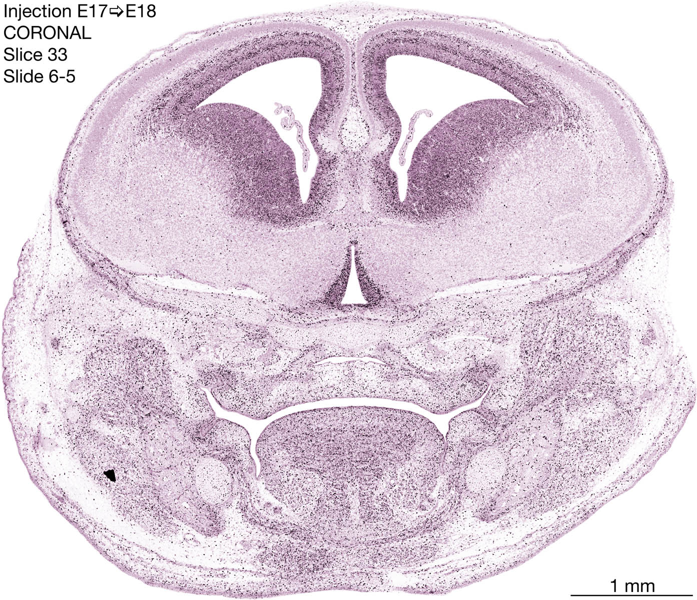 The following images are from a coronally-sectioned head of an E18 rat embryo exposed to tritiated thymidine on E17–24 hr survival. Note the heavily-labeled cells just outside the germinal zones are now mainly in the diencephalon and forebrain. These are postmitotic young neurons generated ON E17. Note that the banded labeling is prominent outside the neocortical neuroepithelium. Many of the germinal zones in the brainstem have become transformed into the primitive ependyma, and the entire brainstem is becoming more mature; the only primitive area is the cerebellum, where the external germinal layer is now more prominent.