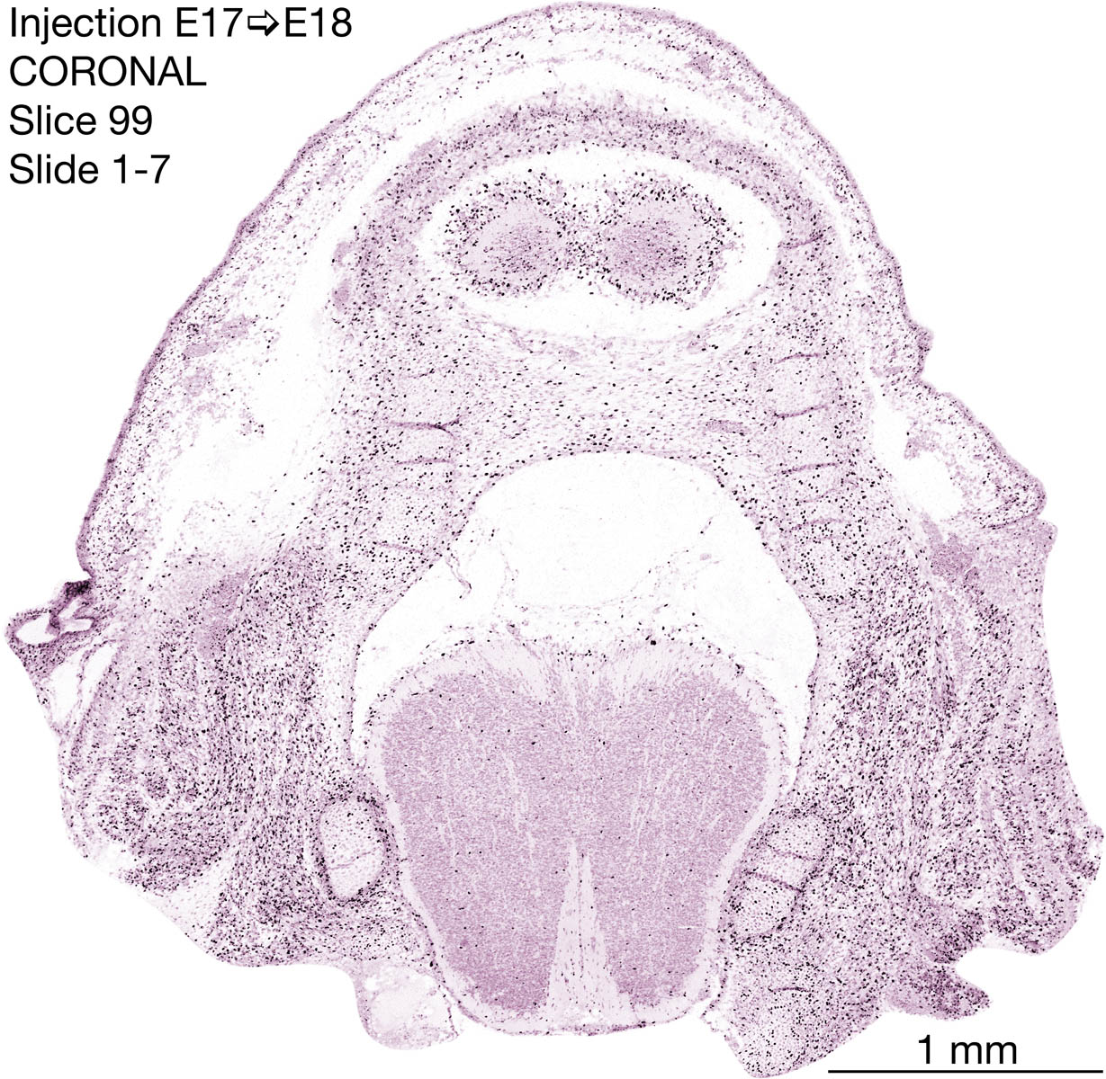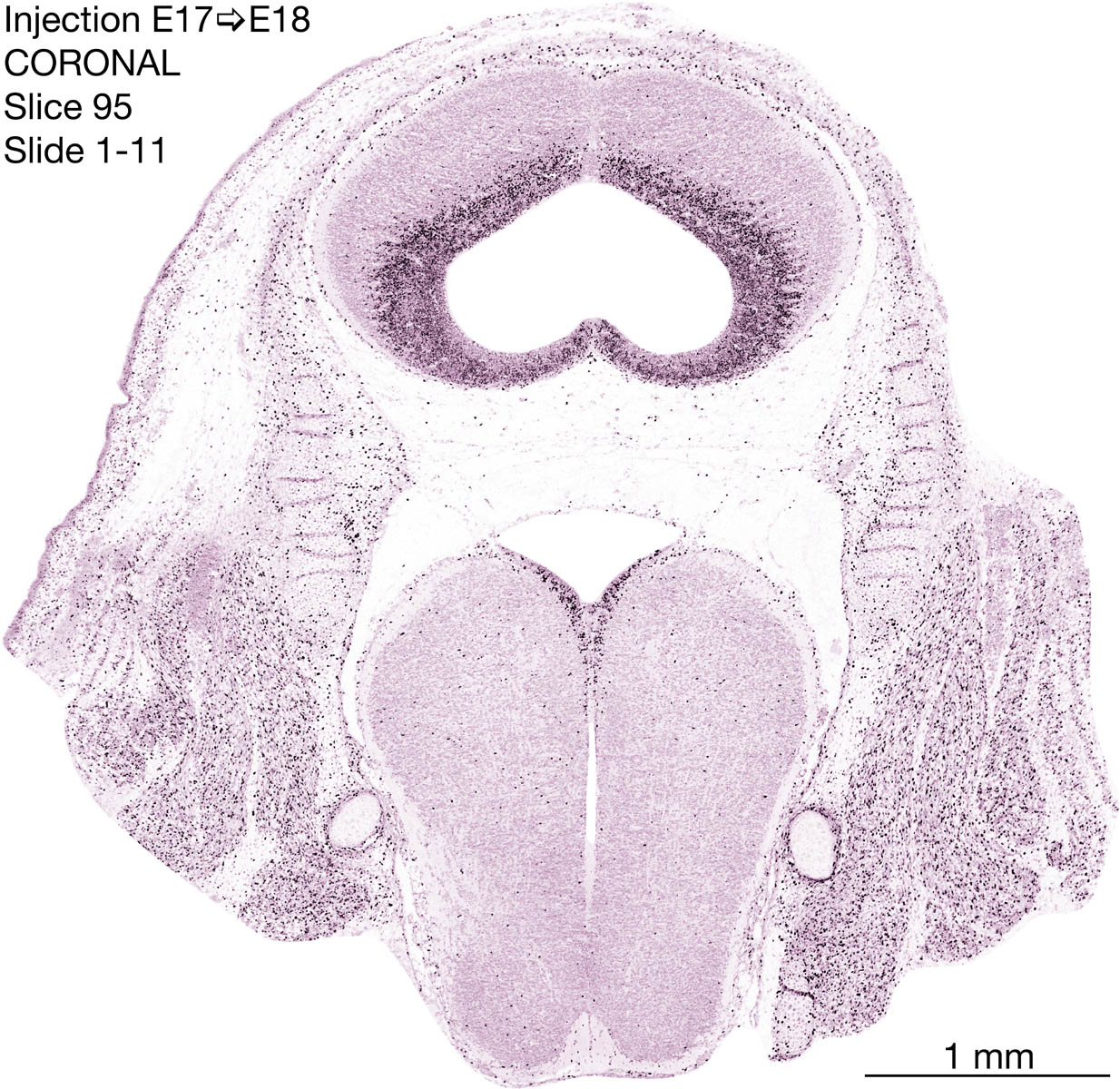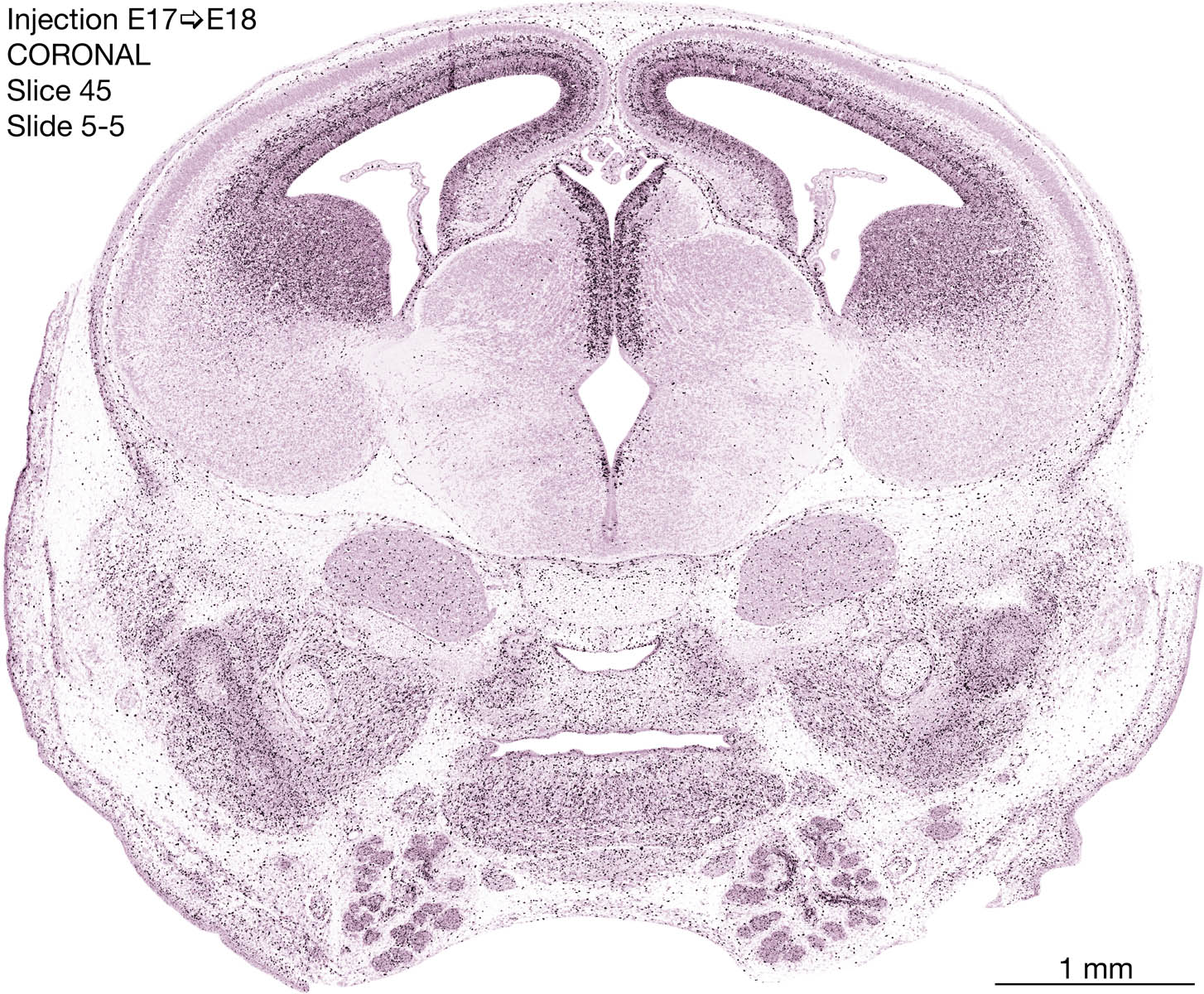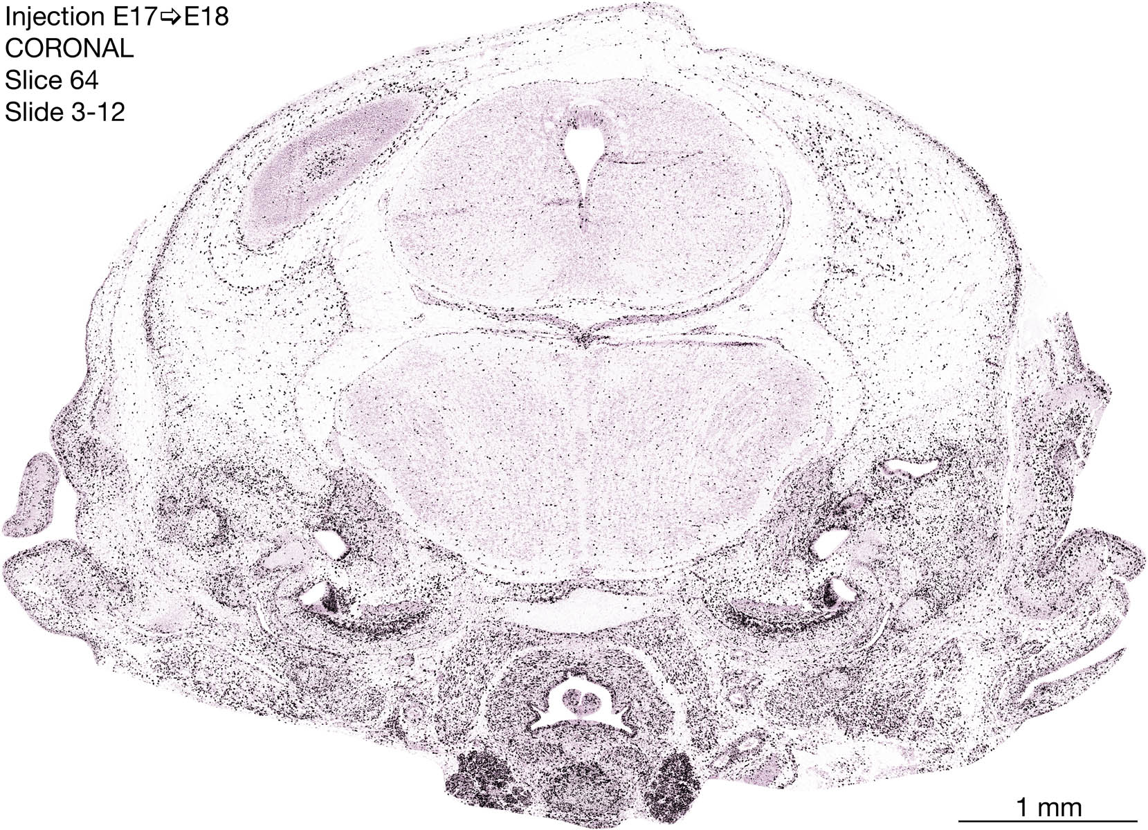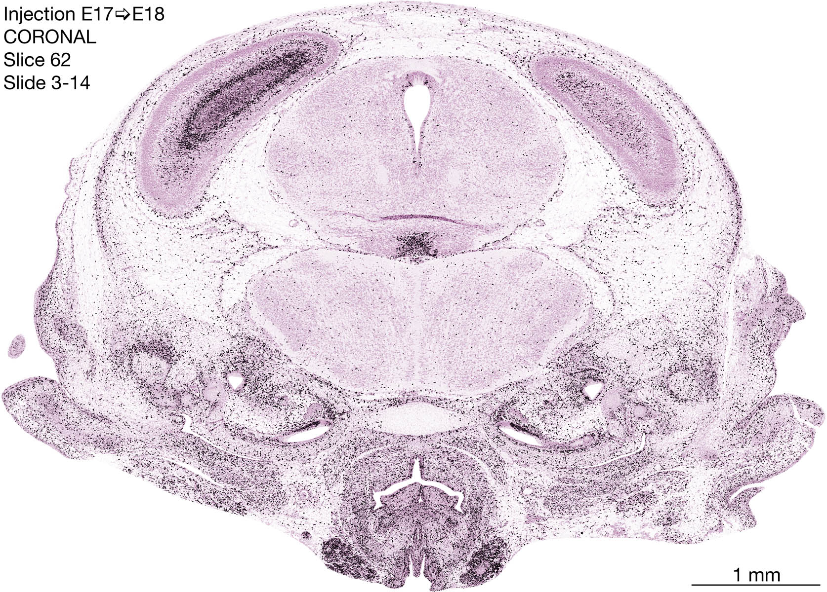 The following images are from a coronally-sectioned head of an E18 rat embryo exposed to tritiated thymidine on E17–24 hr survival. Note the heavily-labeled cells just outside the germinal zones are now mainly in the diencephalon and forebrain. These are postmitotic young neurons generated ON E17. Note that the banded labeling is prominent outside the neocortical neuroepithelium. Many of the germinal zones in the brainstem have become transformed into the primitive ependyma, and the entire brainstem is becoming more mature; the only primitive area is the cerebellum, where the external germinal layer is now more prominent.
