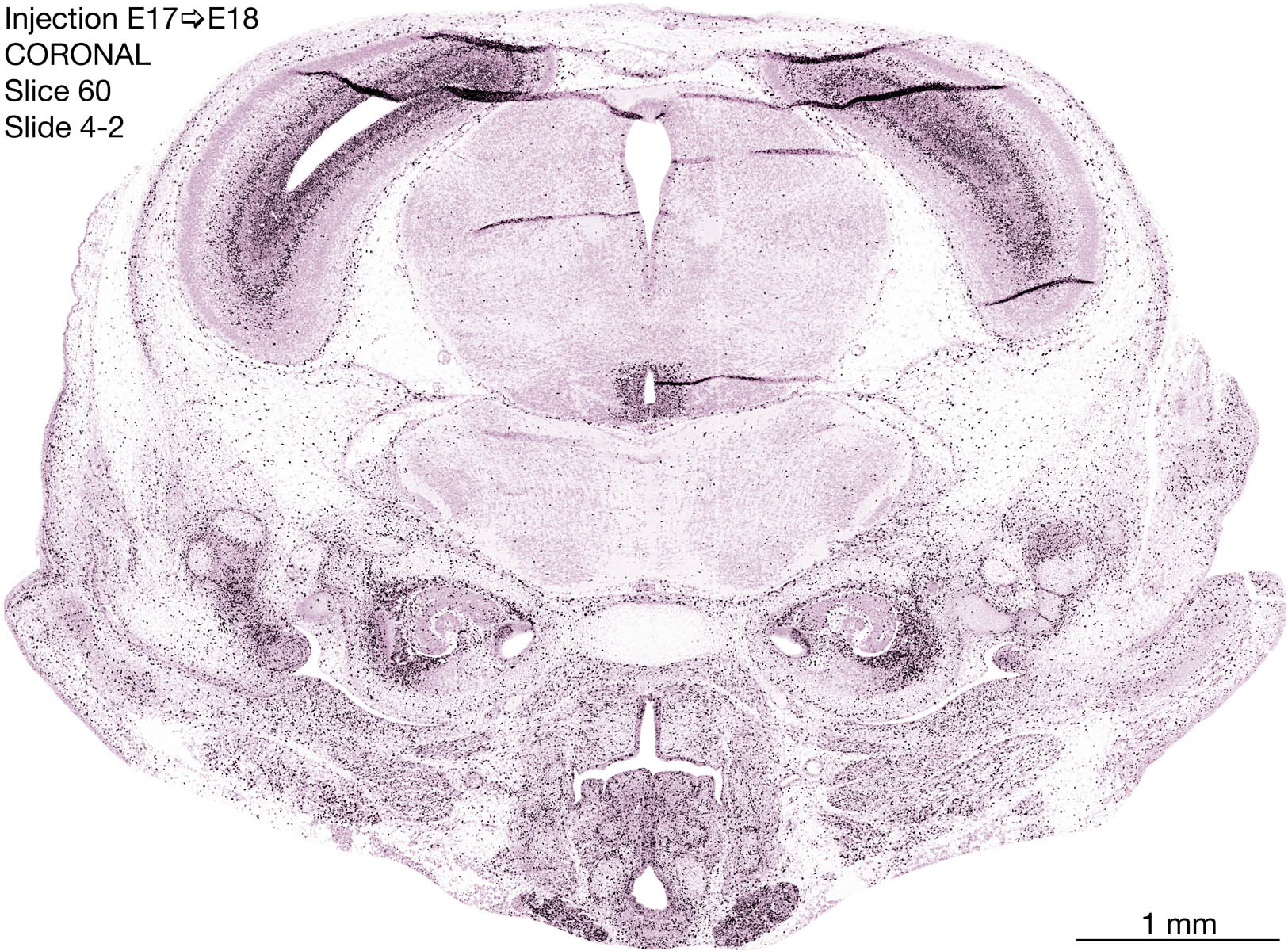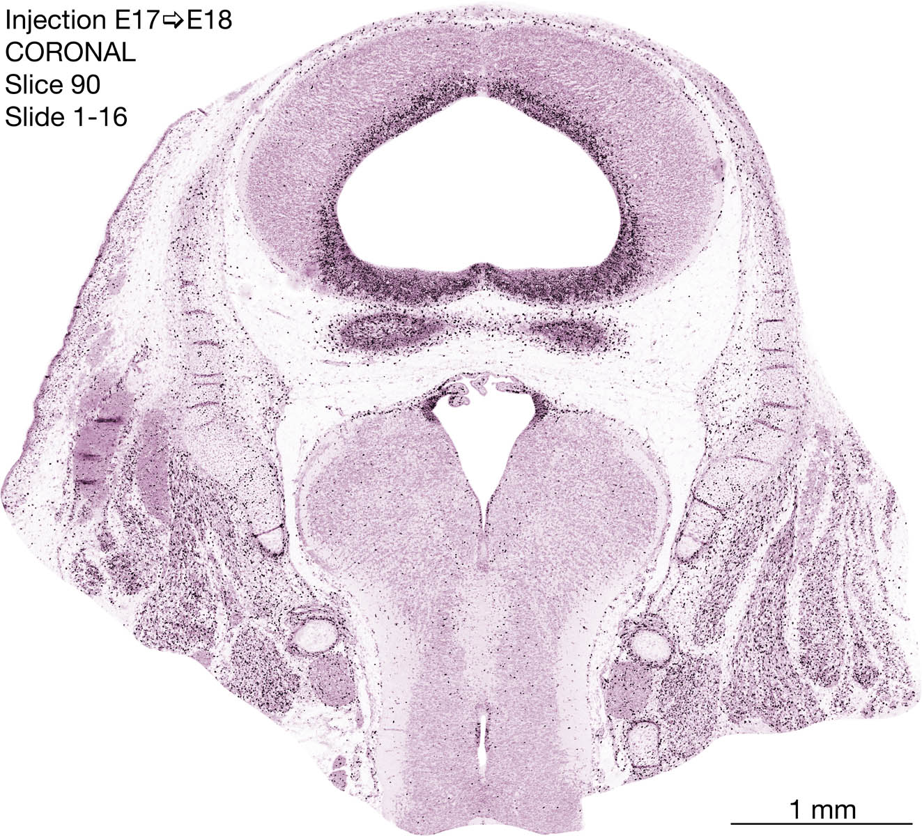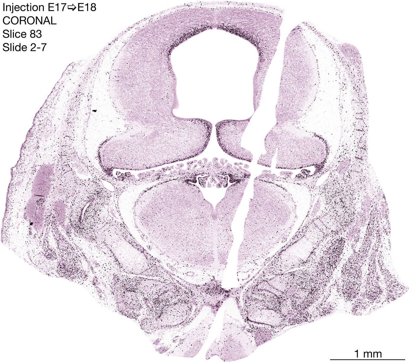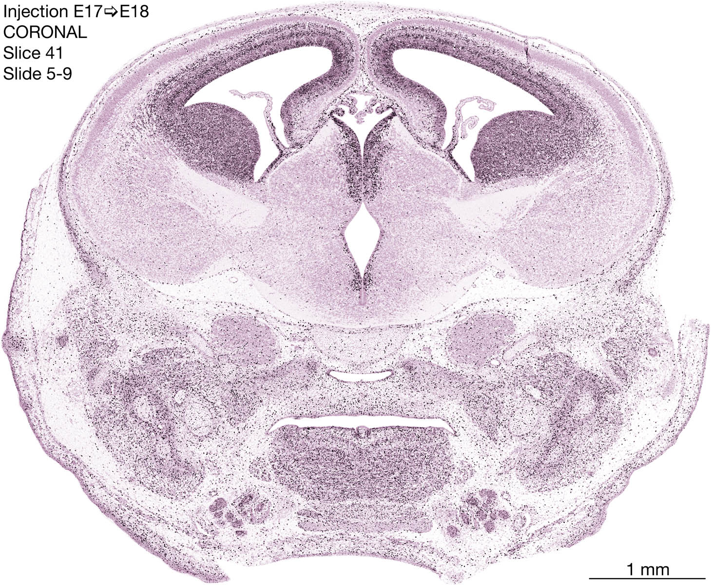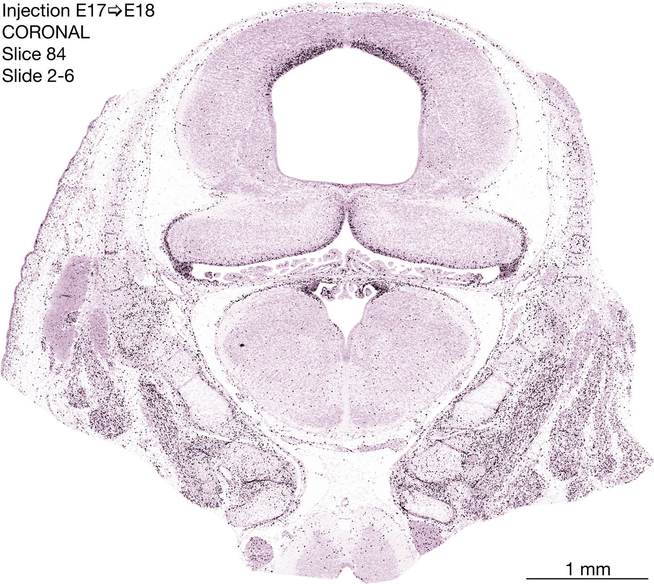 The following images are from a coronally-sectioned head of an E18 rat embryo exposed to tritiated thymidine on E17–24 hr survival. Note the heavily-labeled cells just outside the germinal zones are now mainly in the diencephalon and forebrain. These are postmitotic young neurons generated ON E17. Note that the banded labeling is prominent outside the neocortical neuroepithelium. Many of the germinal zones in the brainstem have become transformed into the primitive ependyma, and the entire brainstem is becoming more mature; the only primitive area is the cerebellum, where the external germinal layer is now more prominent.