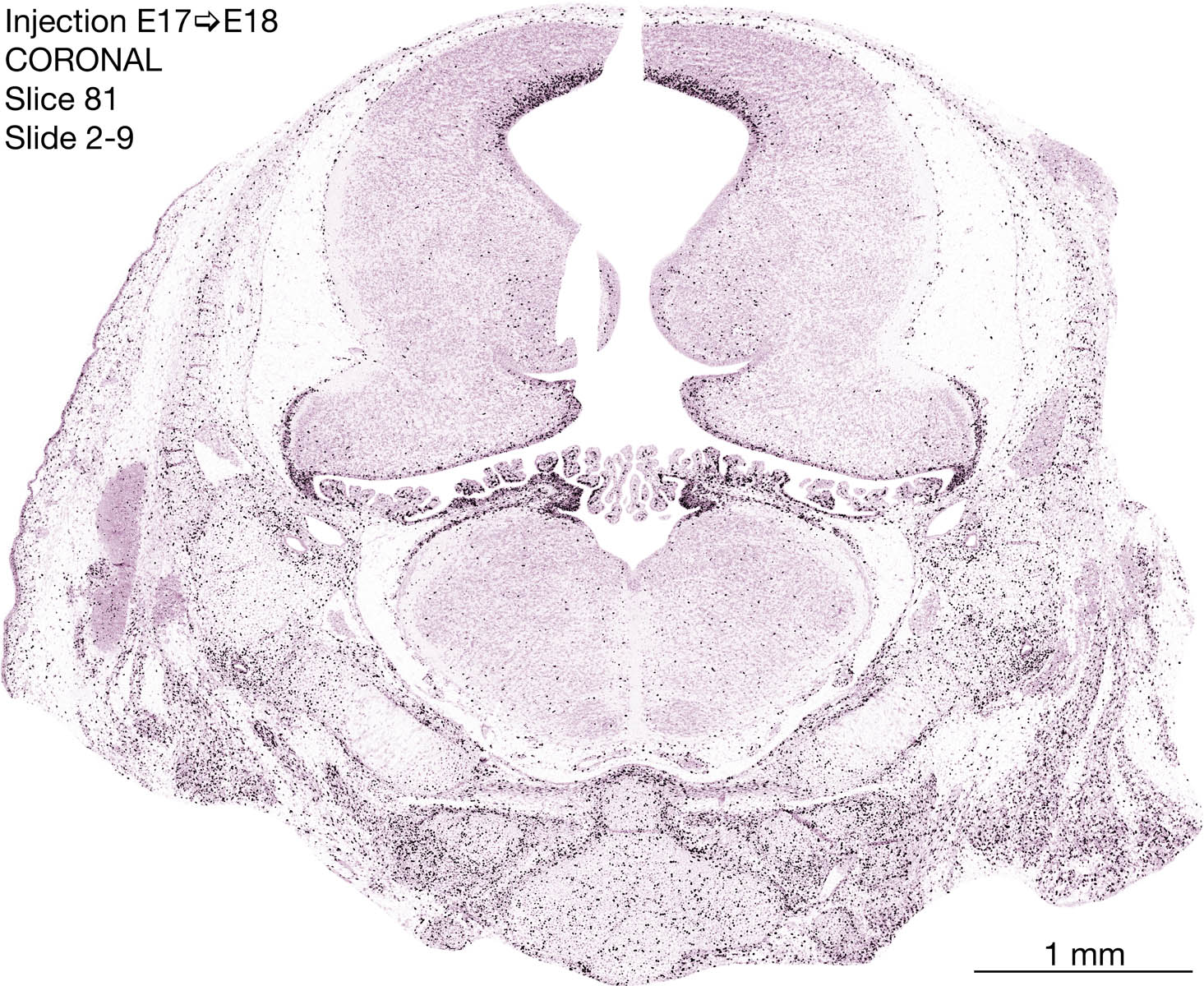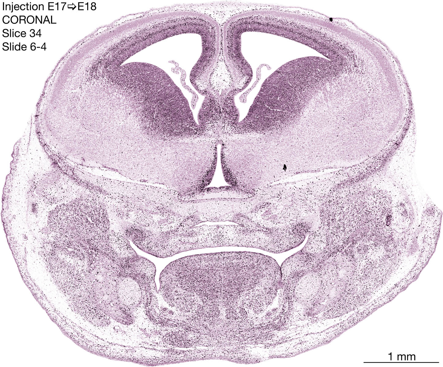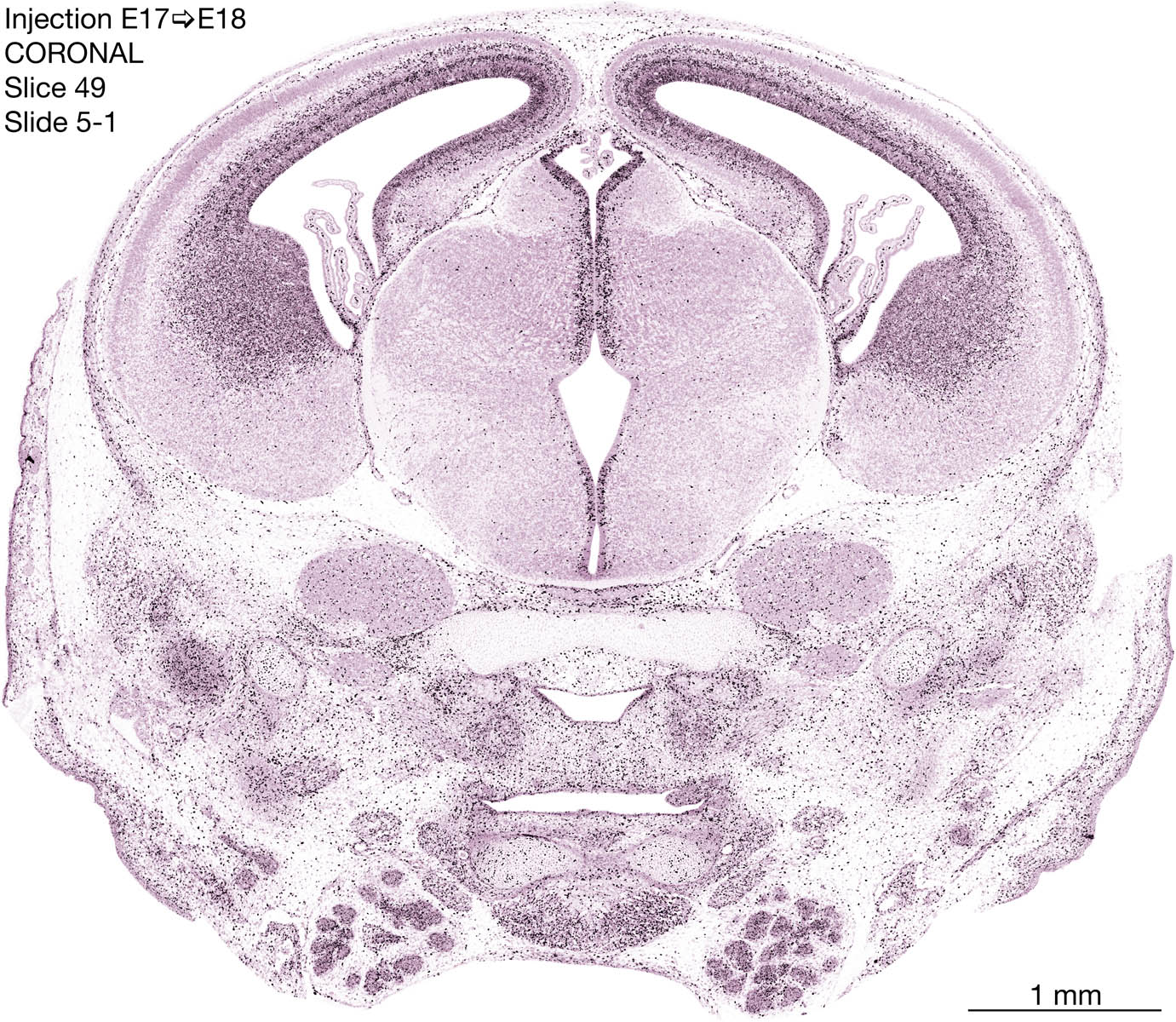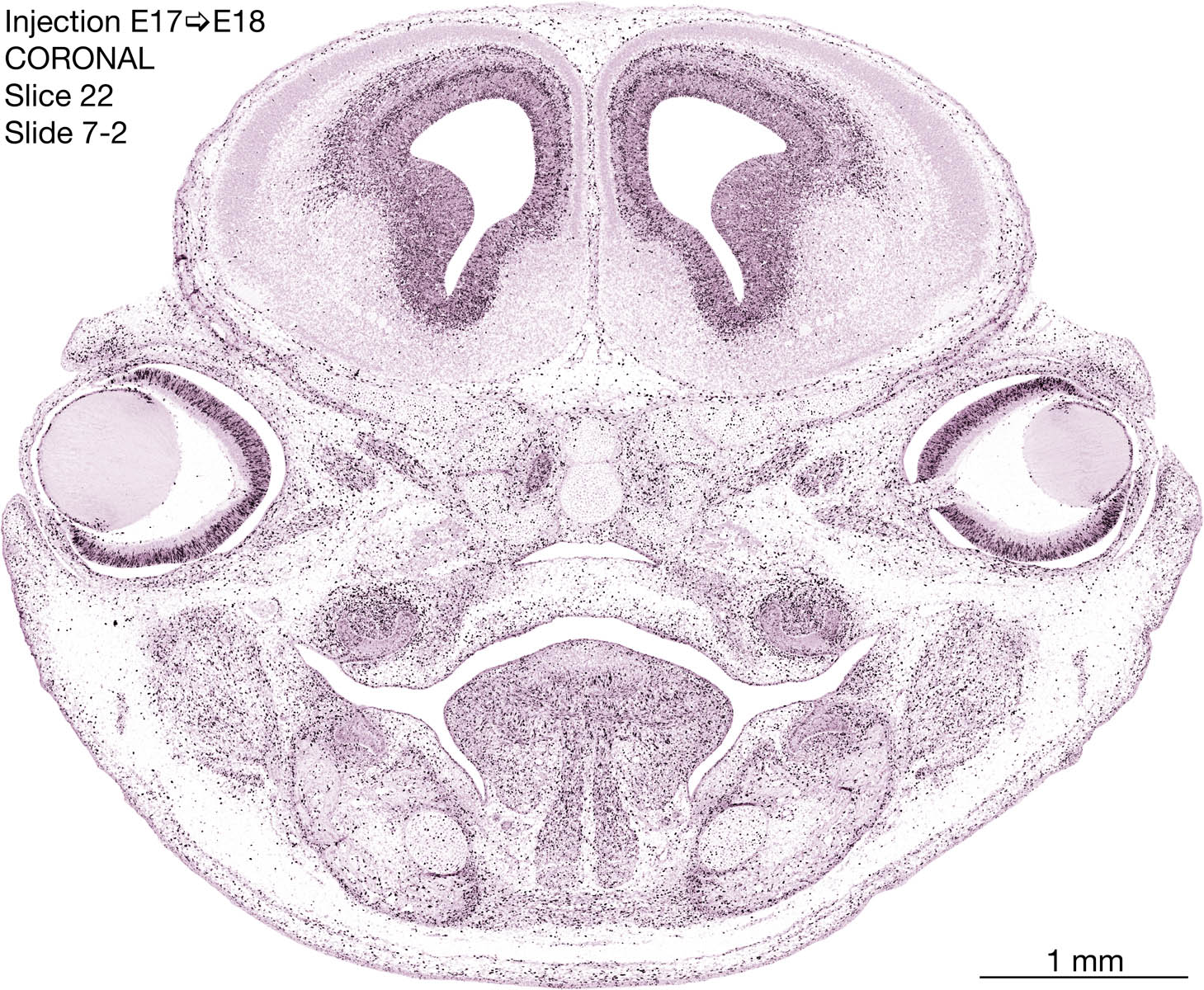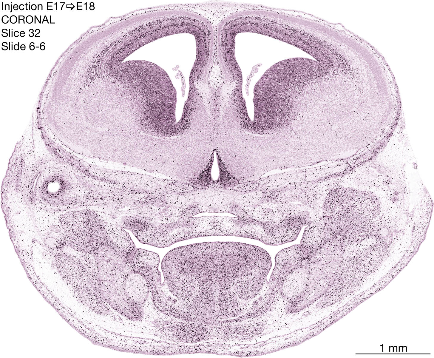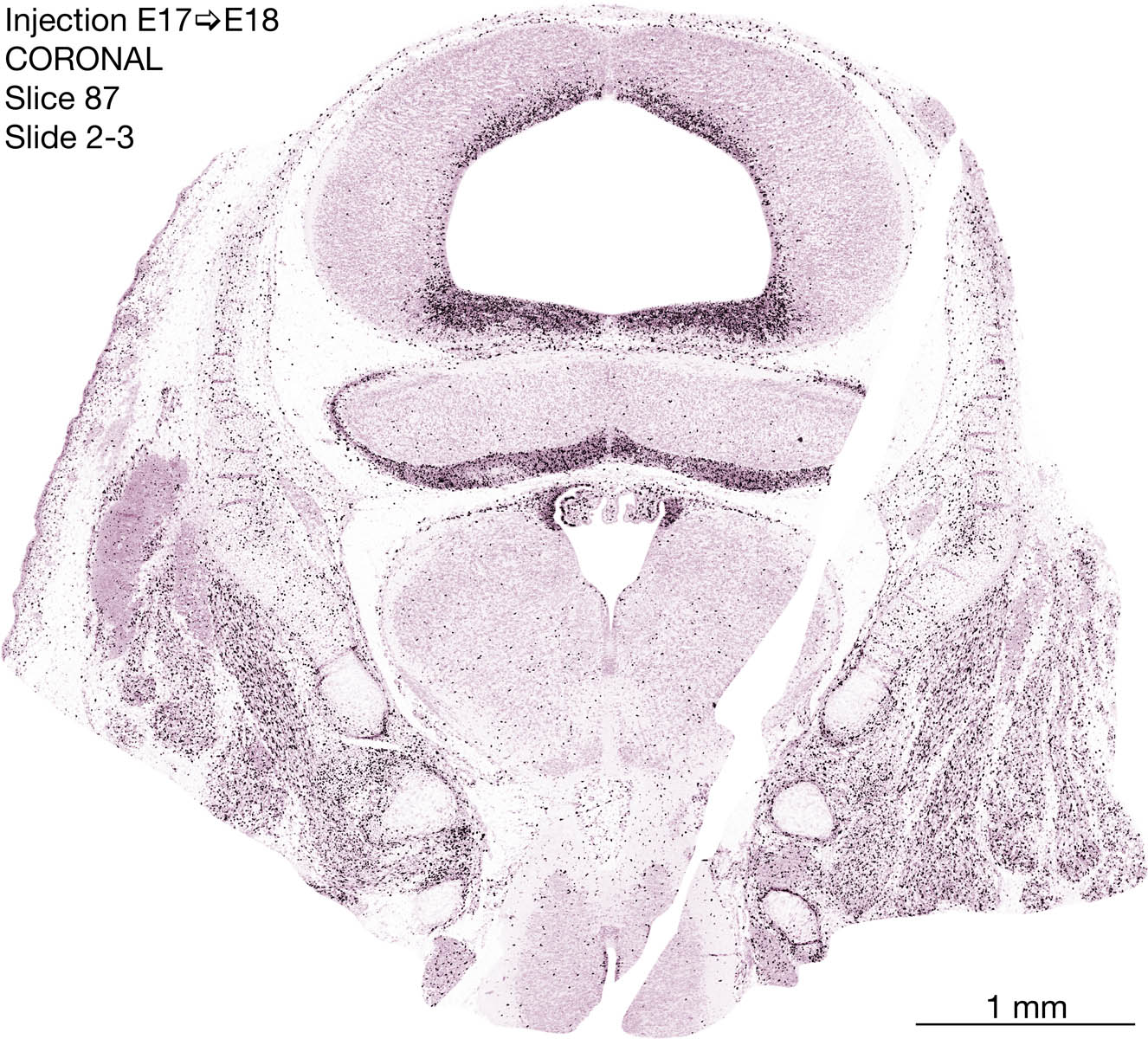 The following images are from a coronally-sectioned head of an E18 rat embryo exposed to tritiated thymidine on E17–24 hr survival. Note the heavily-labeled cells just outside the germinal zones are now mainly in the diencephalon and forebrain. These are postmitotic young neurons generated ON E17. Note that the banded labeling is prominent outside the neocortical neuroepithelium. Many of the germinal zones in the brainstem have become transformed into the primitive ependyma, and the entire brainstem is becoming more mature; the only primitive area is the cerebellum, where the external germinal layer is now more prominent.