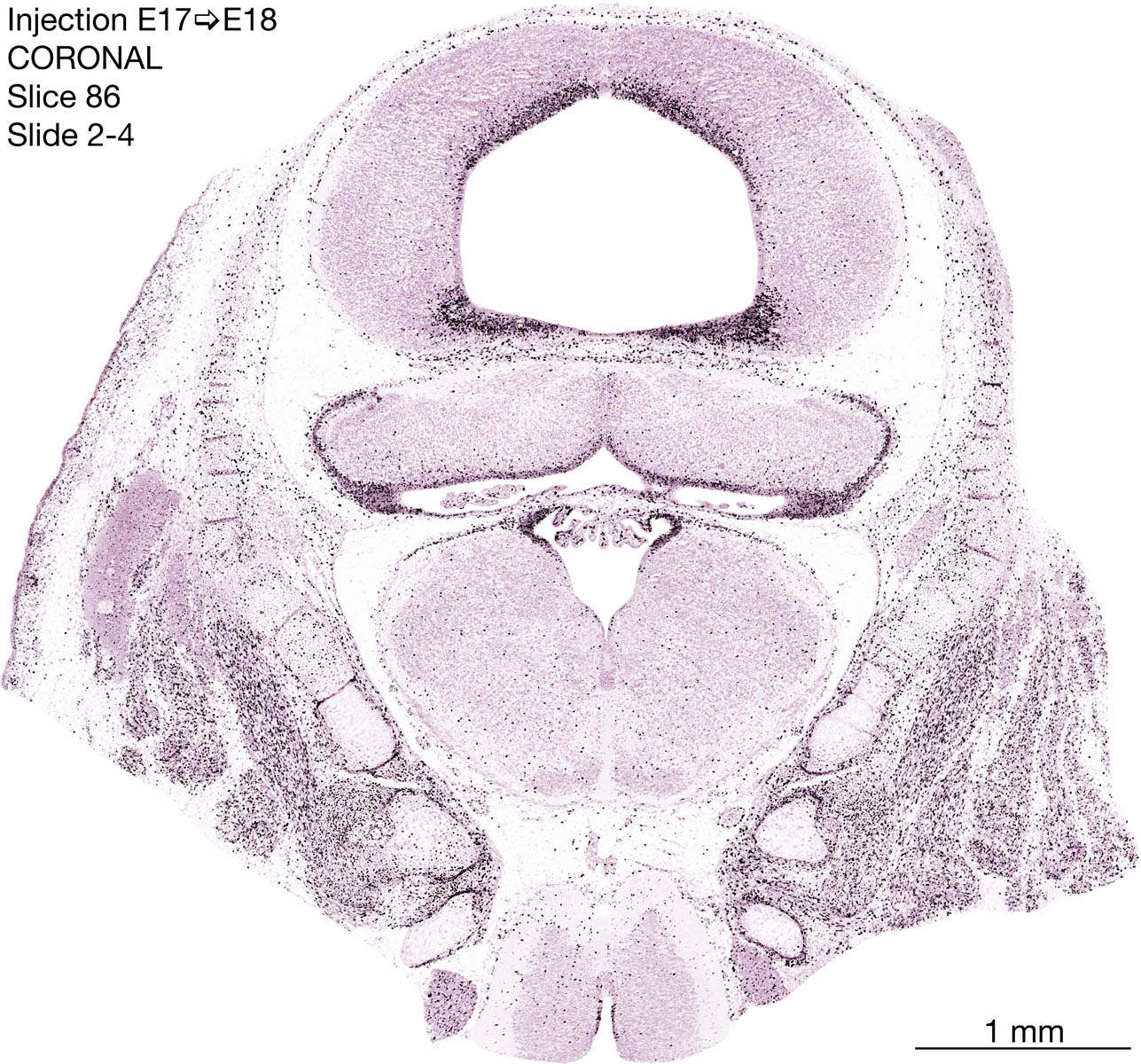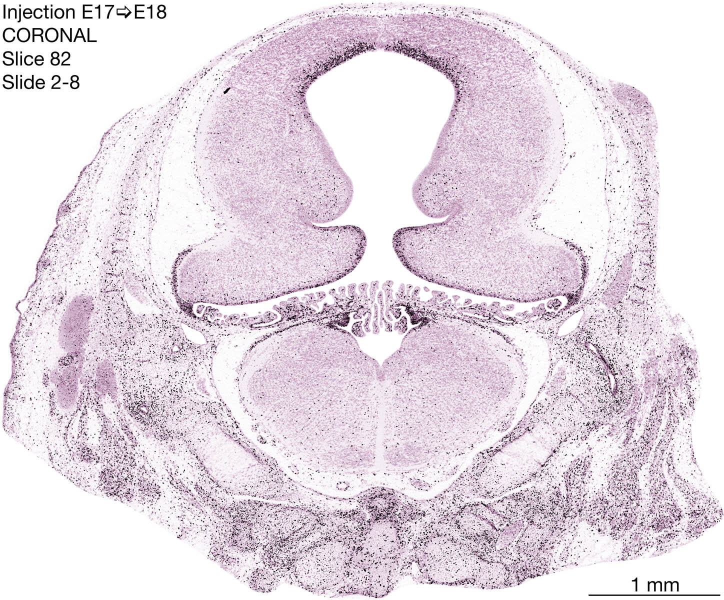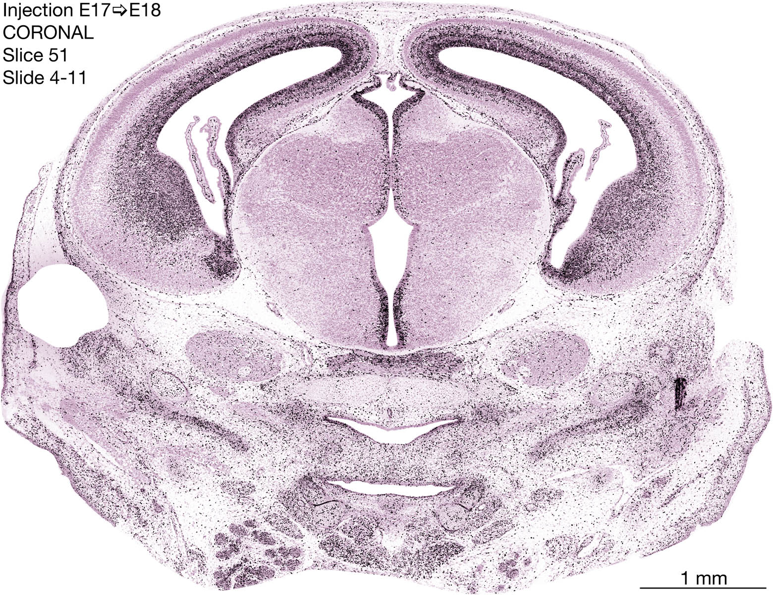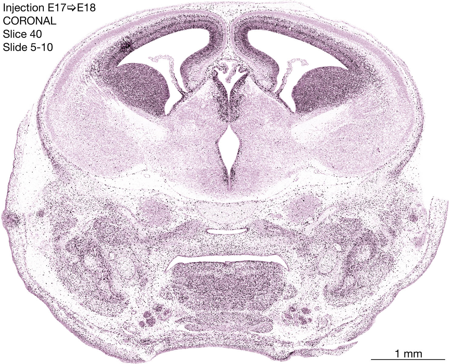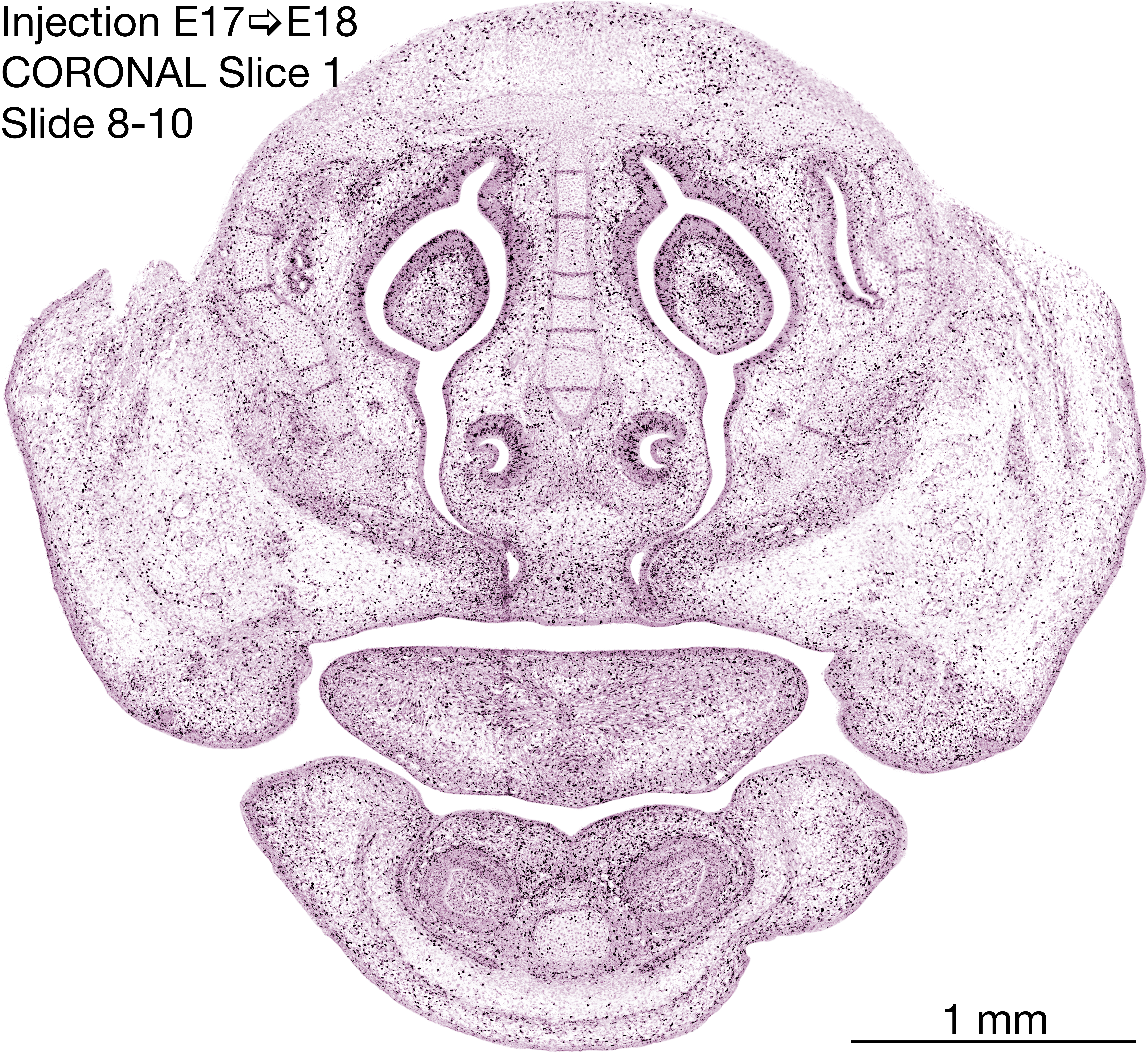 The following images are from a coronally-sectioned head of an E18 rat embryo exposed to tritiated thymidine on E17–24 hr survival. Note the heavily-labeled cells just outside the germinal zones are now mainly in the diencephalon and forebrain. These are postmitotic young neurons generated ON E17. Note that the banded labeling is prominent outside the neocortical neuroepithelium. Many of the germinal zones in the brainstem have become transformed into the primitive ependyma, and the entire brainstem is becoming more mature; the only primitive area is the cerebellum, where the external germinal layer is now more prominent.