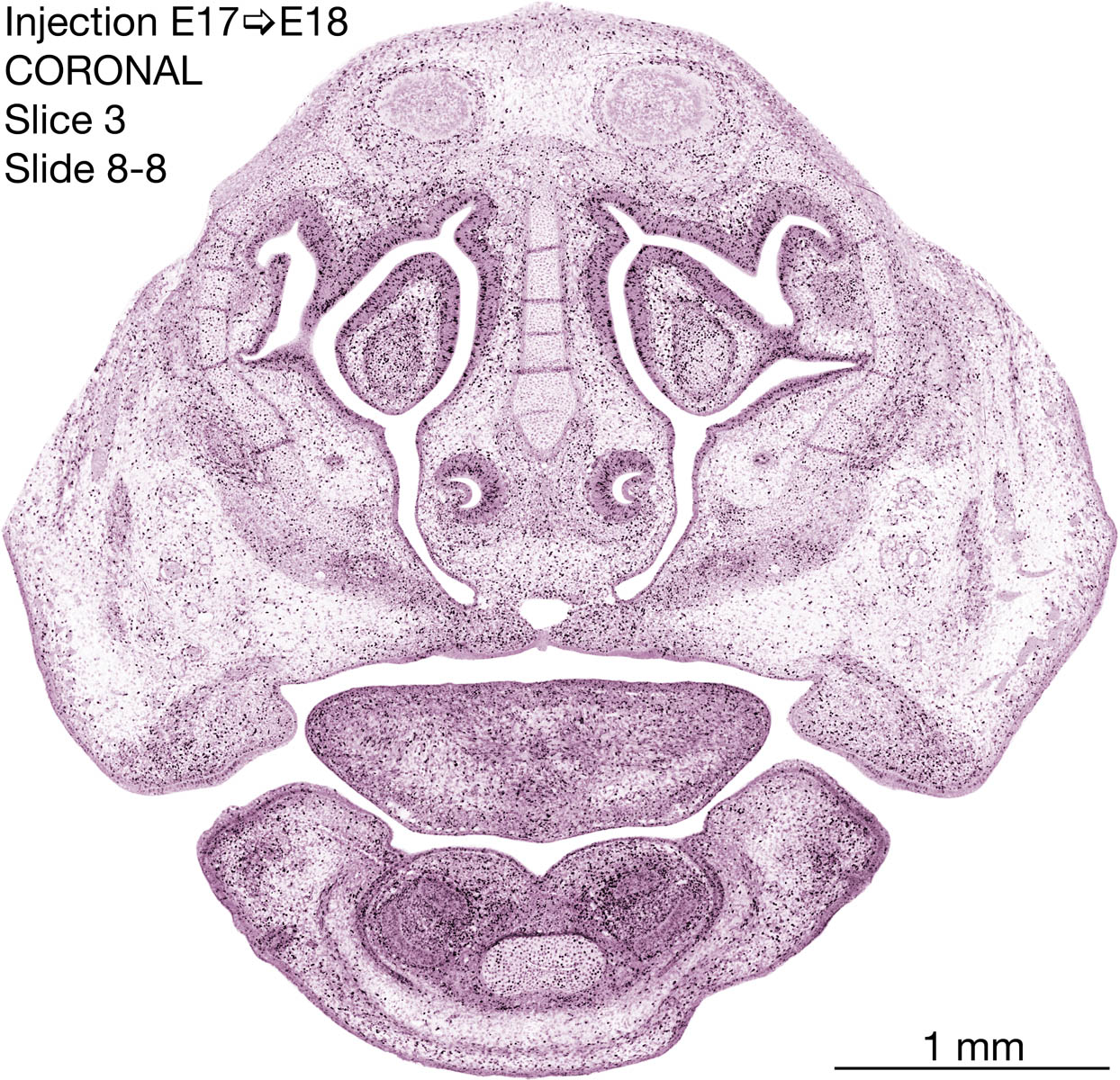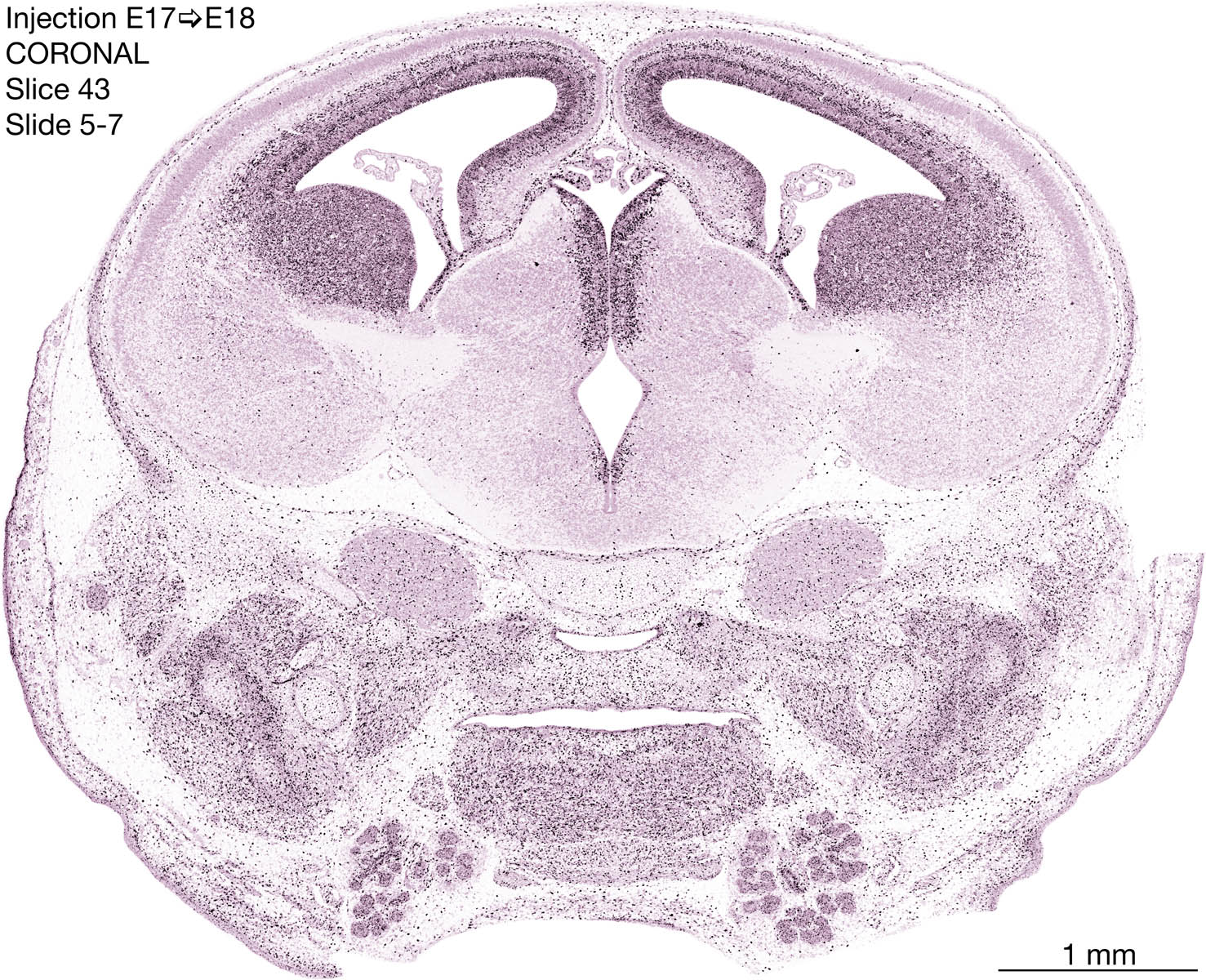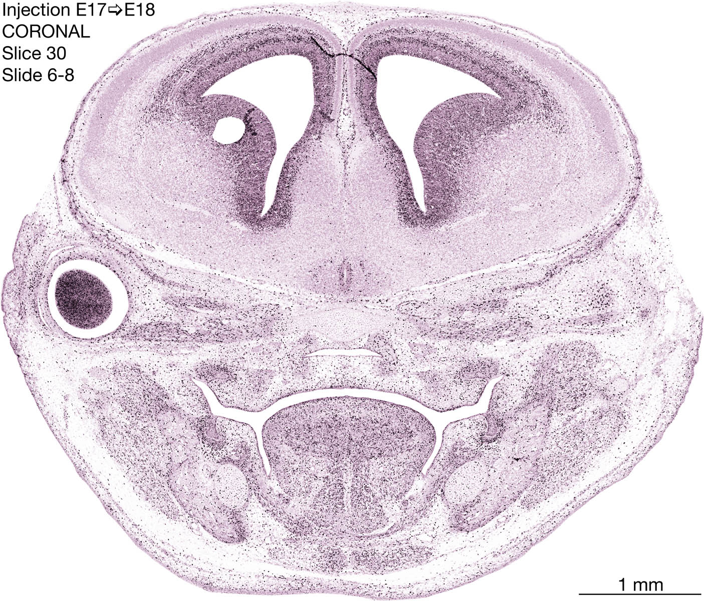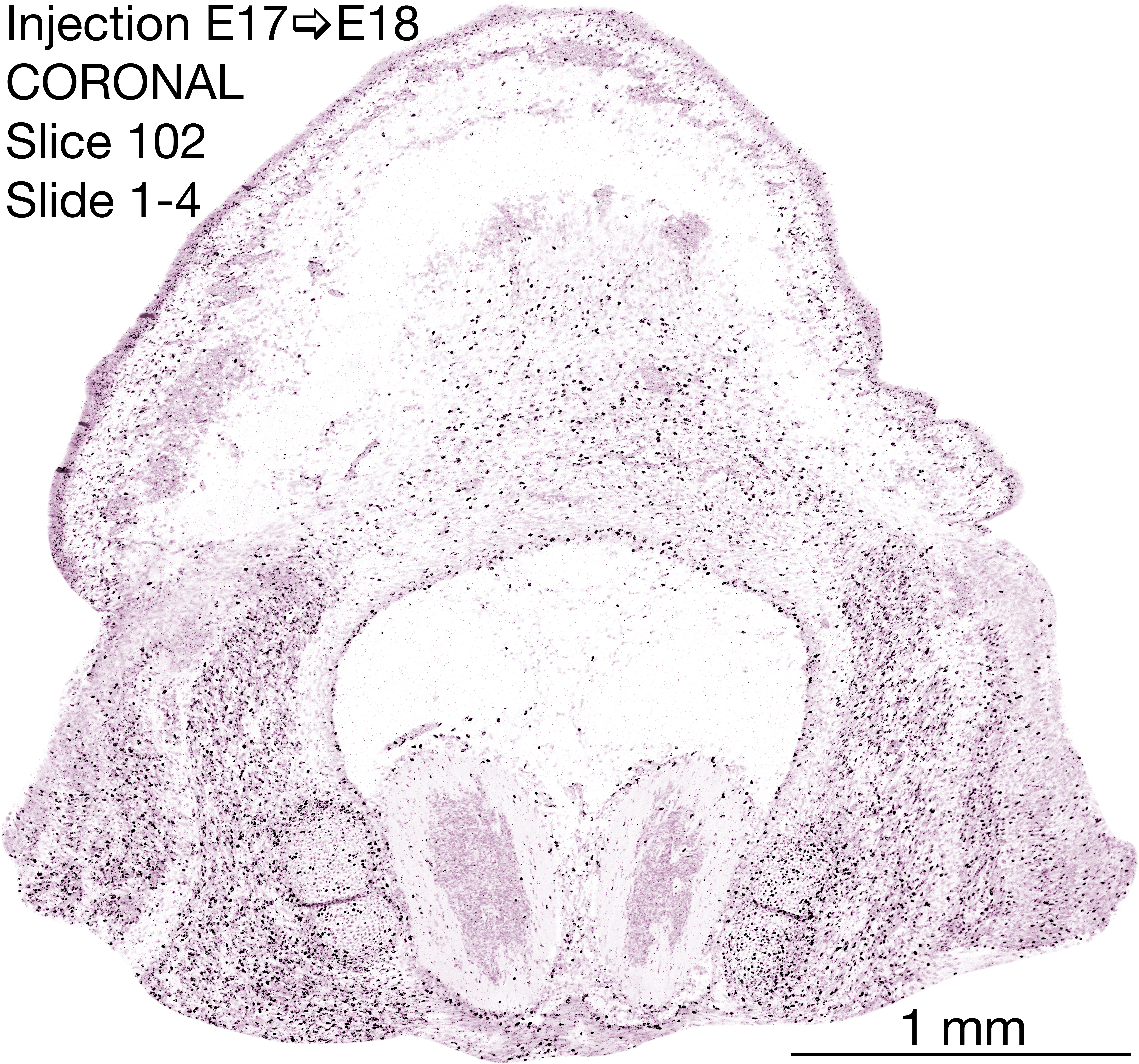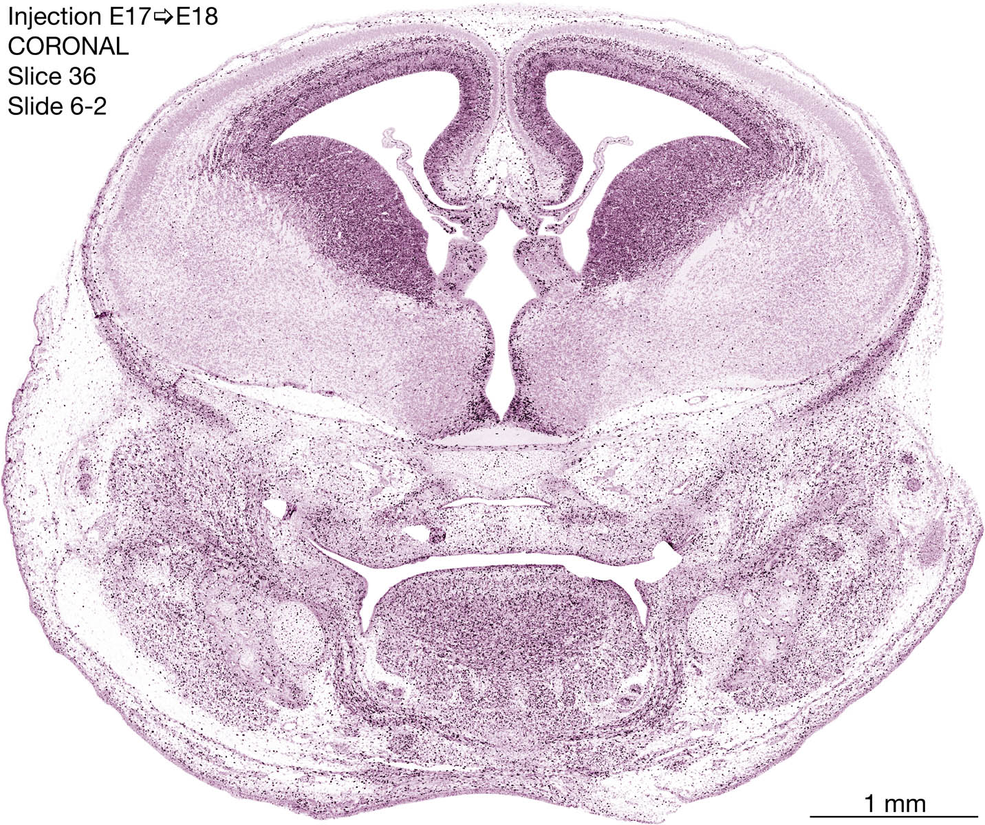 The following images are from a coronally-sectioned head of an E18 rat embryo exposed to tritiated thymidine on E17–24 hr survival. Note the heavily-labeled cells just outside the germinal zones are now mainly in the diencephalon and forebrain. These are postmitotic young neurons generated ON E17. Note that the banded labeling is prominent outside the neocortical neuroepithelium. Many of the germinal zones in the brainstem have become transformed into the primitive ependyma, and the entire brainstem is becoming more mature; the only primitive area is the cerebellum, where the external germinal layer is now more prominent.
