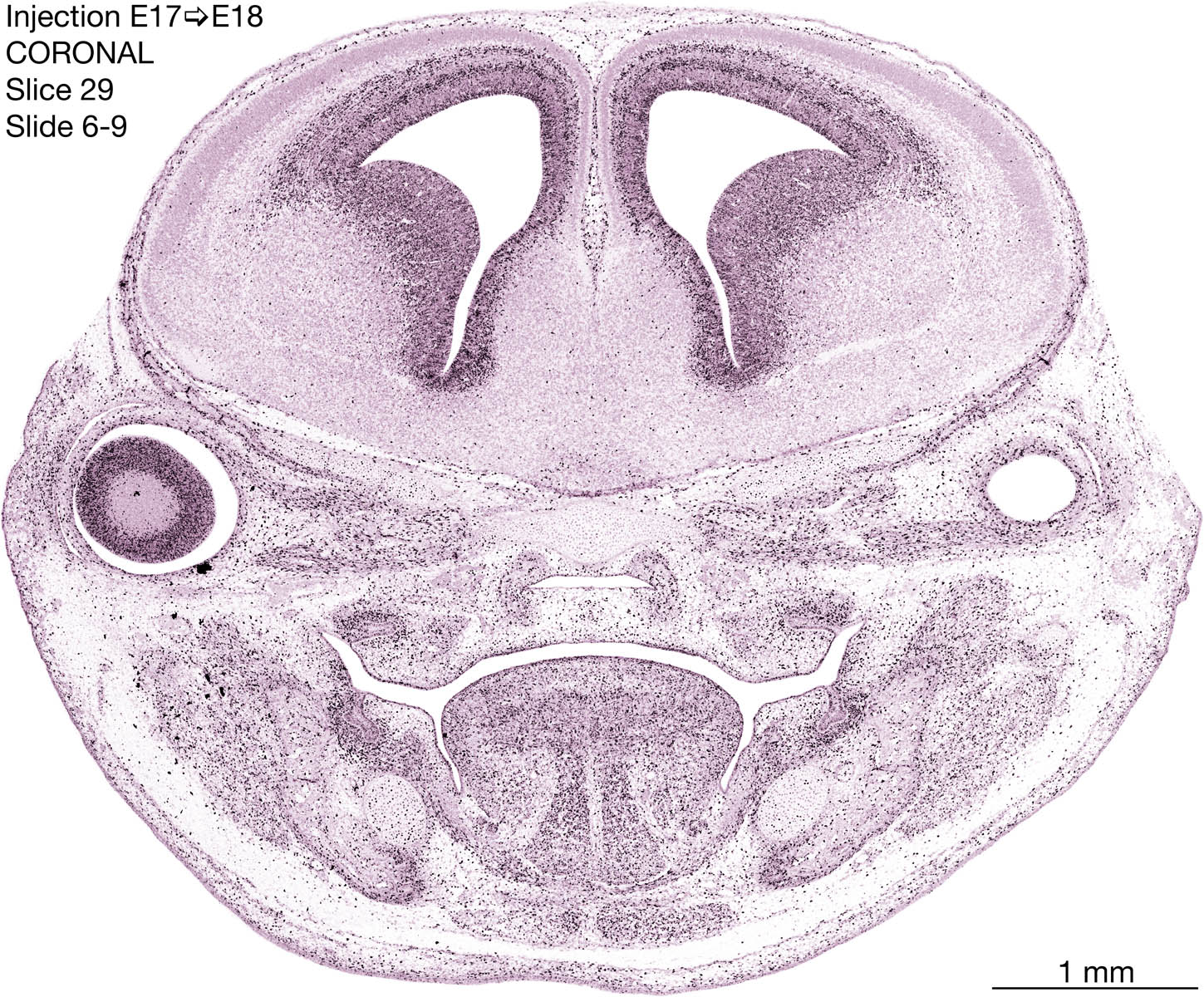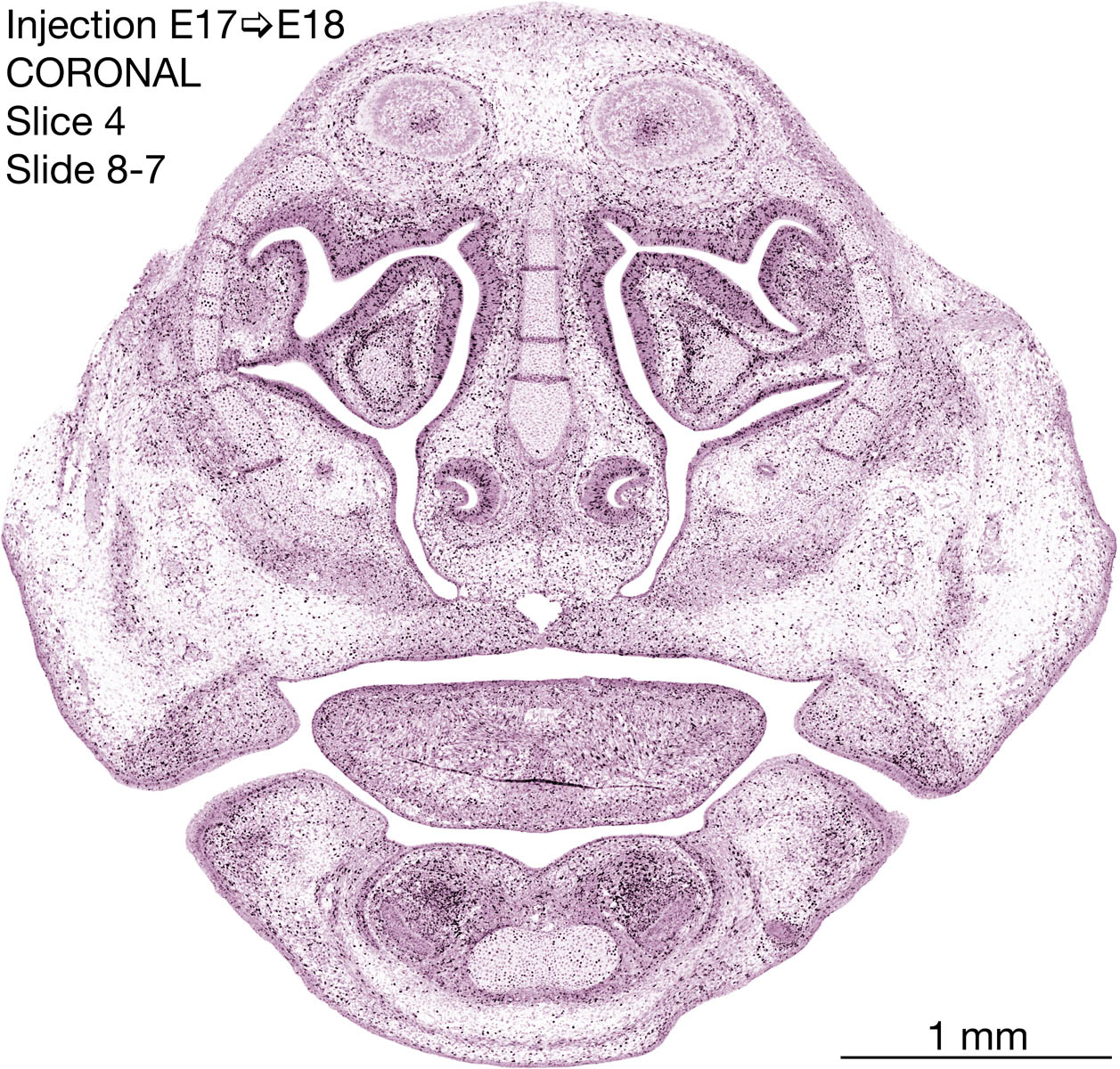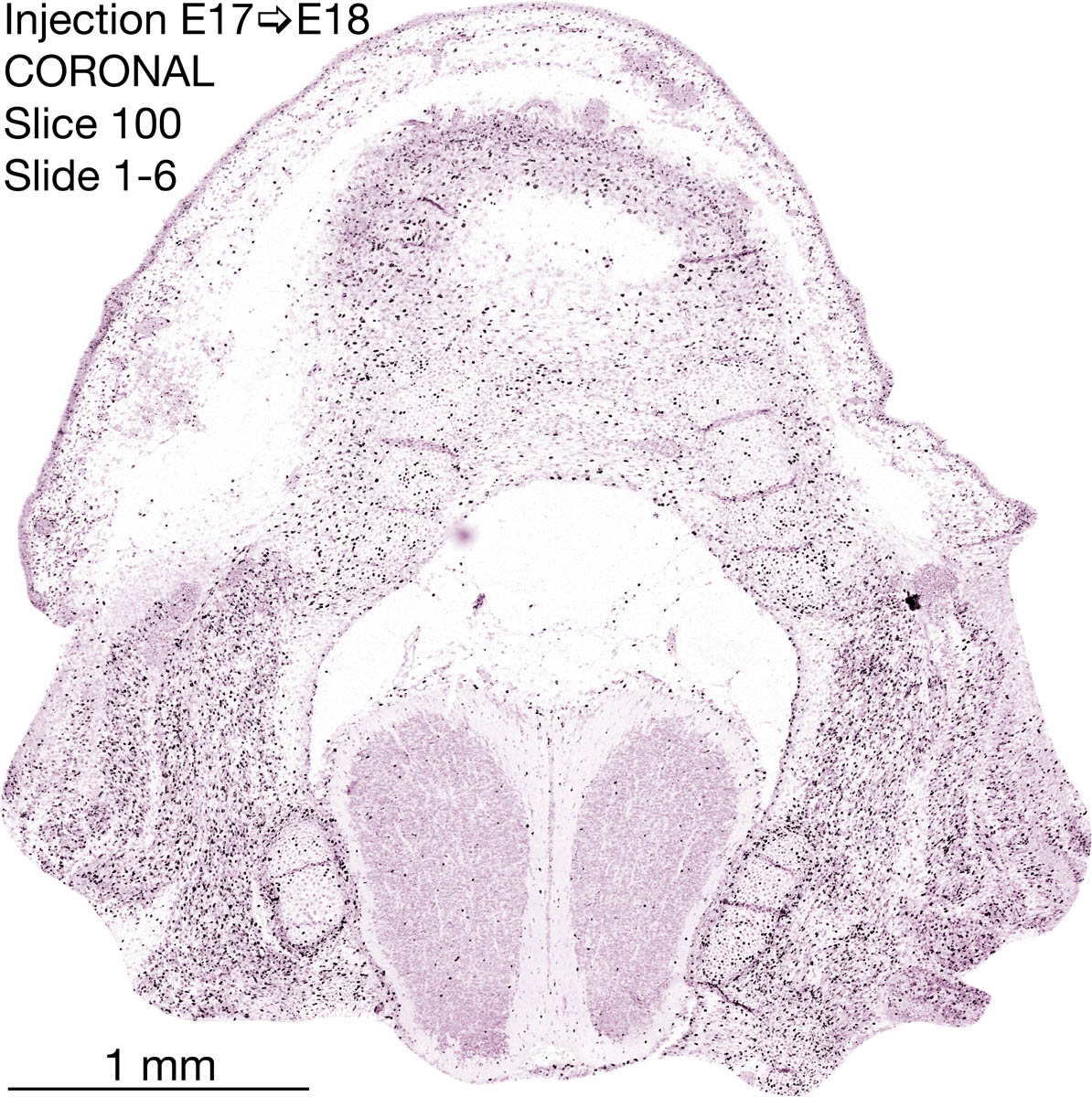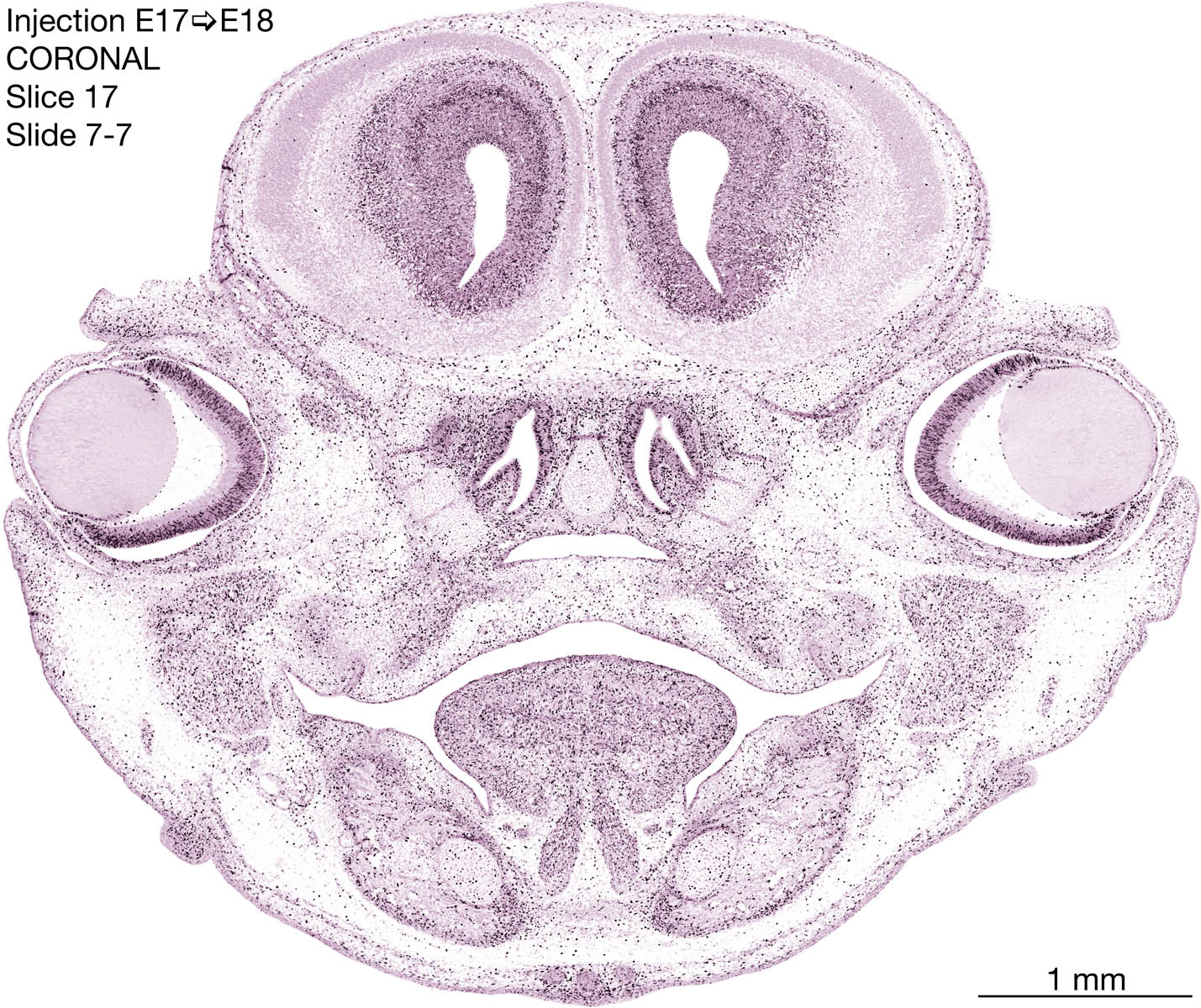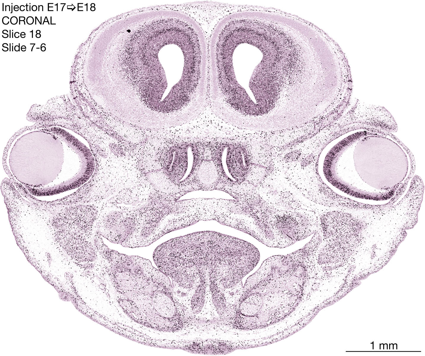 The following images are from a coronally-sectioned head of an E18 rat embryo exposed to tritiated thymidine on E17–24 hr survival. Note the heavily-labeled cells just outside the germinal zones are now mainly in the diencephalon and forebrain. These are postmitotic young neurons generated ON E17. Note that the banded labeling is prominent outside the neocortical neuroepithelium. Many of the germinal zones in the brainstem have become transformed into the primitive ependyma, and the entire brainstem is becoming more mature; the only primitive area is the cerebellum, where the external germinal layer is now more prominent.