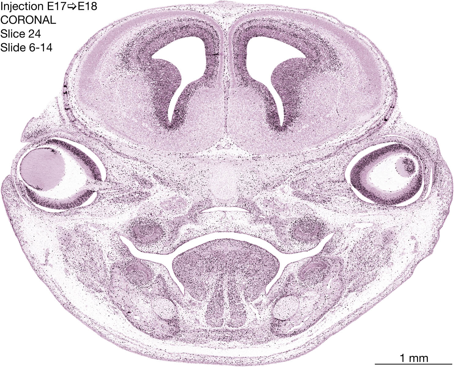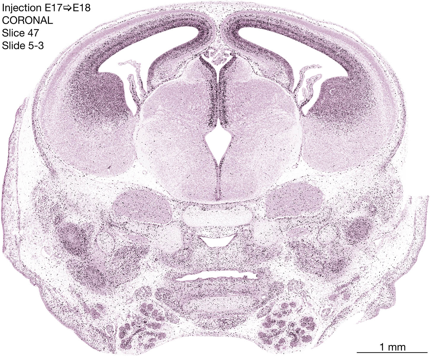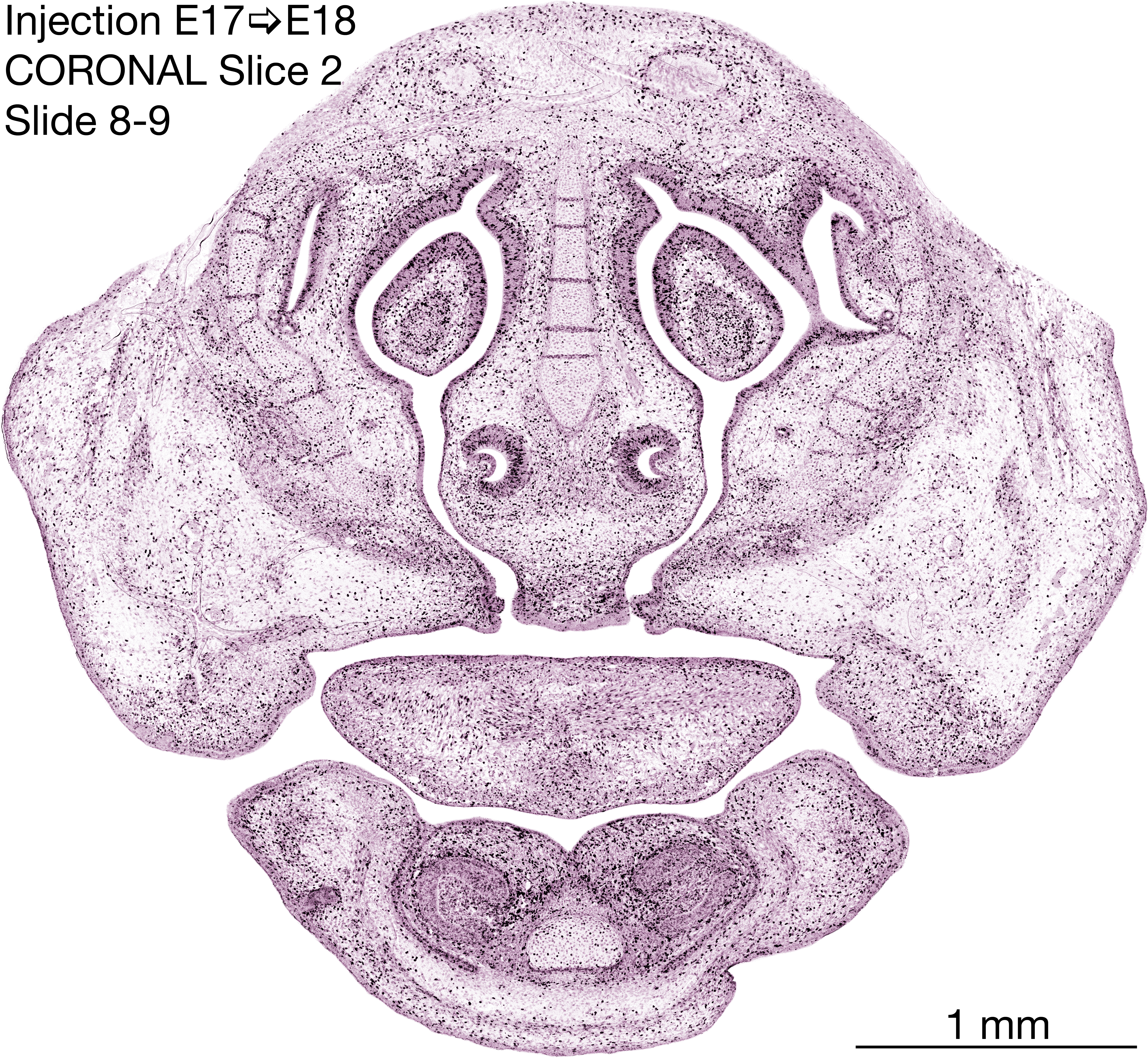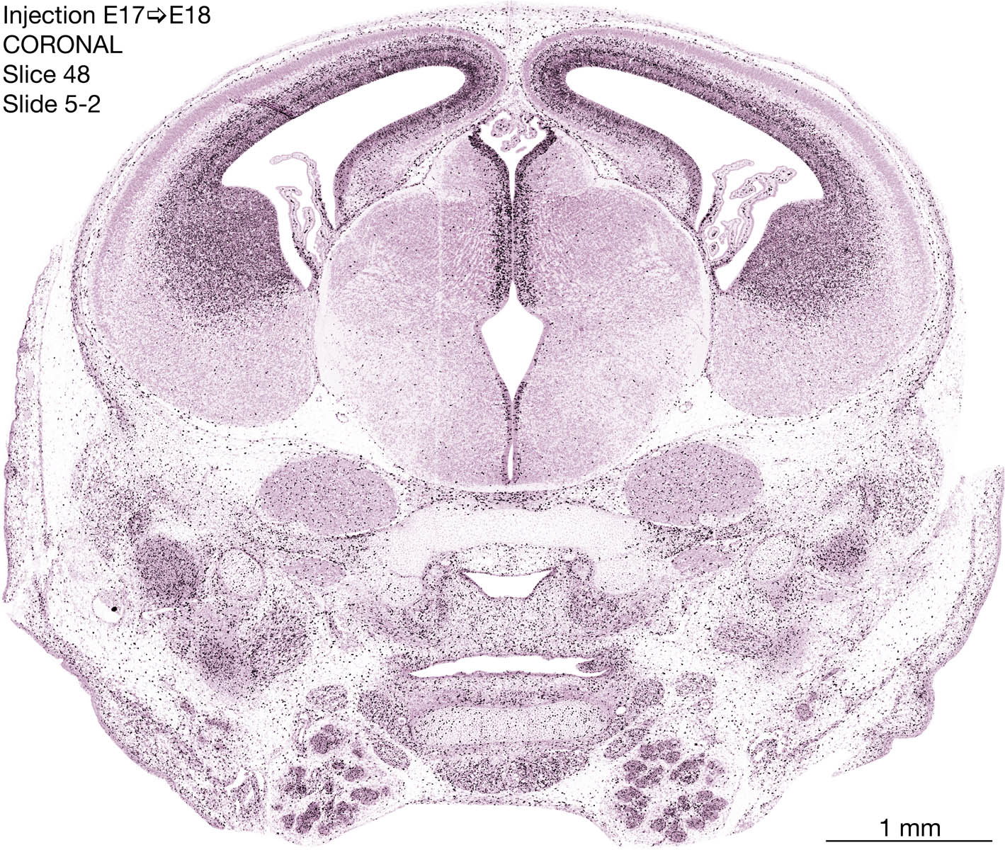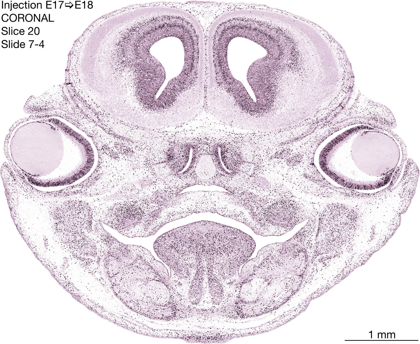 The following images are from a coronally-sectioned head of an E18 rat embryo exposed to tritiated thymidine on E17–24 hr survival. Note the heavily-labeled cells just outside the germinal zones are now mainly in the diencephalon and forebrain. These are postmitotic young neurons generated ON E17. Note that the banded labeling is prominent outside the neocortical neuroepithelium. Many of the germinal zones in the brainstem have become transformed into the primitive ependyma, and the entire brainstem is becoming more mature; the only primitive area is the cerebellum, where the external germinal layer is now more prominent.