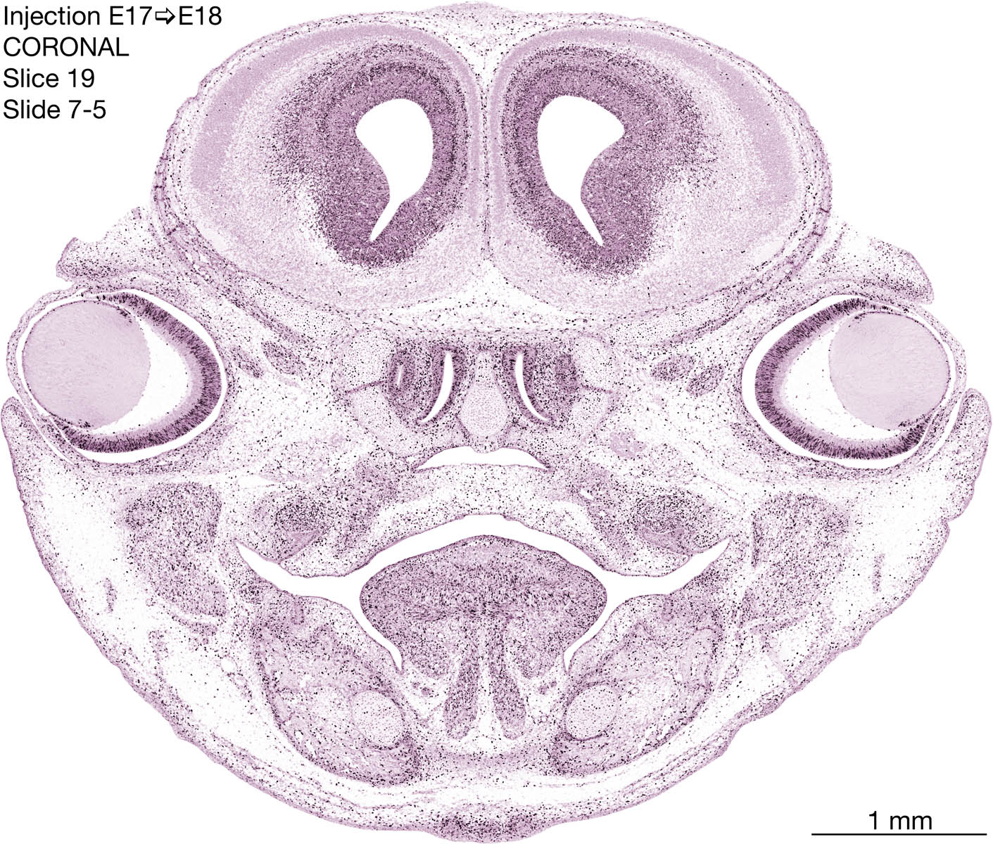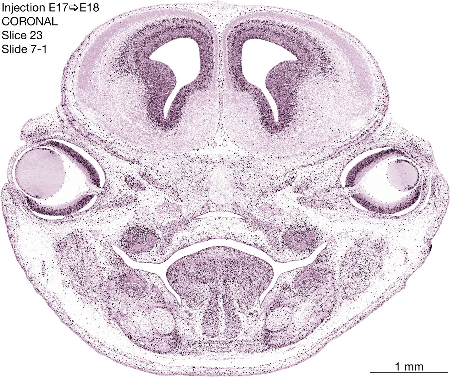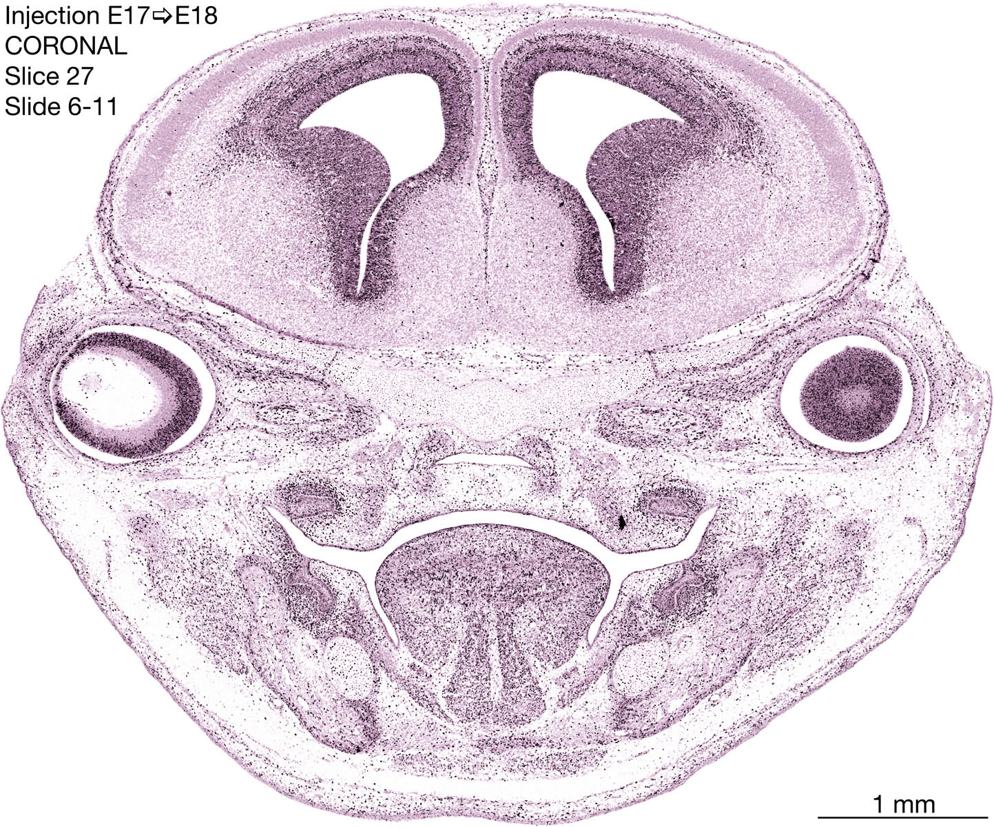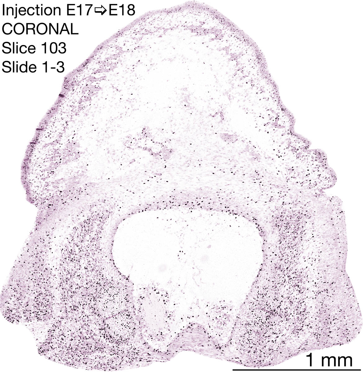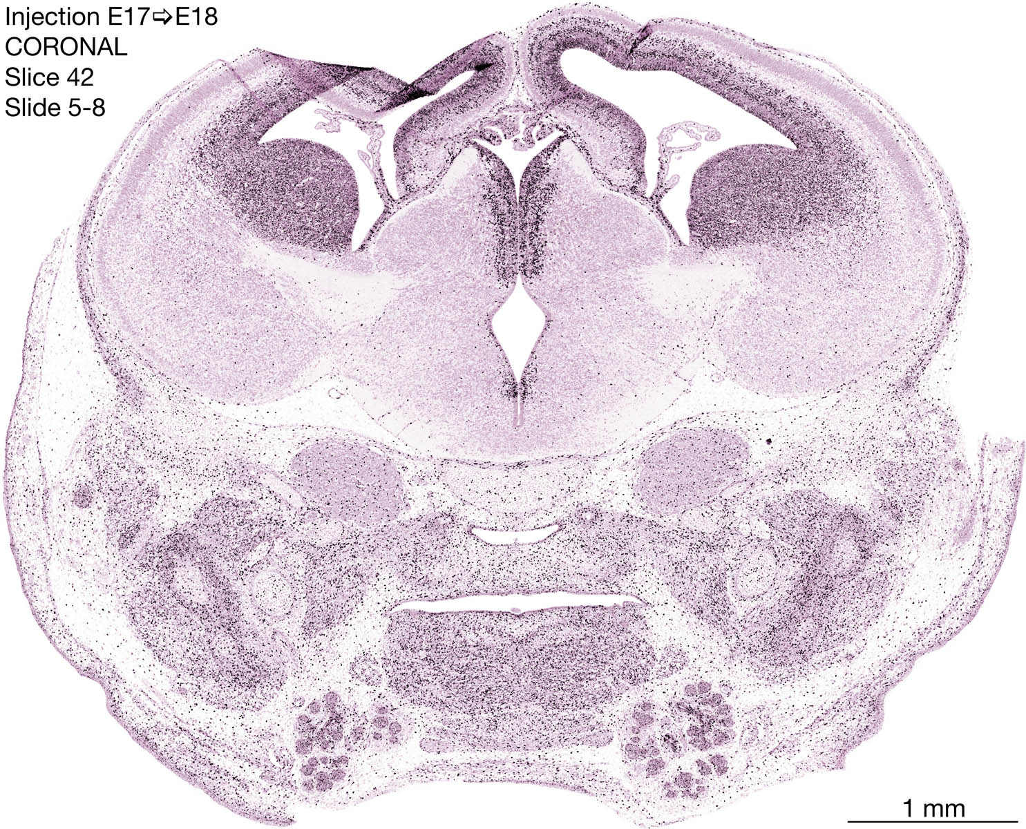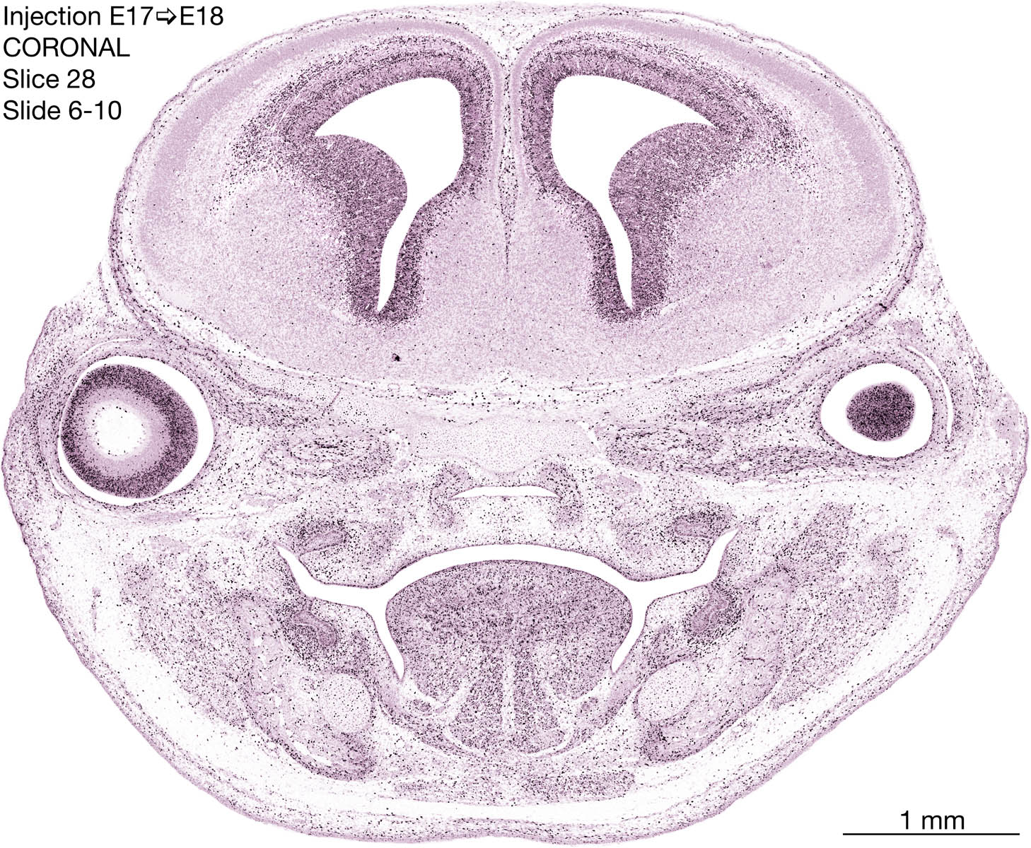 The following images are from a coronally-sectioned head of an E18 rat embryo exposed to tritiated thymidine on E17–24 hr survival. Note the heavily-labeled cells just outside the germinal zones are now mainly in the diencephalon and forebrain. These are postmitotic young neurons generated ON E17. Note that the banded labeling is prominent outside the neocortical neuroepithelium. Many of the germinal zones in the brainstem have become transformed into the primitive ependyma, and the entire brainstem is becoming more mature; the only primitive area is the cerebellum, where the external germinal layer is now more prominent.