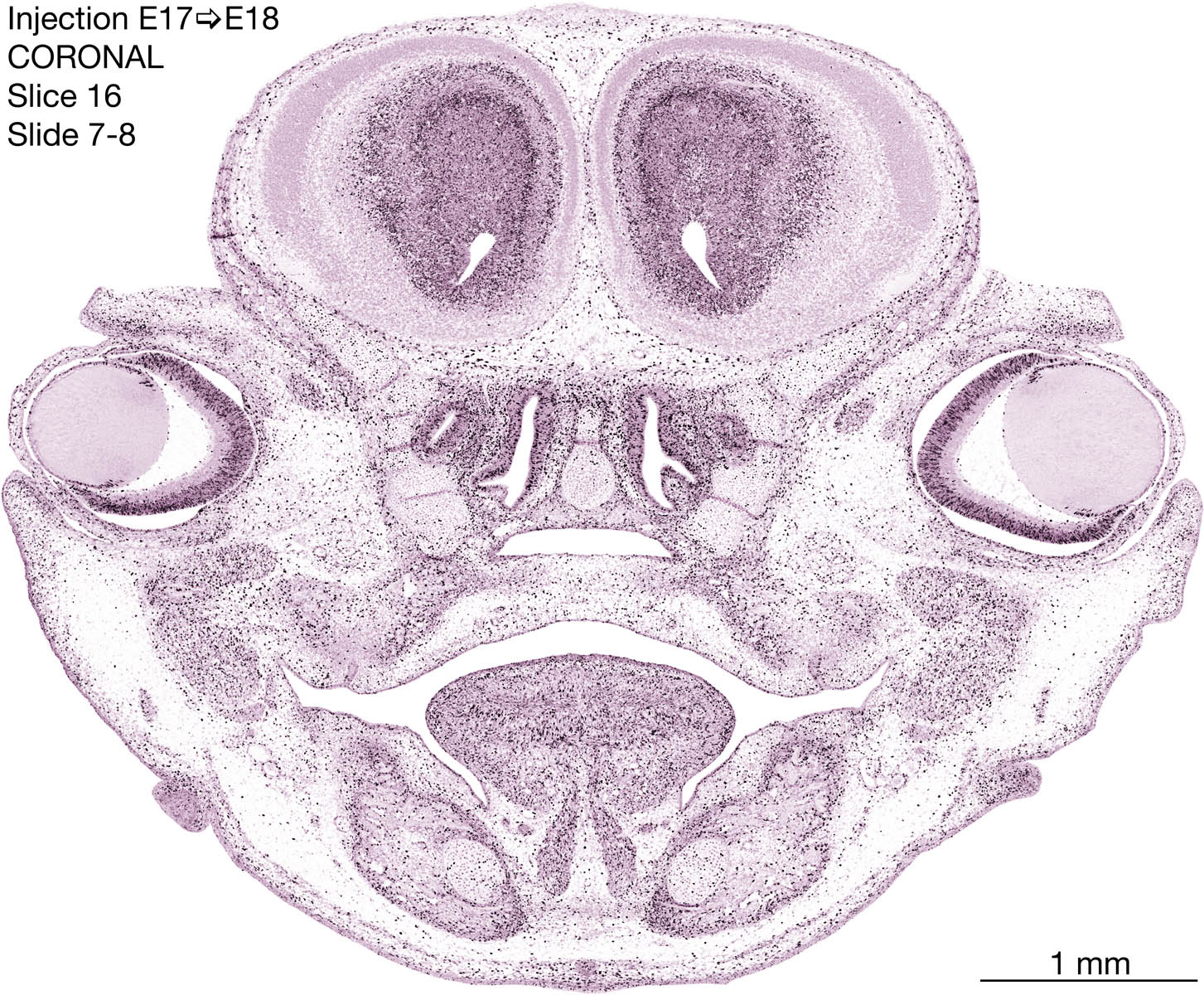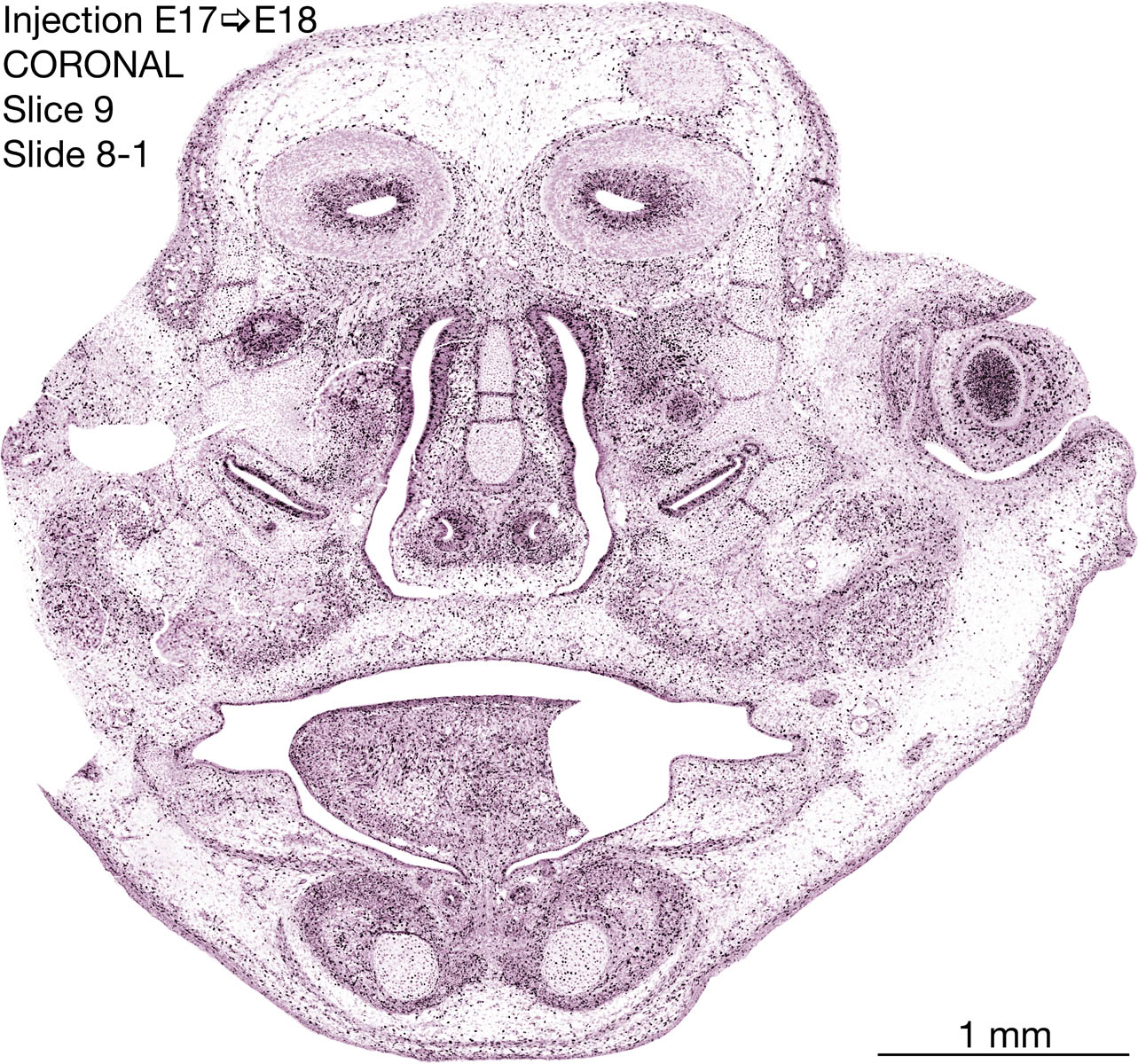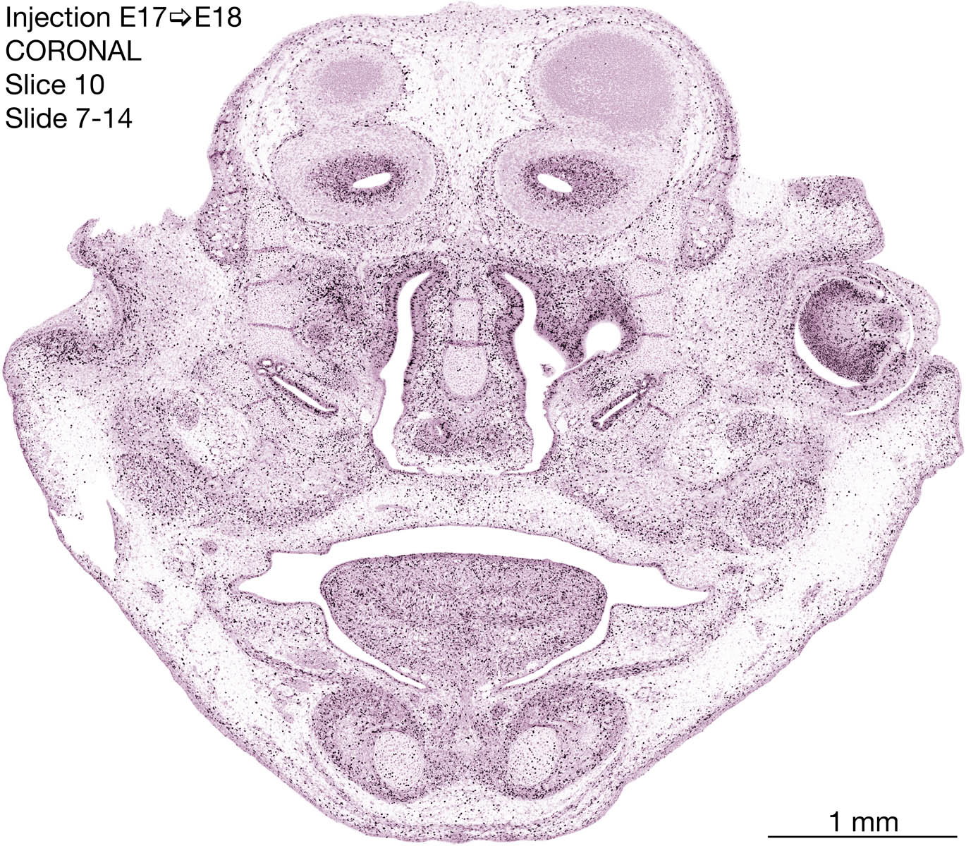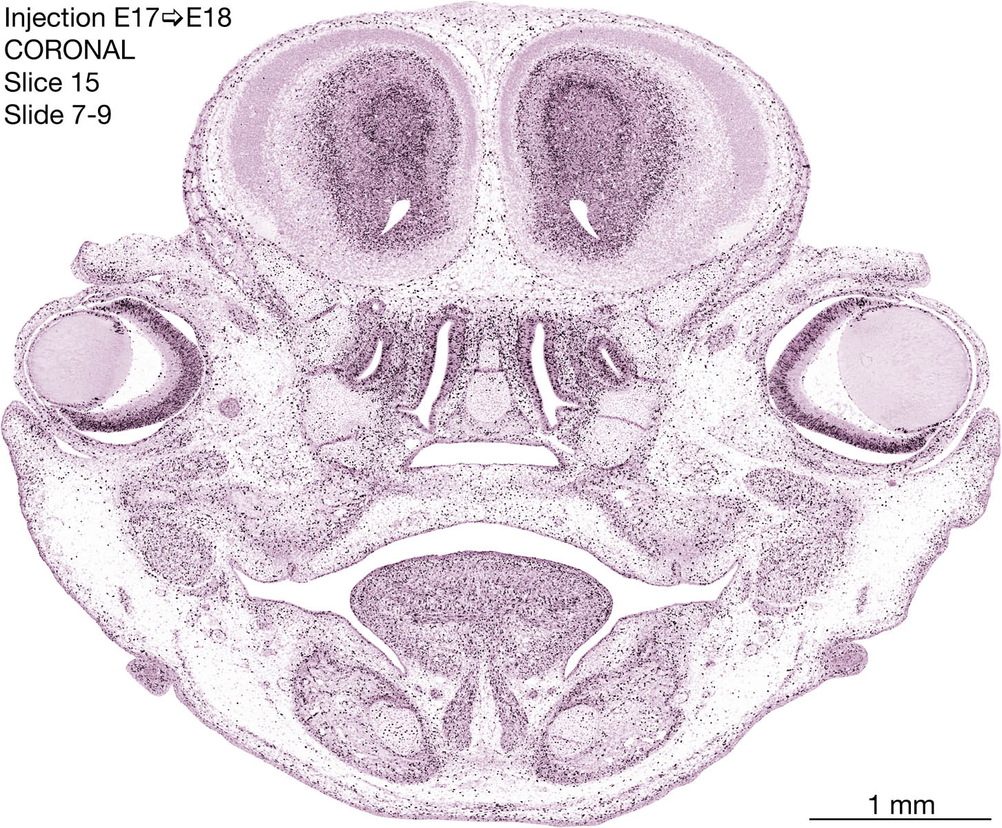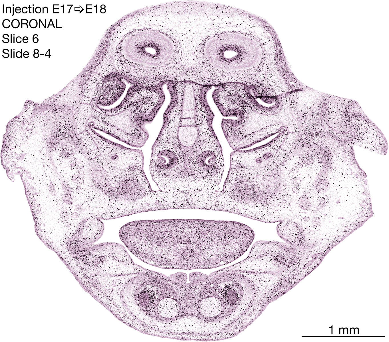 The following images are from a coronally-sectioned head of an E18 rat embryo exposed to tritiated thymidine on E17–24 hr survival. Note the heavily-labeled cells just outside the germinal zones are now mainly in the diencephalon and forebrain. These are postmitotic young neurons generated ON E17. Note that the banded labeling is prominent outside the neocortical neuroepithelium. Many of the germinal zones in the brainstem have become transformed into the primitive ependyma, and the entire brainstem is becoming more mature; the only primitive area is the cerebellum, where the external germinal layer is now more prominent.