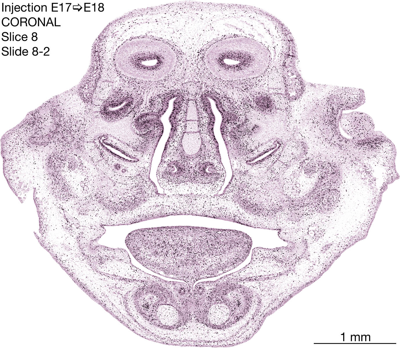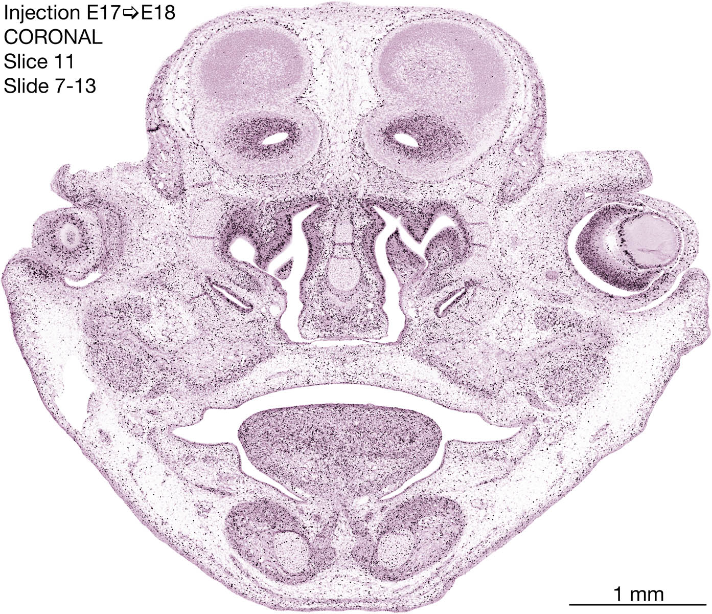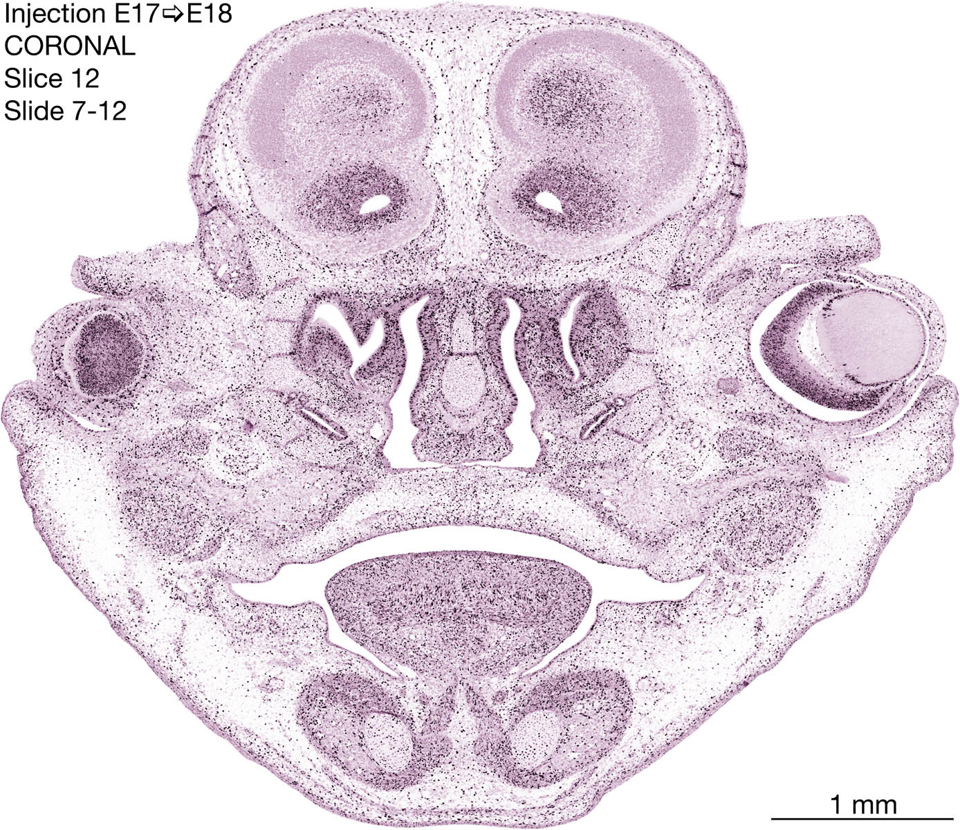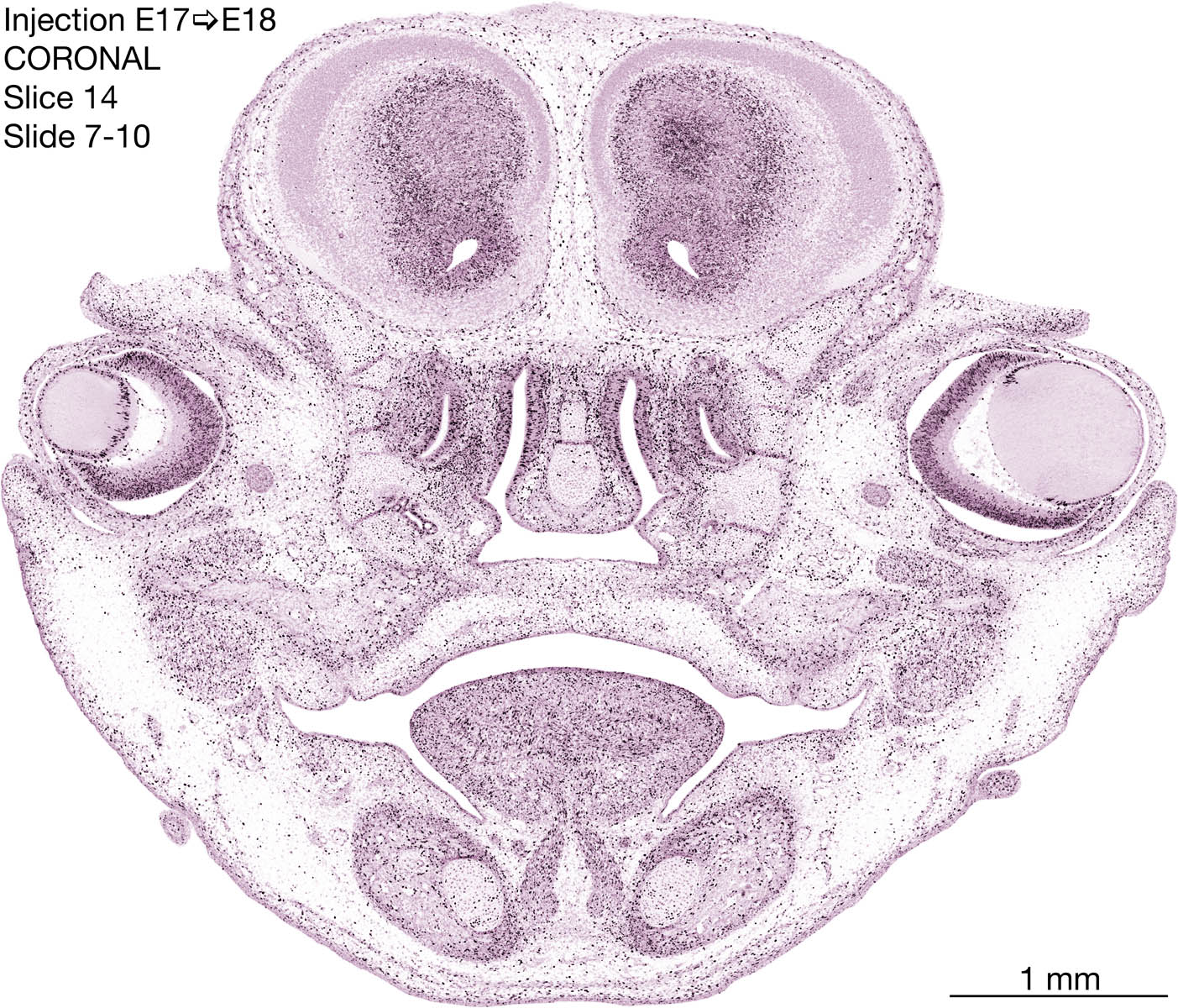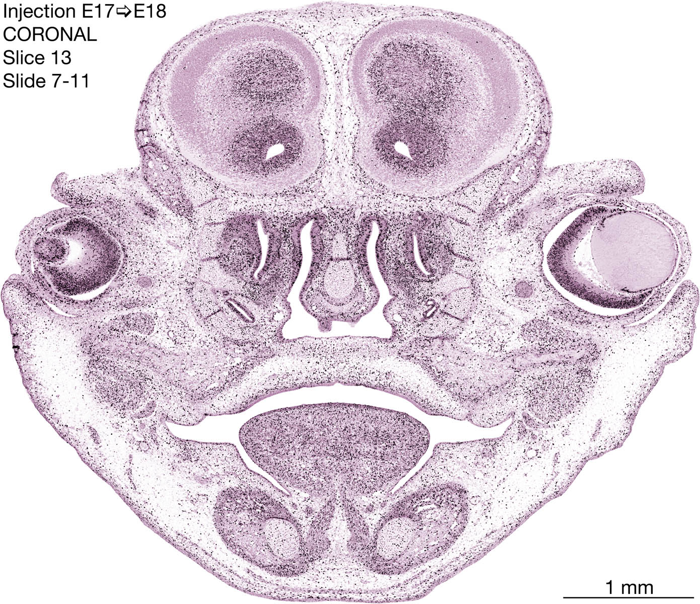 The following images are from a coronally-sectioned head of an E18 rat embryo exposed to tritiated thymidine on E17–24 hr survival. Note the heavily-labeled cells just outside the germinal zones are now mainly in the diencephalon and forebrain. These are postmitotic young neurons generated ON E17. Note that the banded labeling is prominent outside the neocortical neuroepithelium. Many of the germinal zones in the brainstem have become transformed into the primitive ependyma, and the entire brainstem is becoming more mature; the only primitive area is the cerebellum, where the external germinal layer is now more prominent.
