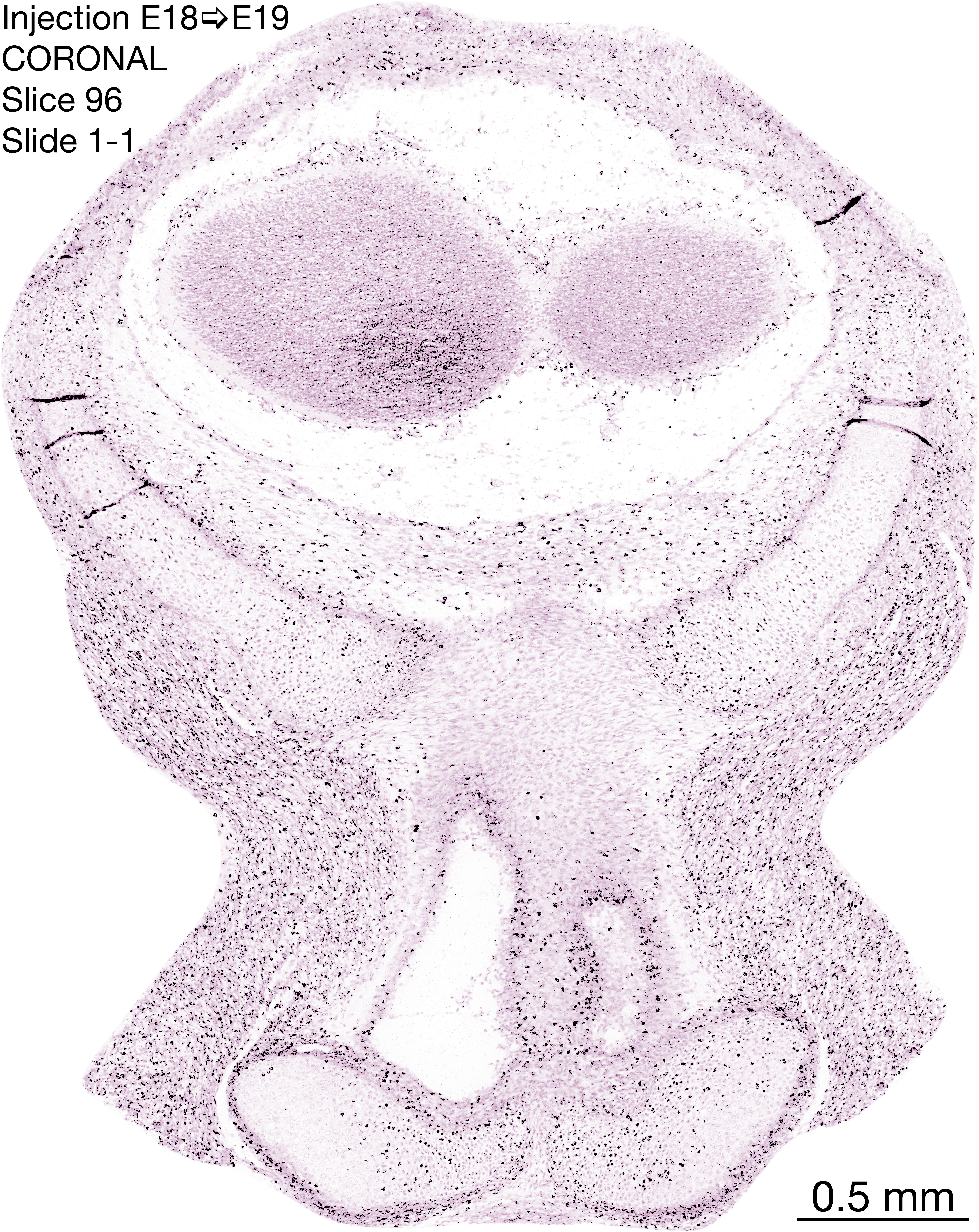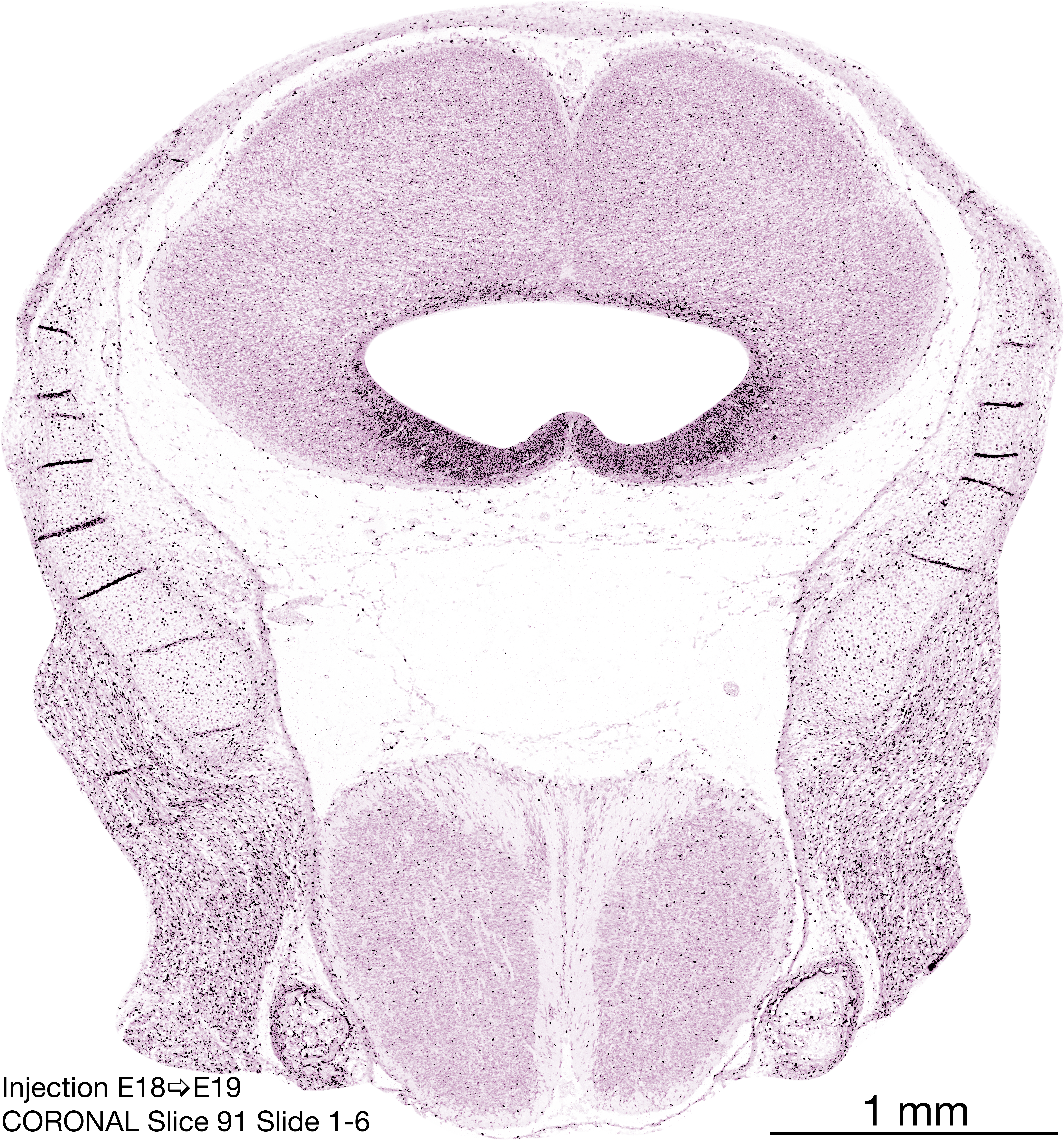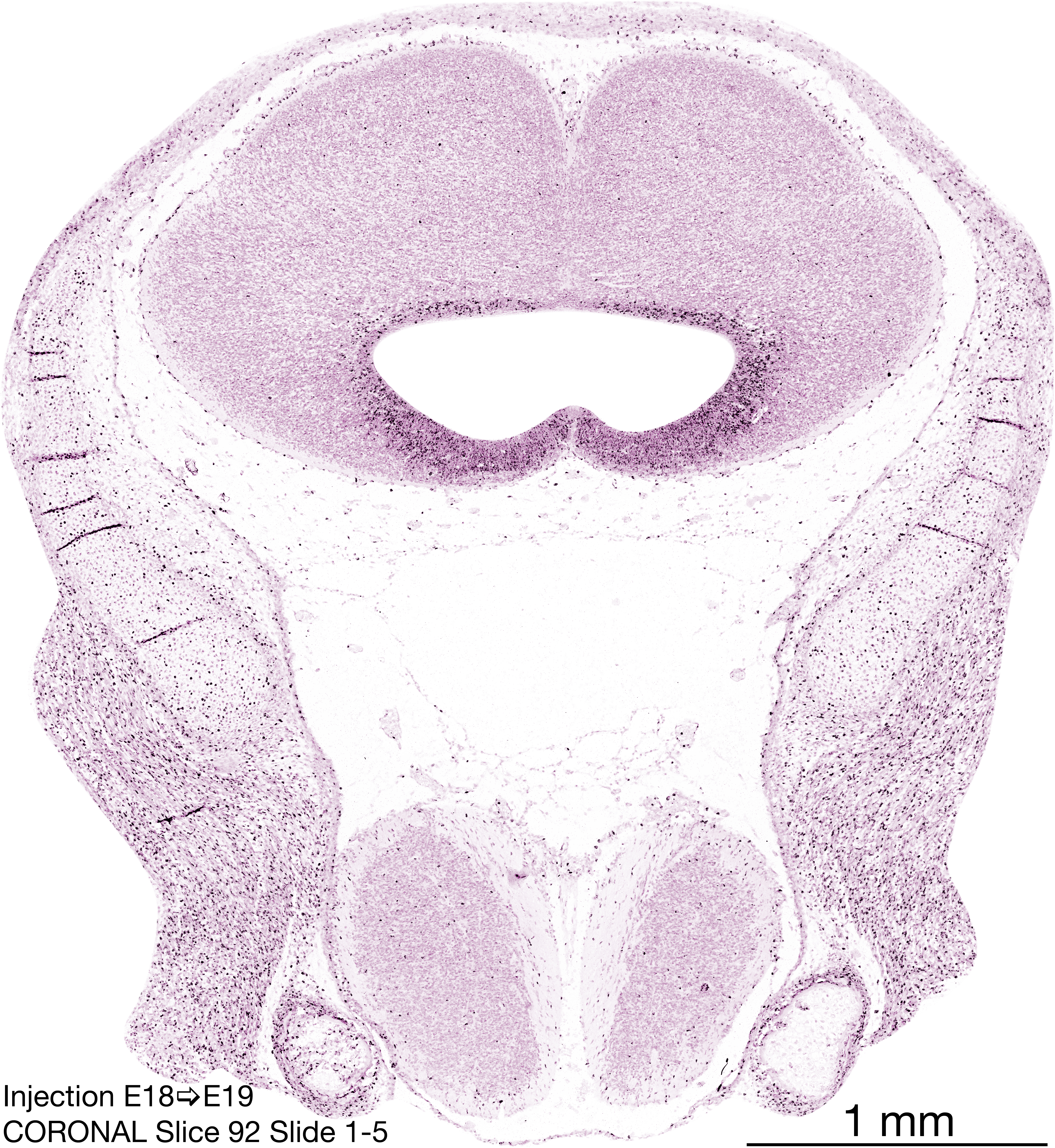 The following images are from a coronally-sectioned head of an E19 rat embryo exposed to tritiated thymidine on E18–24 hr survival. Note the heavily-labeled cells just outside the germinal zones are now mainly in the medial diencephalon and throughout the forebrain. These are postmitotic young neurons generated ON E18. Note that the banded labeling is still prominent outside the neocortical neuroepithelium. Most germinal zones in the brainstem are primitive ependyma, and the entire brainstem is appears nearly as mature as in the adult; scattered heavily labeled cells are most likely proliferating glia. The cerebellum stands out as an immature structure in the hindbrain.