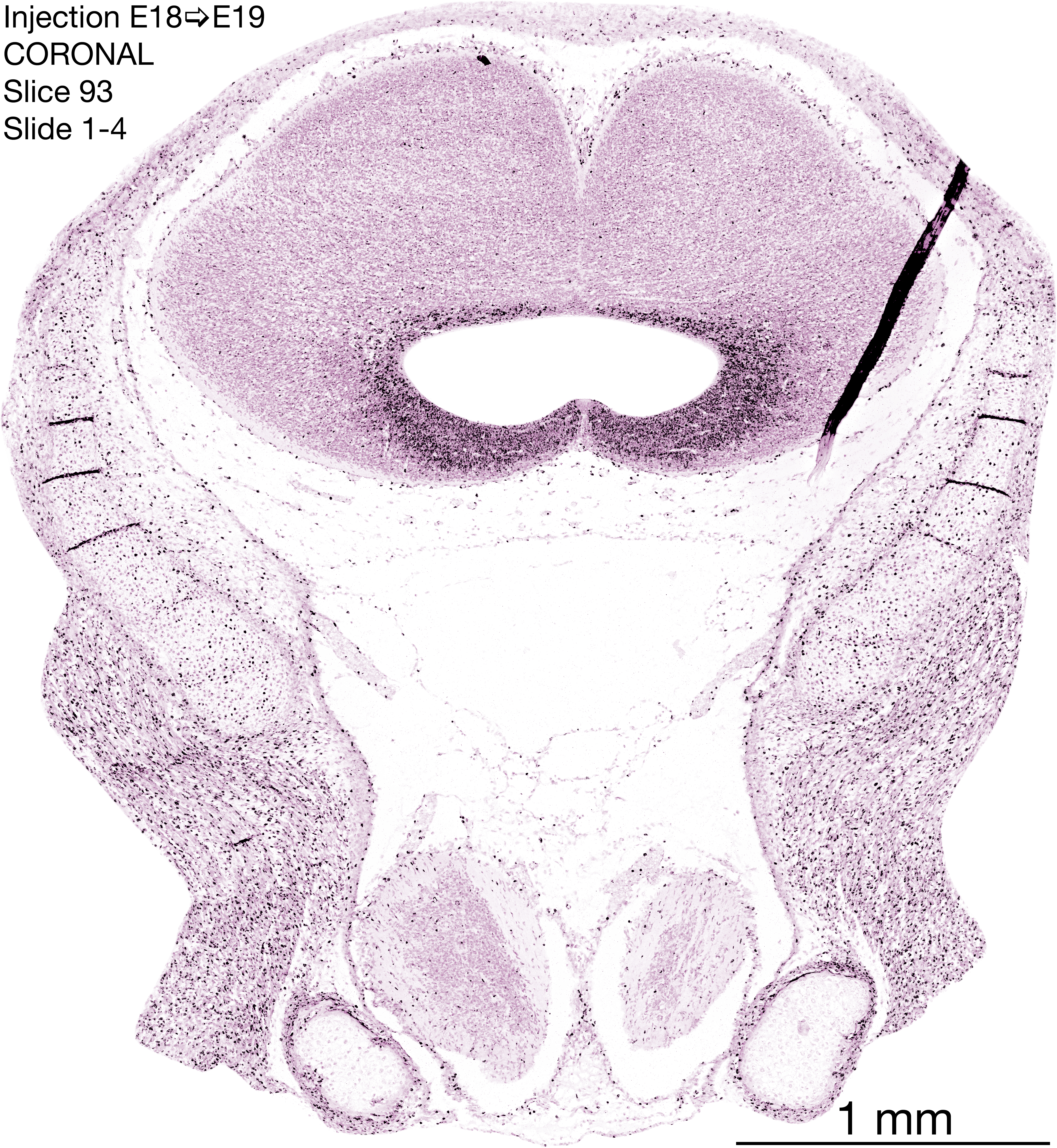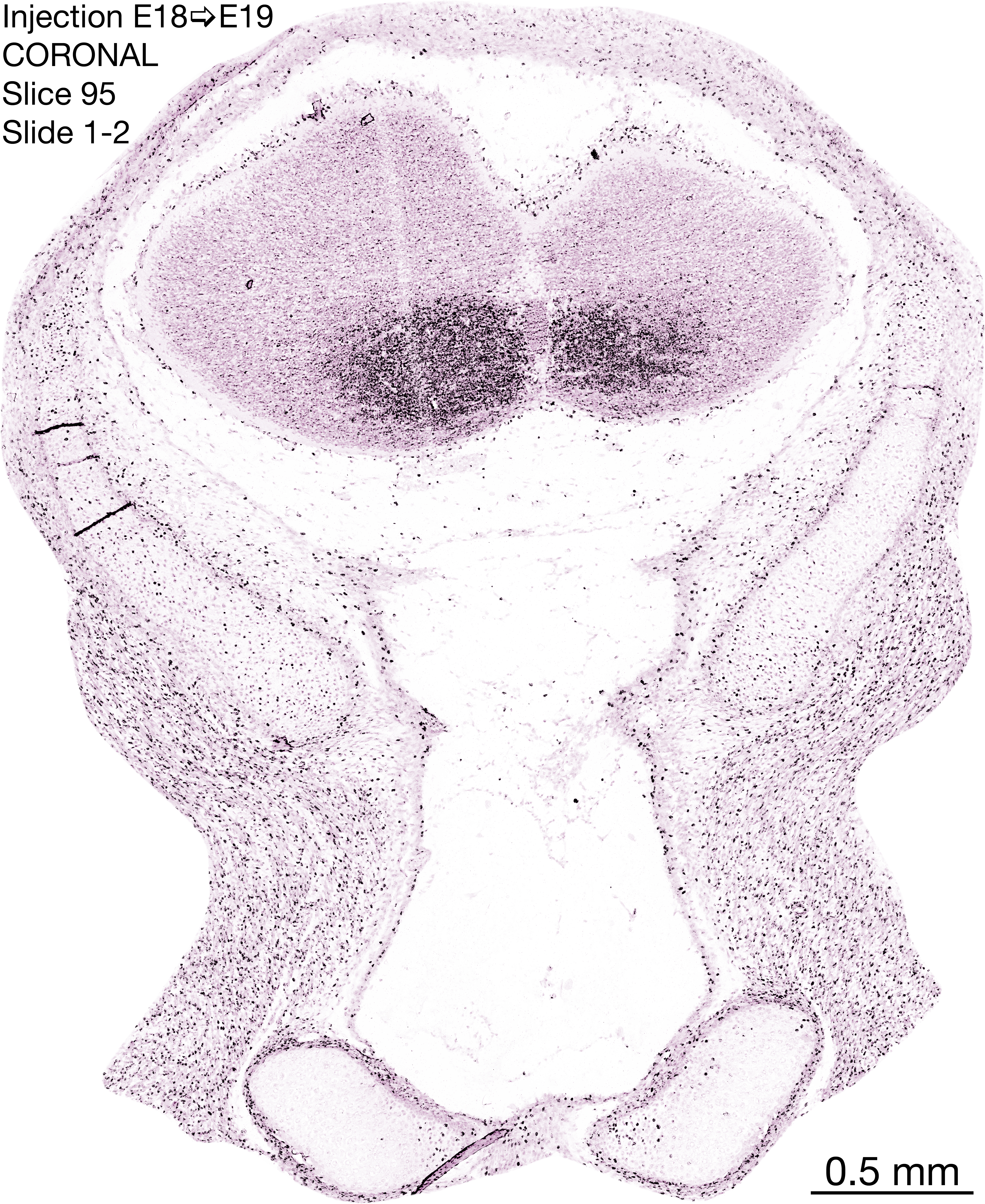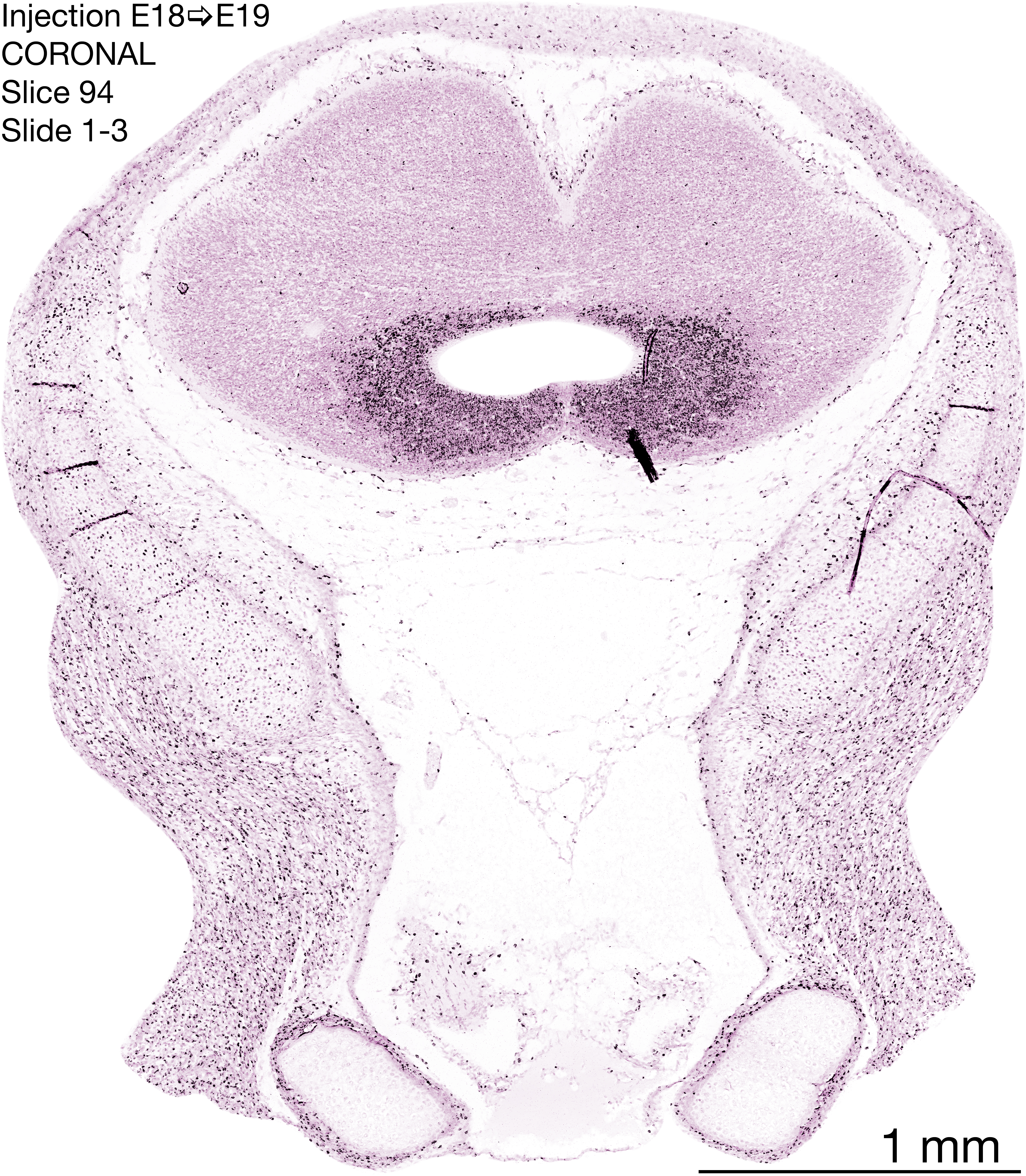 The following images are from a coronally-sectioned head of an E19 rat embryo exposed to tritiated thymidine on E18–24 hr survival. Note the heavily-labeled cells just outside the germinal zones are now mainly in the medial diencephalon and throughout the forebrain. These are postmitotic young neurons generated ON E18. Note that the banded labeling is still prominent outside the neocortical neuroepithelium. Most germinal zones in the brainstem are primitive ependyma, and the entire brainstem is appears nearly as mature as in the adult; scattered heavily labeled cells are most likely proliferating glia. The cerebellum stands out as an immature structure in the hindbrain.