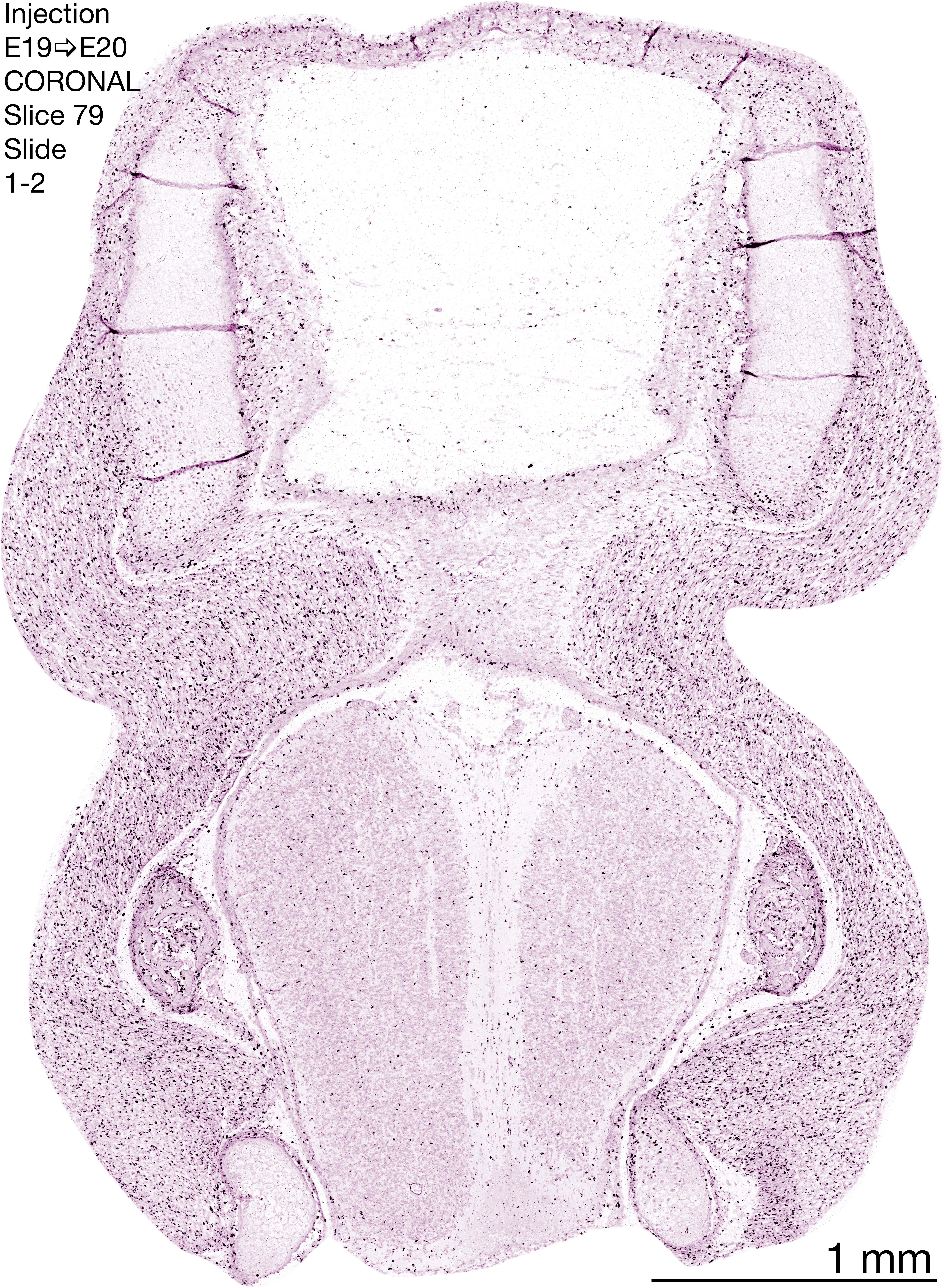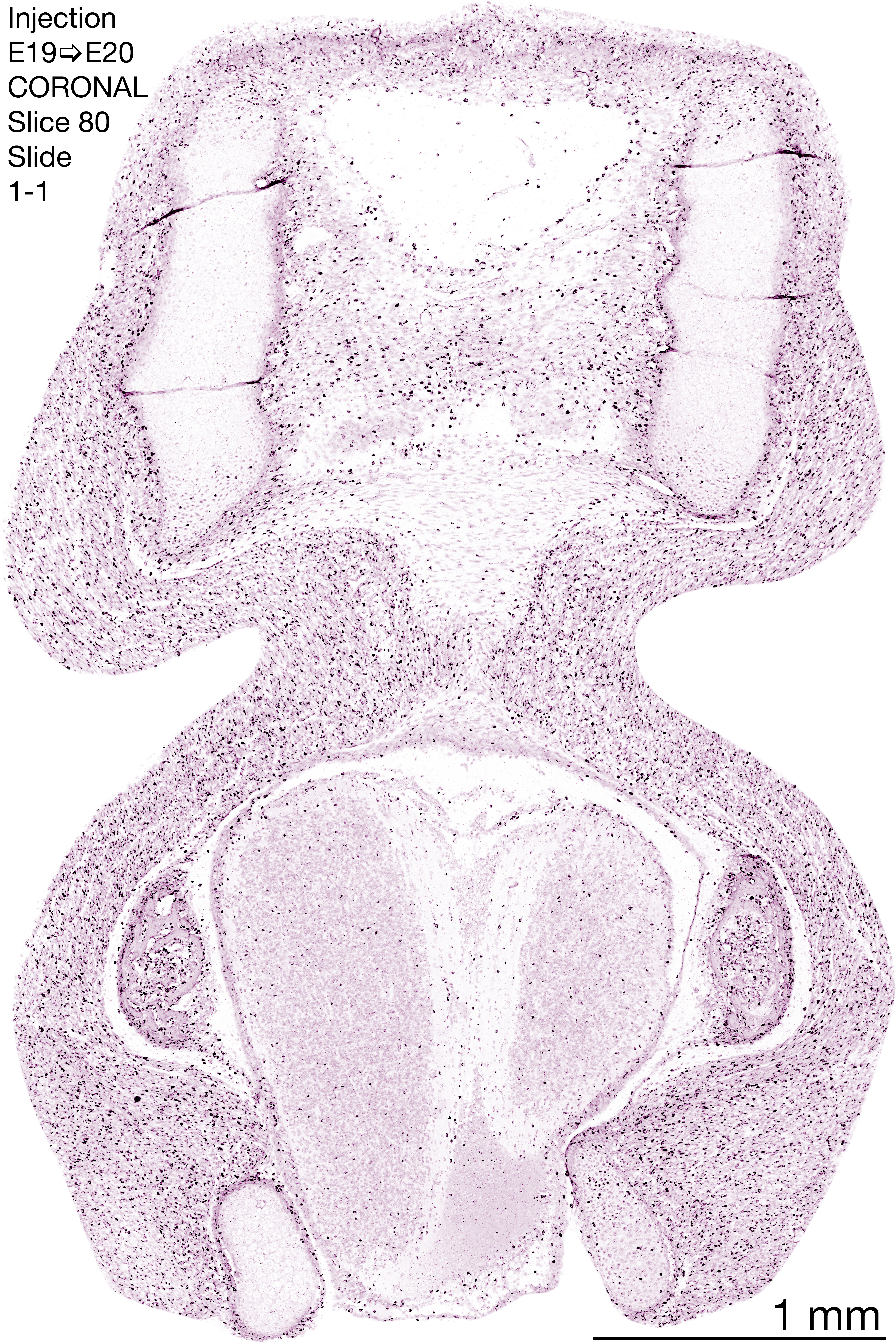 The following images are from a coronally-sectioned head of an E20 rat embryo exposed to tritiated thymidine on E19–24 hr survival. Note the heavily-labeled cells just outside the germinal zones are now much more sparse throughout the forebrain. These are postmitotic young neurons generated ON E19. Note that the banded labeling is still present outside the neocortical neuroepithelium. Germinal zones in the brainstem have essentially disappeared and are primitive ependyma. Scattered heavily labeled cells in the parenchyma are most likely proliferating glia. The cerebellum continues to stands out as an immature structure in the hindbrain.