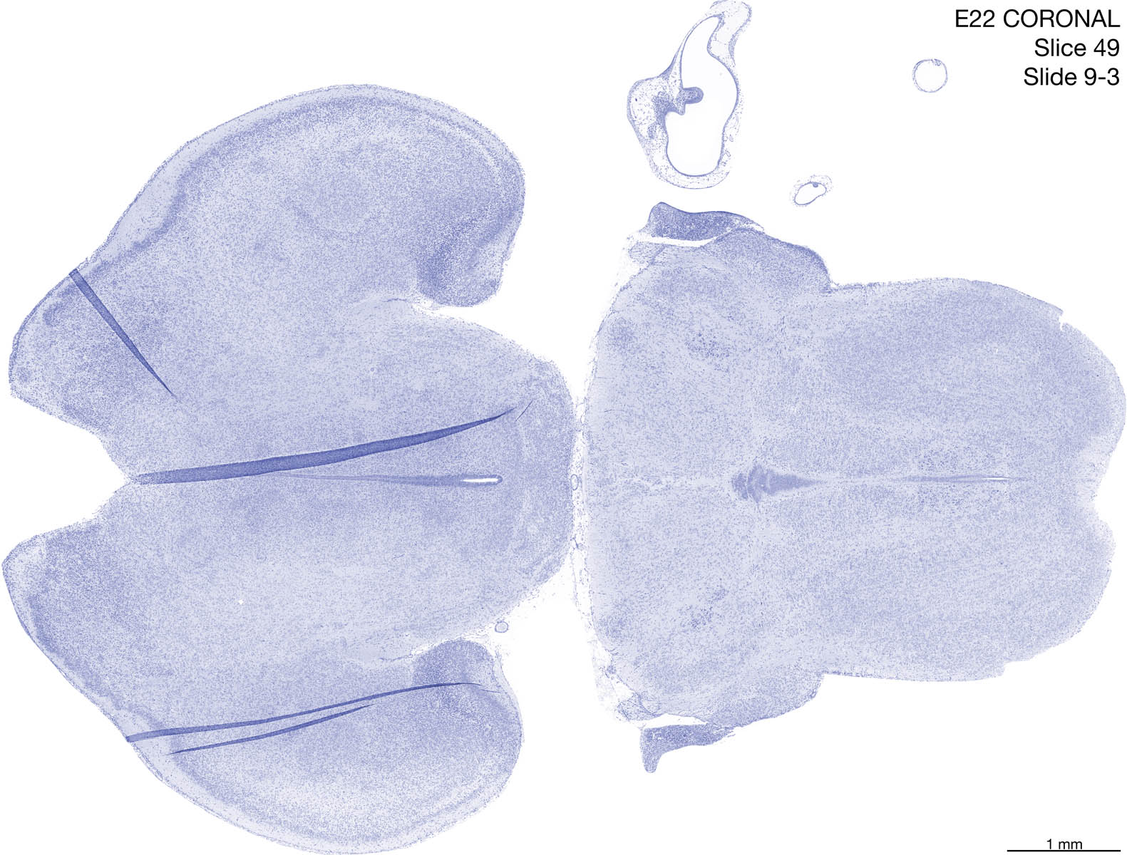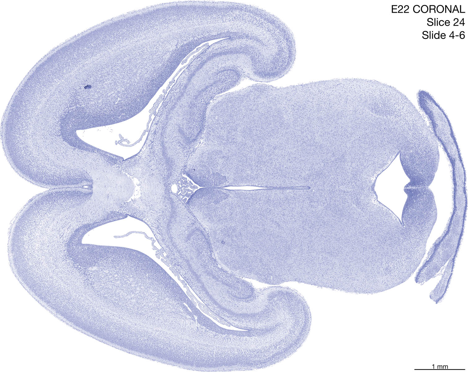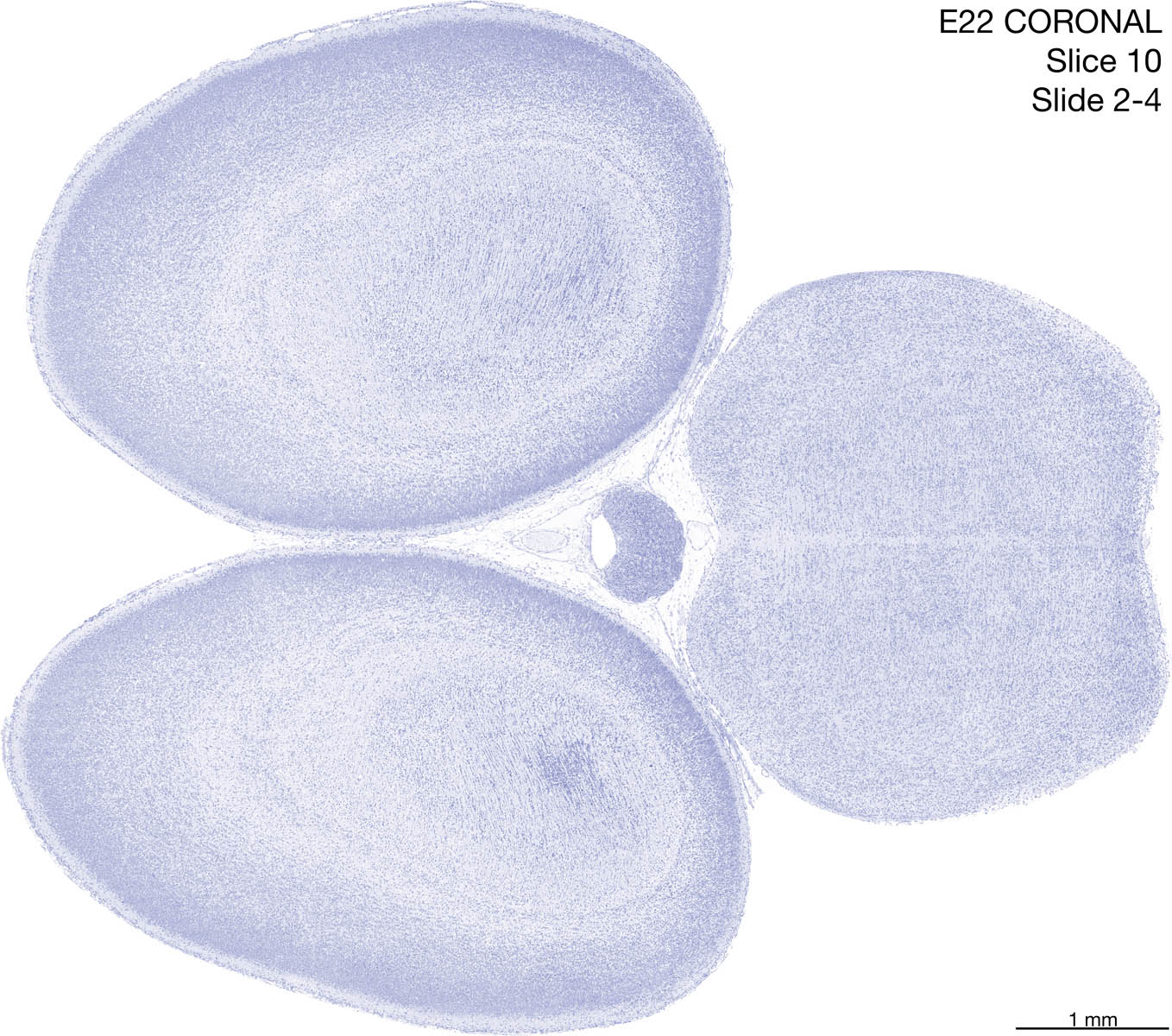 This page contains jpg files of ALL SLICES (each 3µm thick) that were scanned of the E22 horizontally-cut specimen. My mistake!!! all of the images are incorrectly labeled as E22 Coronal rather than E22 Horizontal. I did not notice this until after all files were uploaded. It will take days to correct this error, so please just use the images as is. Maybe I will find time later to fix them all. Shirley A. Bayer, June 9, 2015